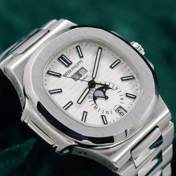 It occupies an extraordinary position in the watch marketplace as the only annual calendar Nautilus ever produced in stainless steel with a white dial. The white dial variant is particularly scarce compared to its blue and black counterparts, making it highly coveted among collectors seeking differentiation.