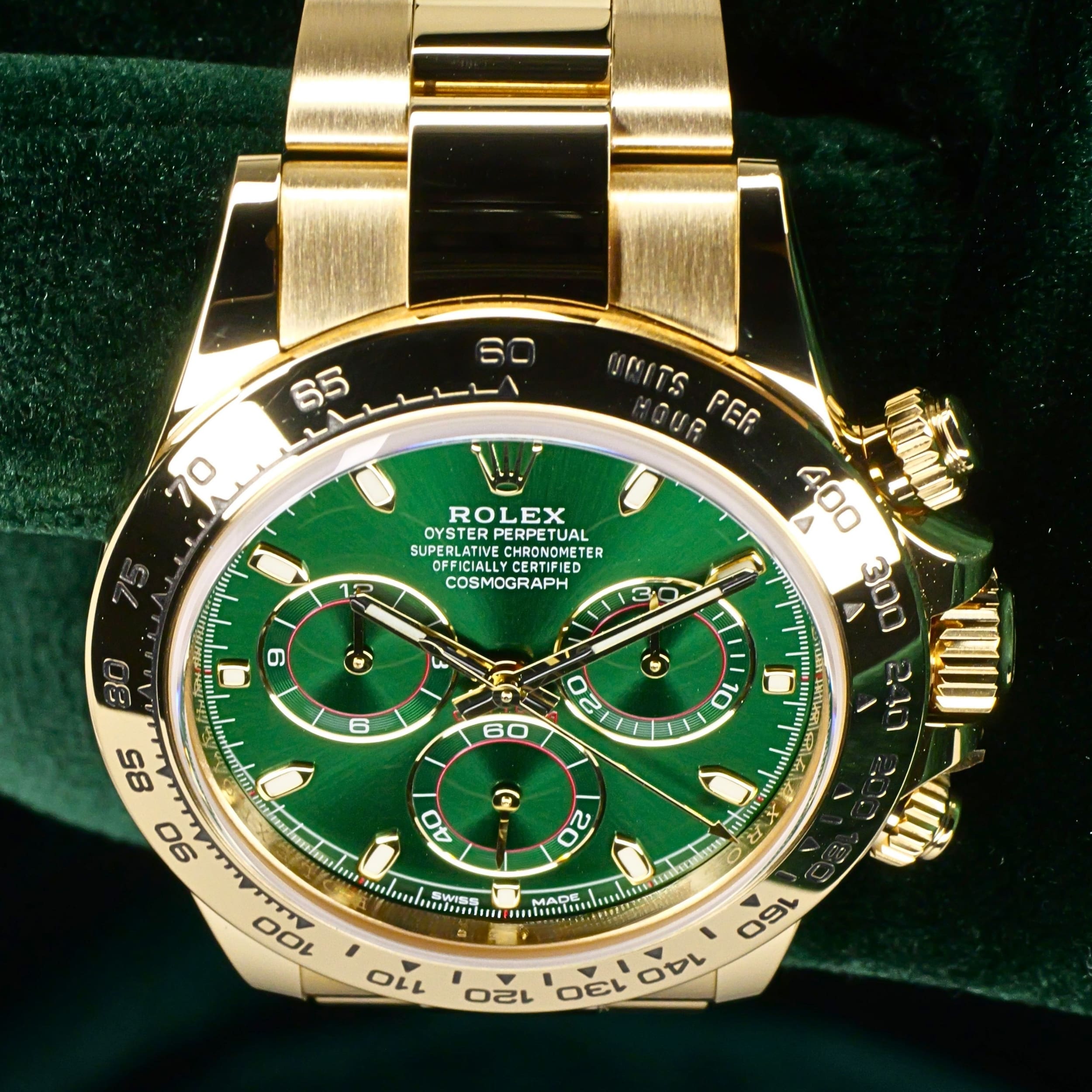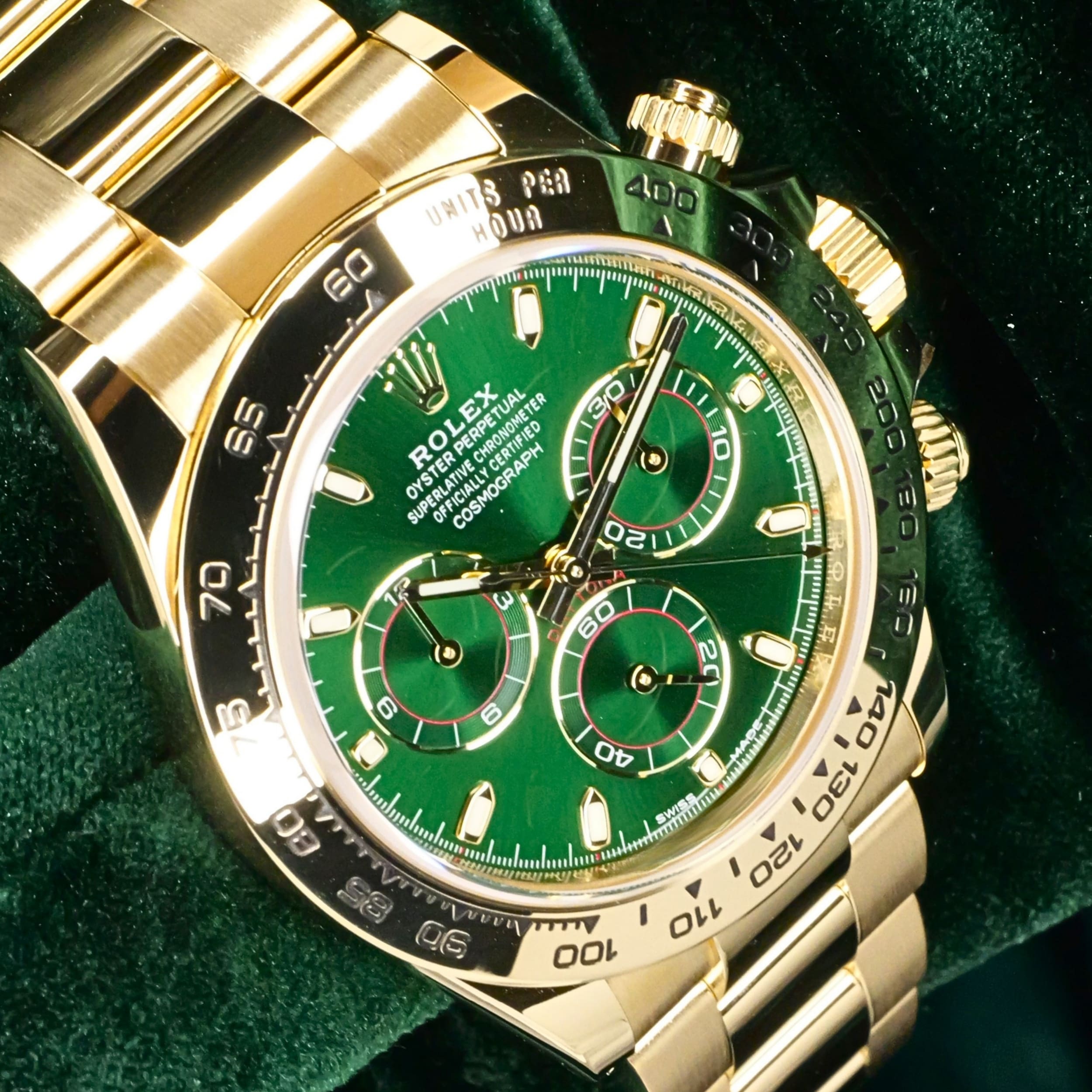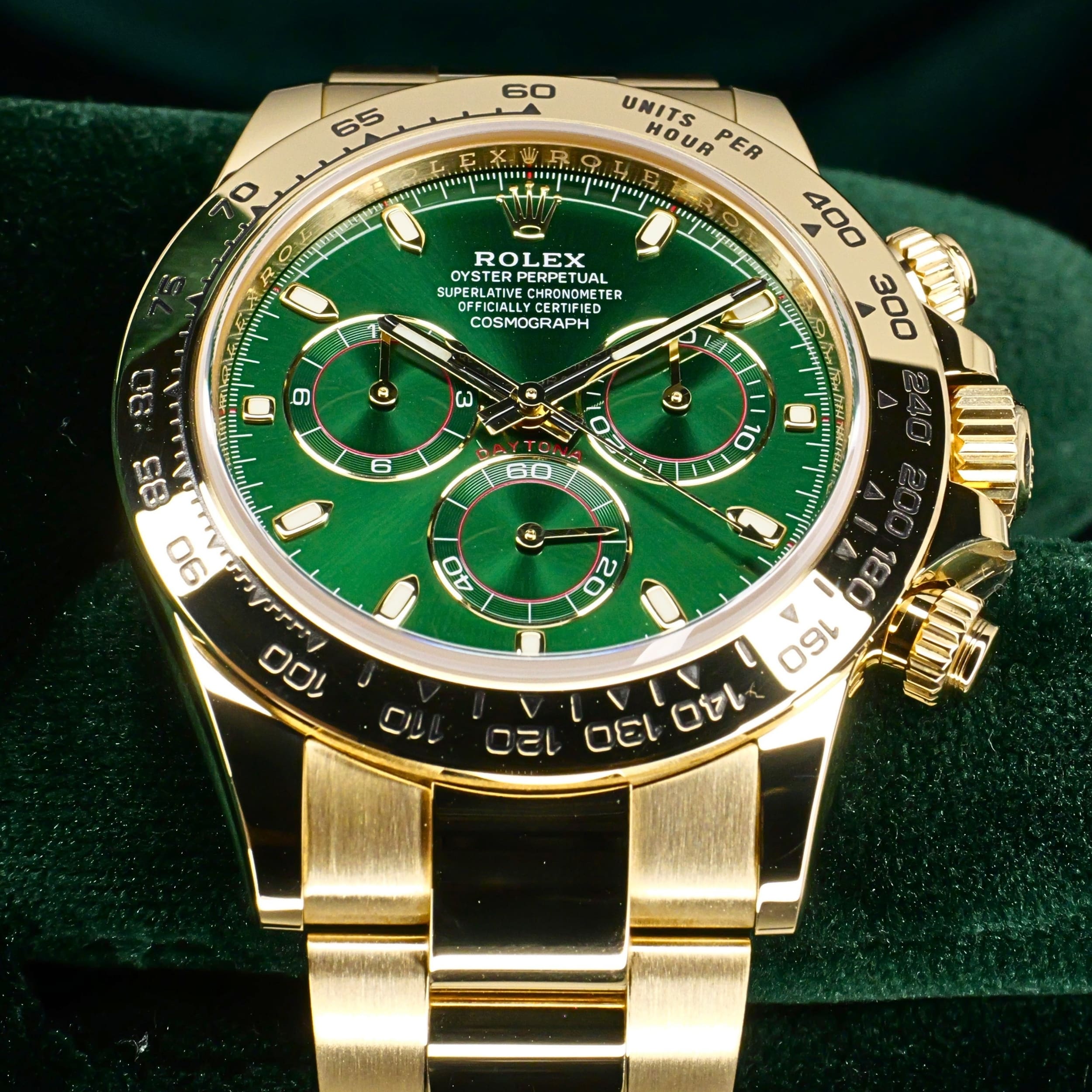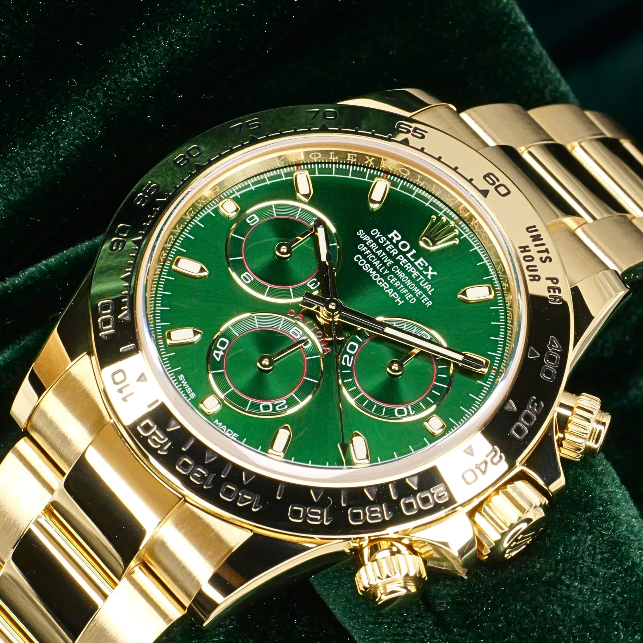 Presents itself in mint condition with little to no signs of wear. Features a lush green sunburst dial that sparkles with emerald depth, and depending on the angle of the light, it changes from bright lime to deep forest green. Solid 18K yellow gold case contrasts satin-brushed flanks with mirror-polished bezel and lugs, which make light play across every wrist movement. Matching green subdials glow with chromatic harmony against the main dial, their golden surrounds make the all-vert Rolex look even more hypnotic.