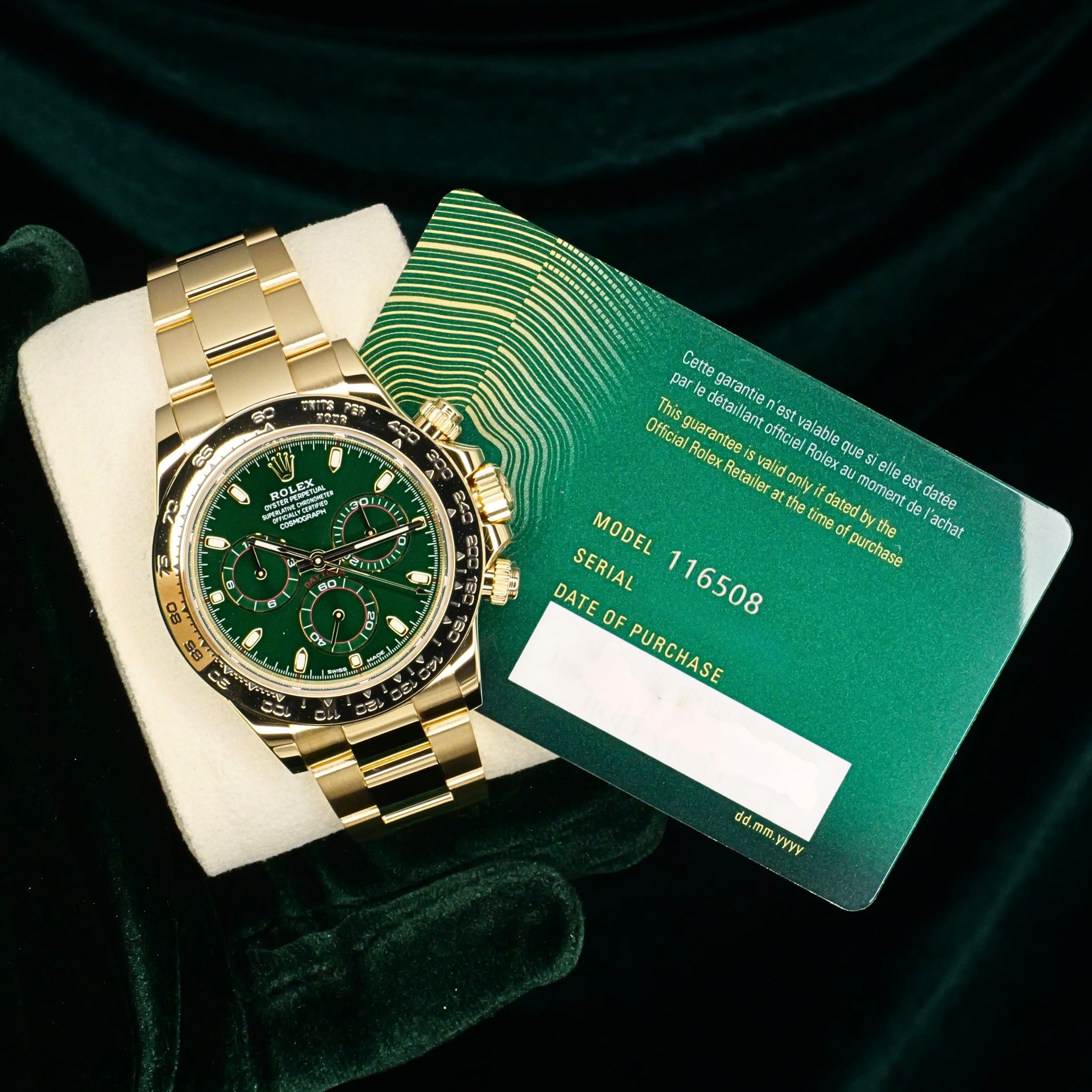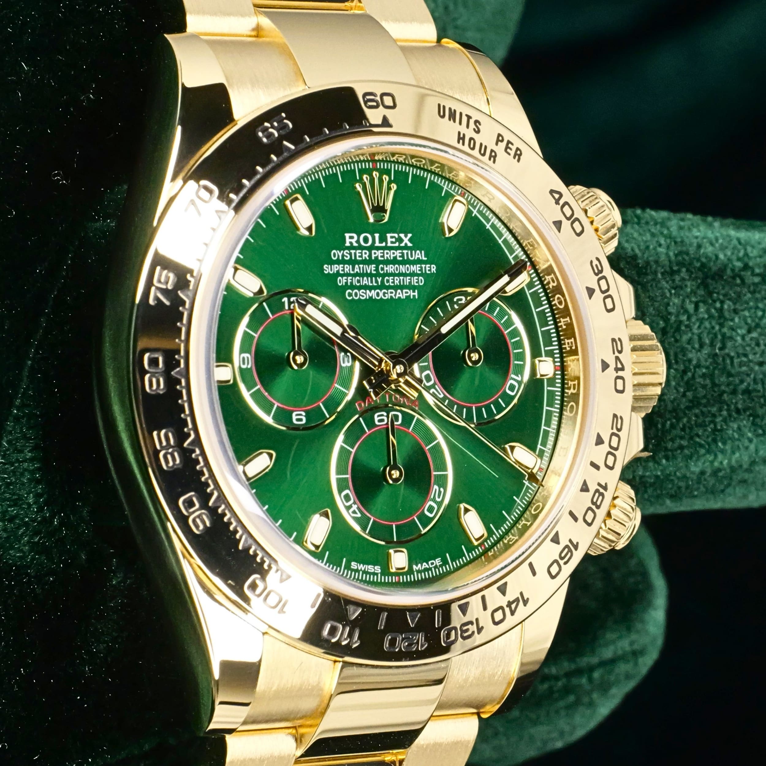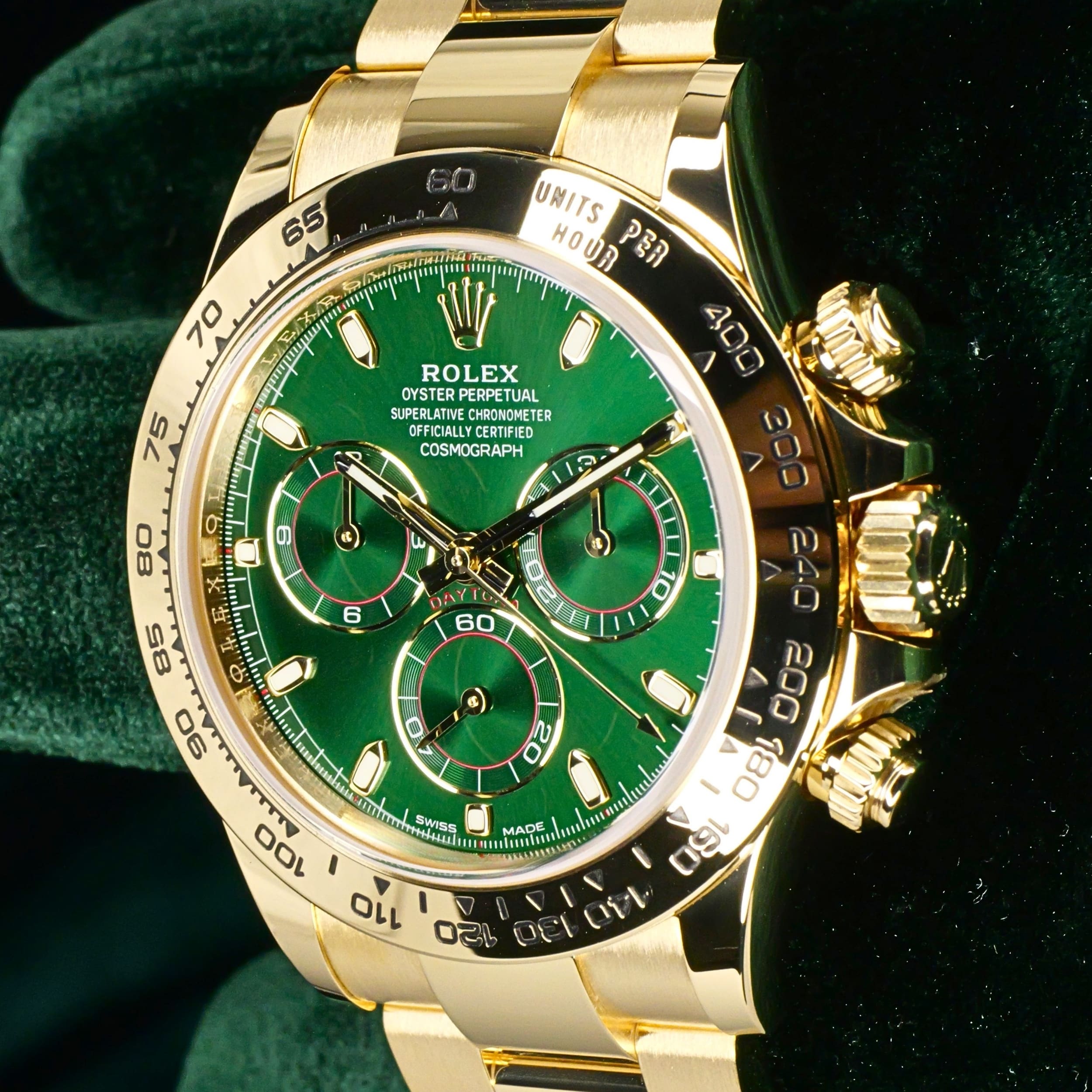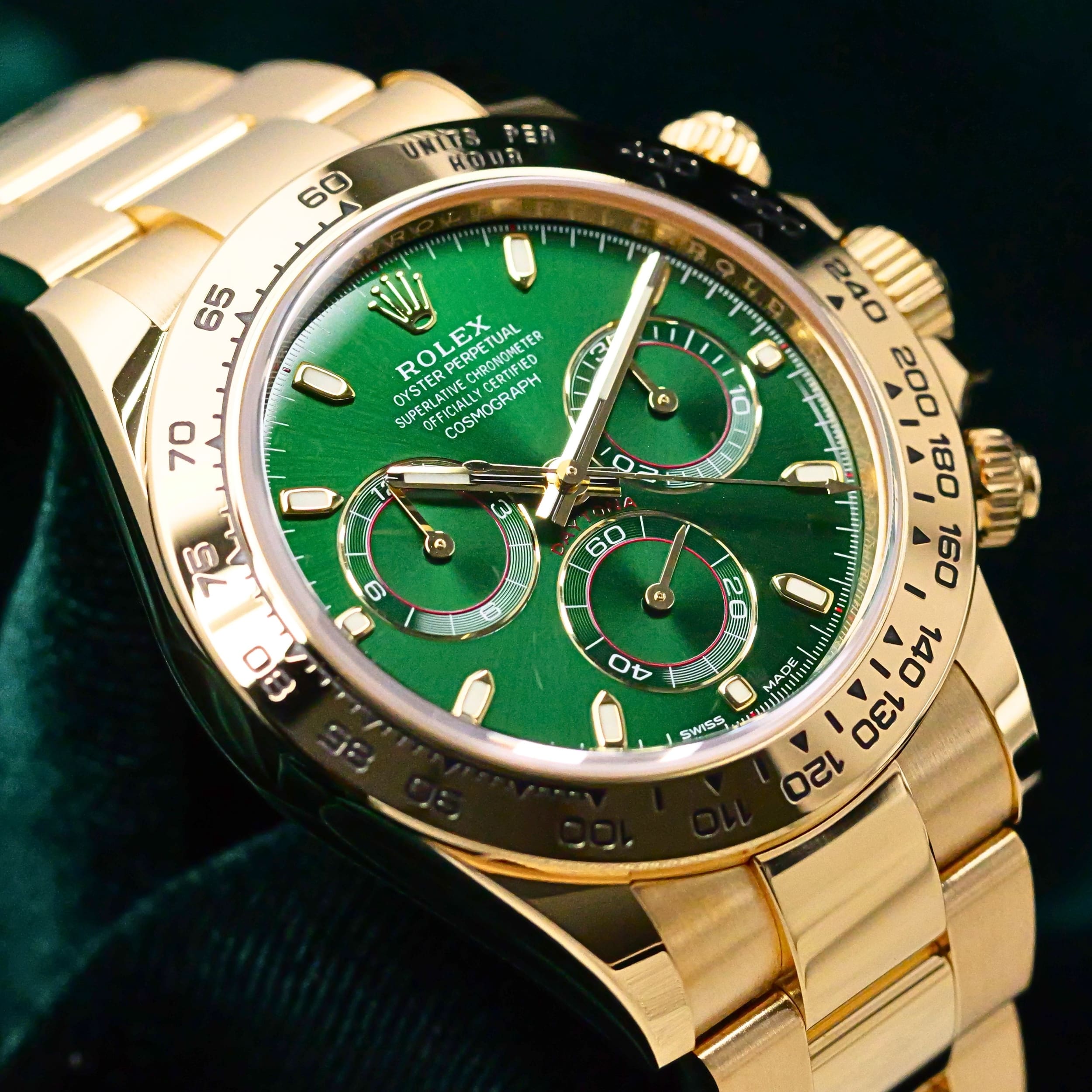 Presents itself in mint condition with little to no signs of wear. Features a lush green sunburst dial that sparkles with emerald depth, and depending on the angle of the light, it changes from bright lime to deep forest green. Solid 18K yellow gold case contrasts satin-brushed flanks with mirror-polished bezel and lugs, which make light play across every wrist movement. Matching green subdials glow with chromatic harmony against the main dial, their golden surrounds make the all-vert Rolex look even more hypnotic.