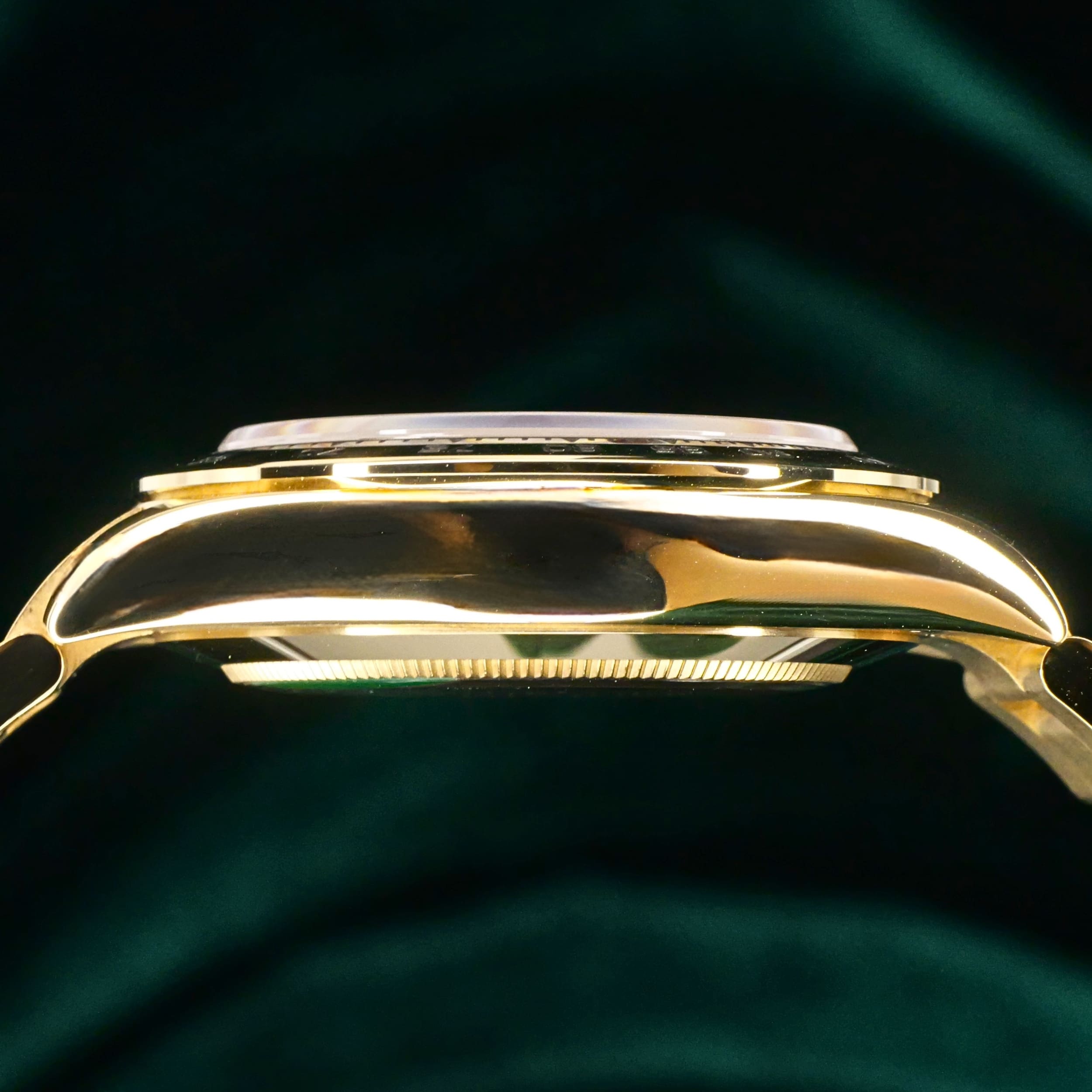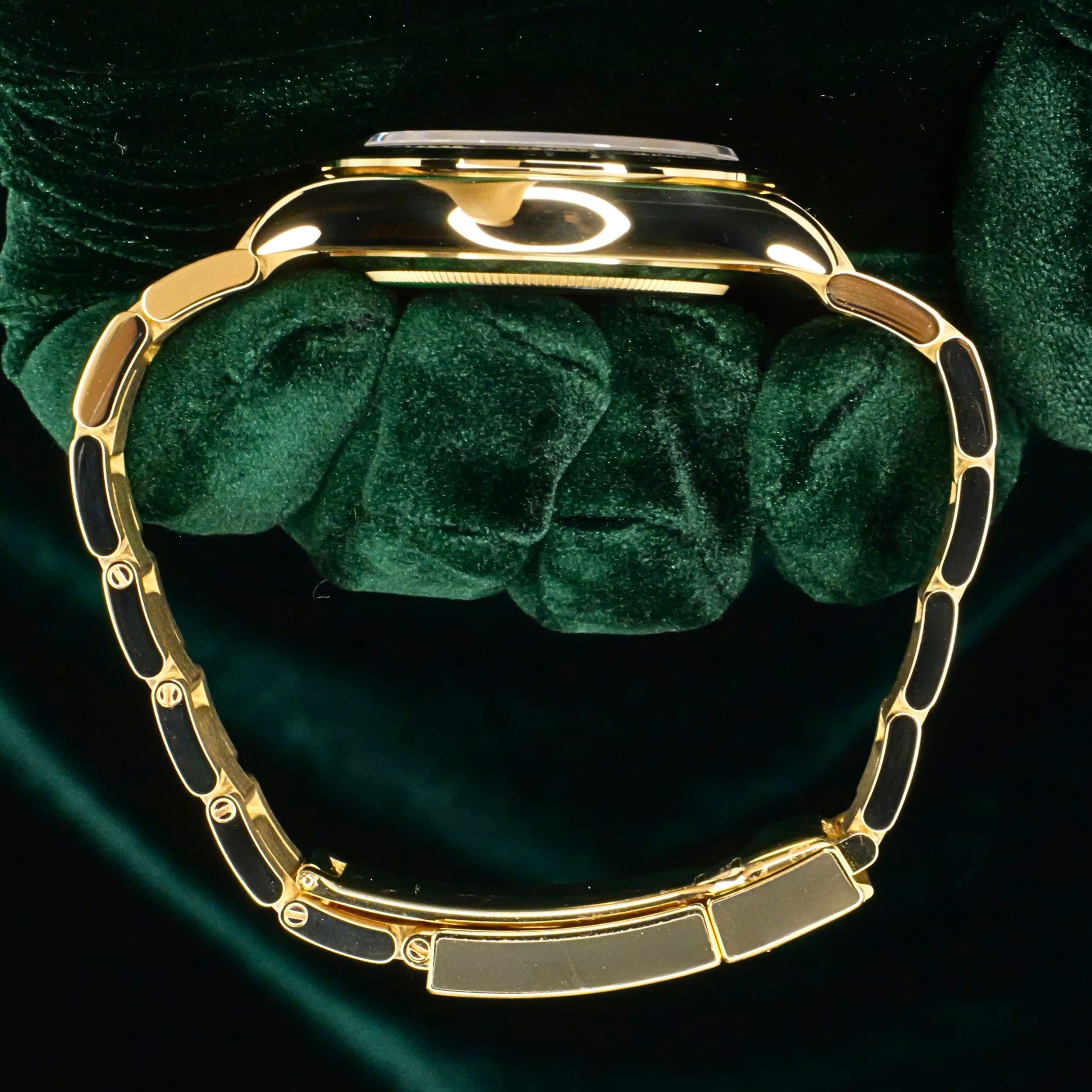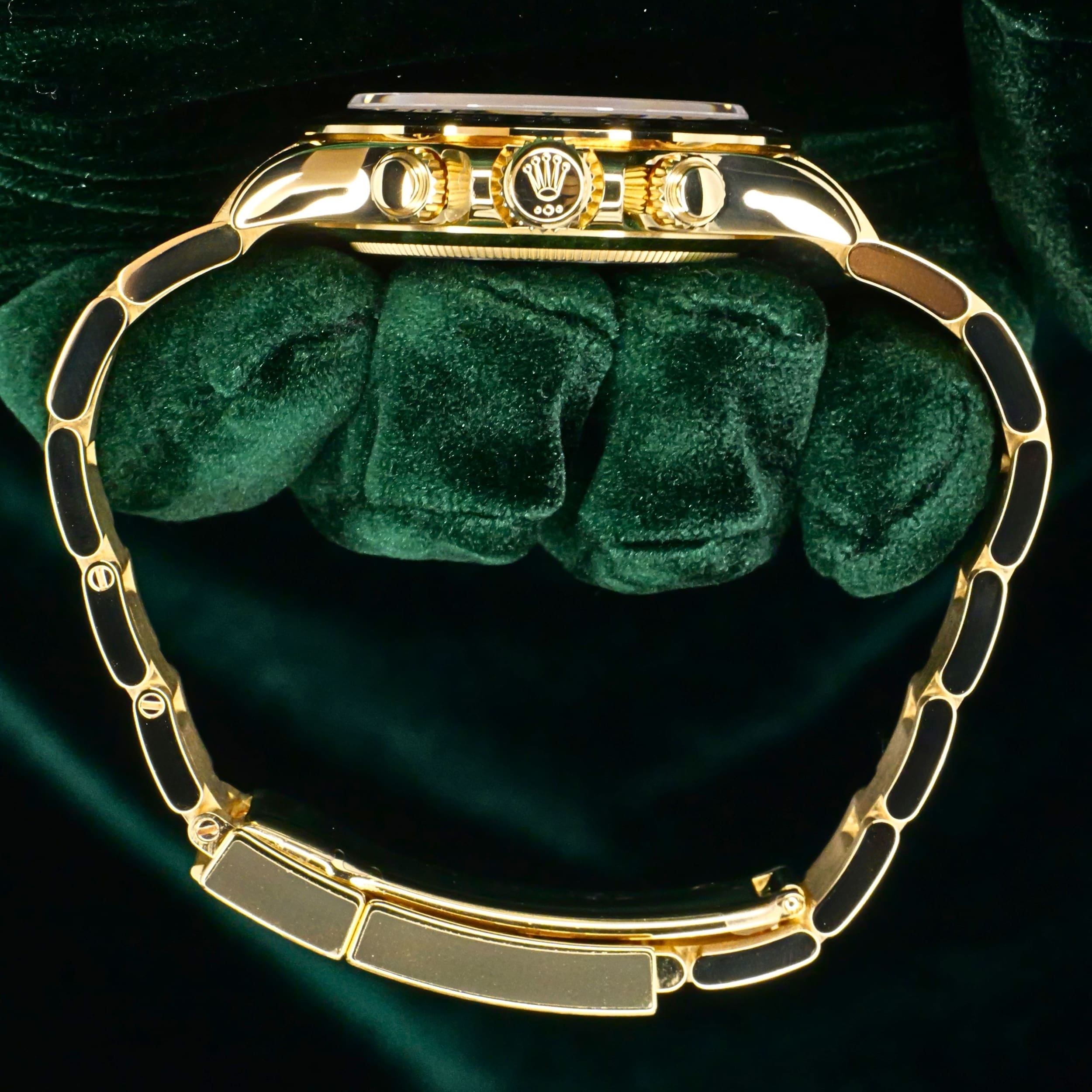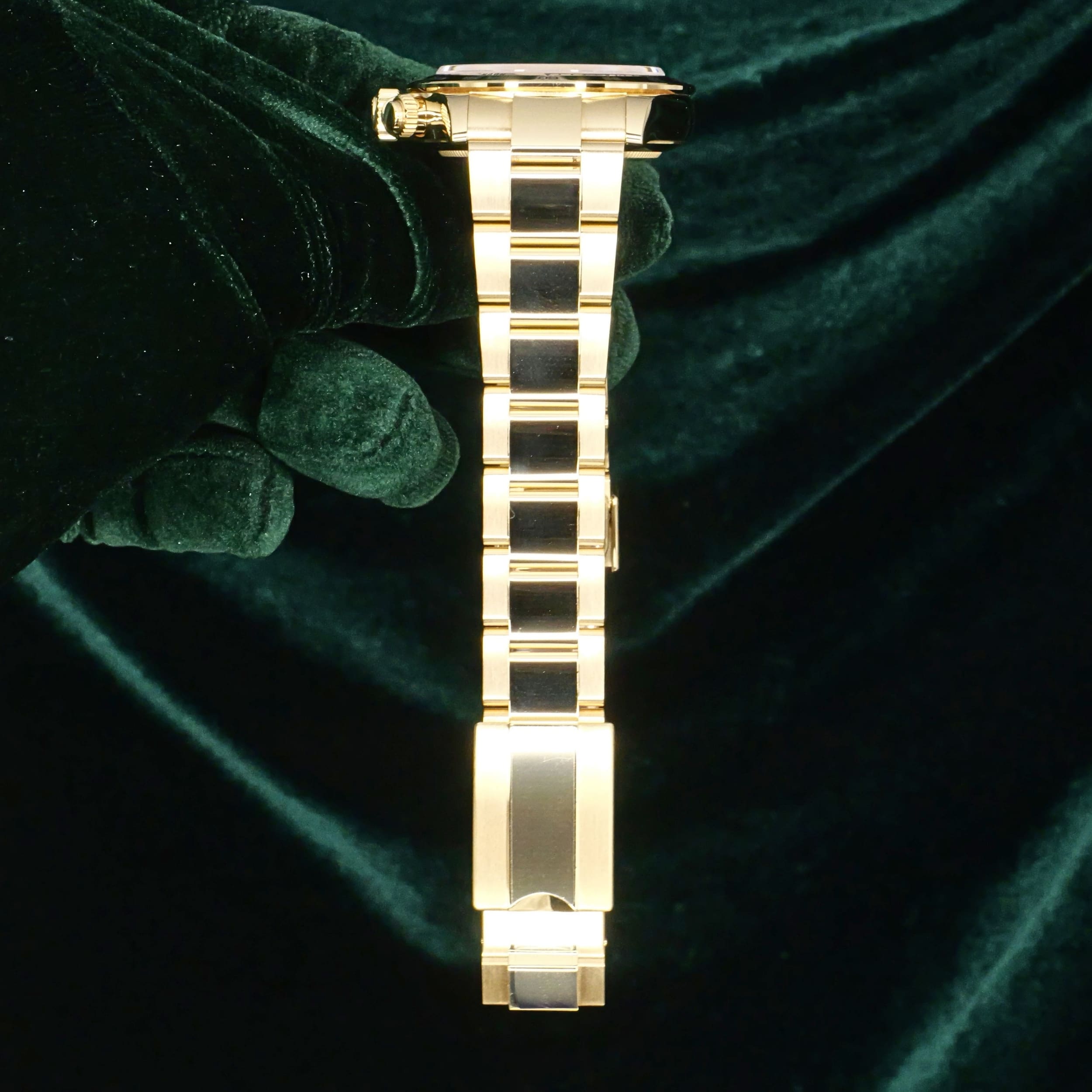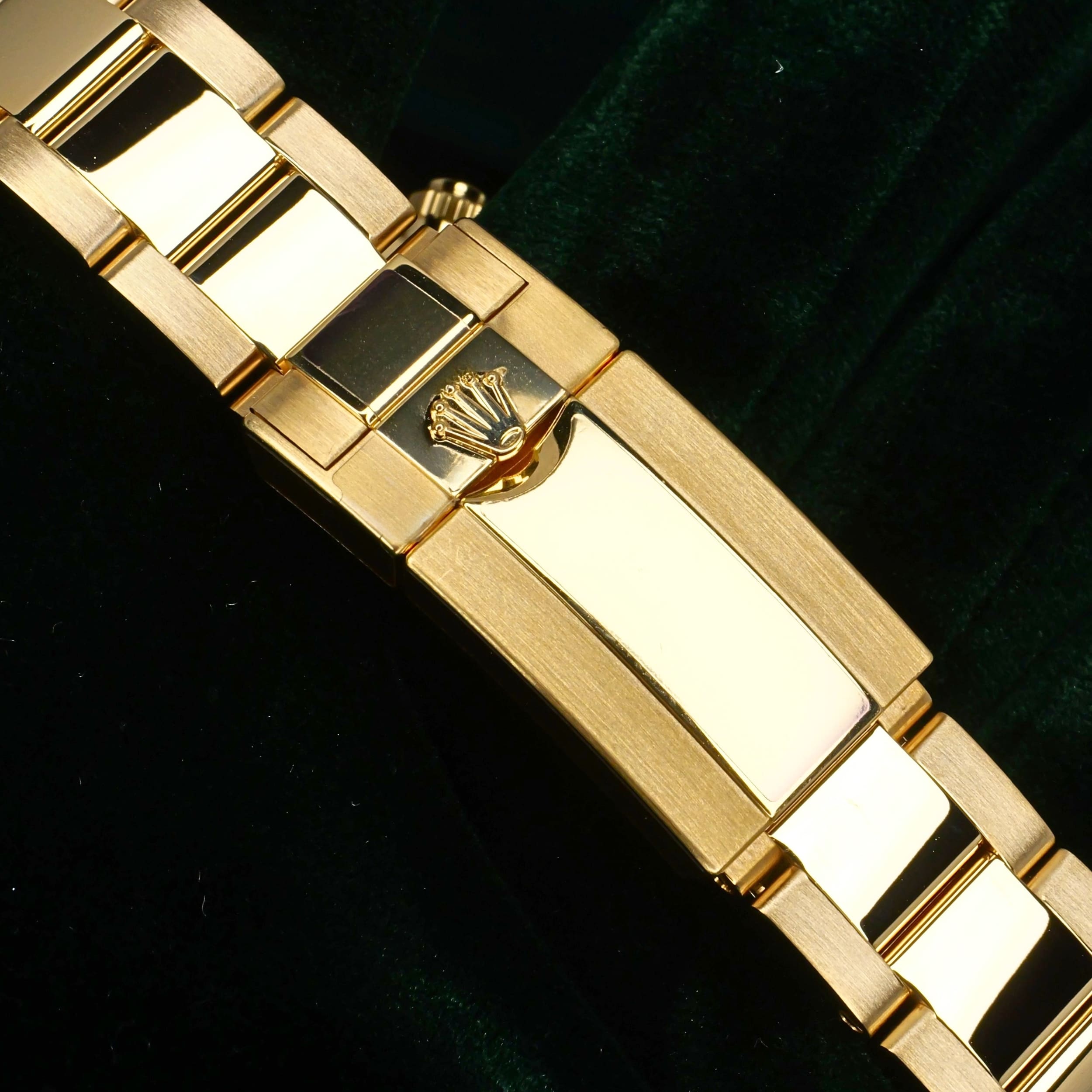 Presents itself in mint condition with little to no signs of wear. Features a lush green sunburst dial that sparkles with emerald depth, and depending on the angle of the light, it changes from bright lime to deep forest green. Solid 18K yellow gold case contrasts satin-brushed flanks with mirror-polished bezel and lugs, which make light play across every wrist movement. Matching green subdials glow with chromatic harmony against the main dial, their golden surrounds make the all-vert Rolex look even more hypnotic.