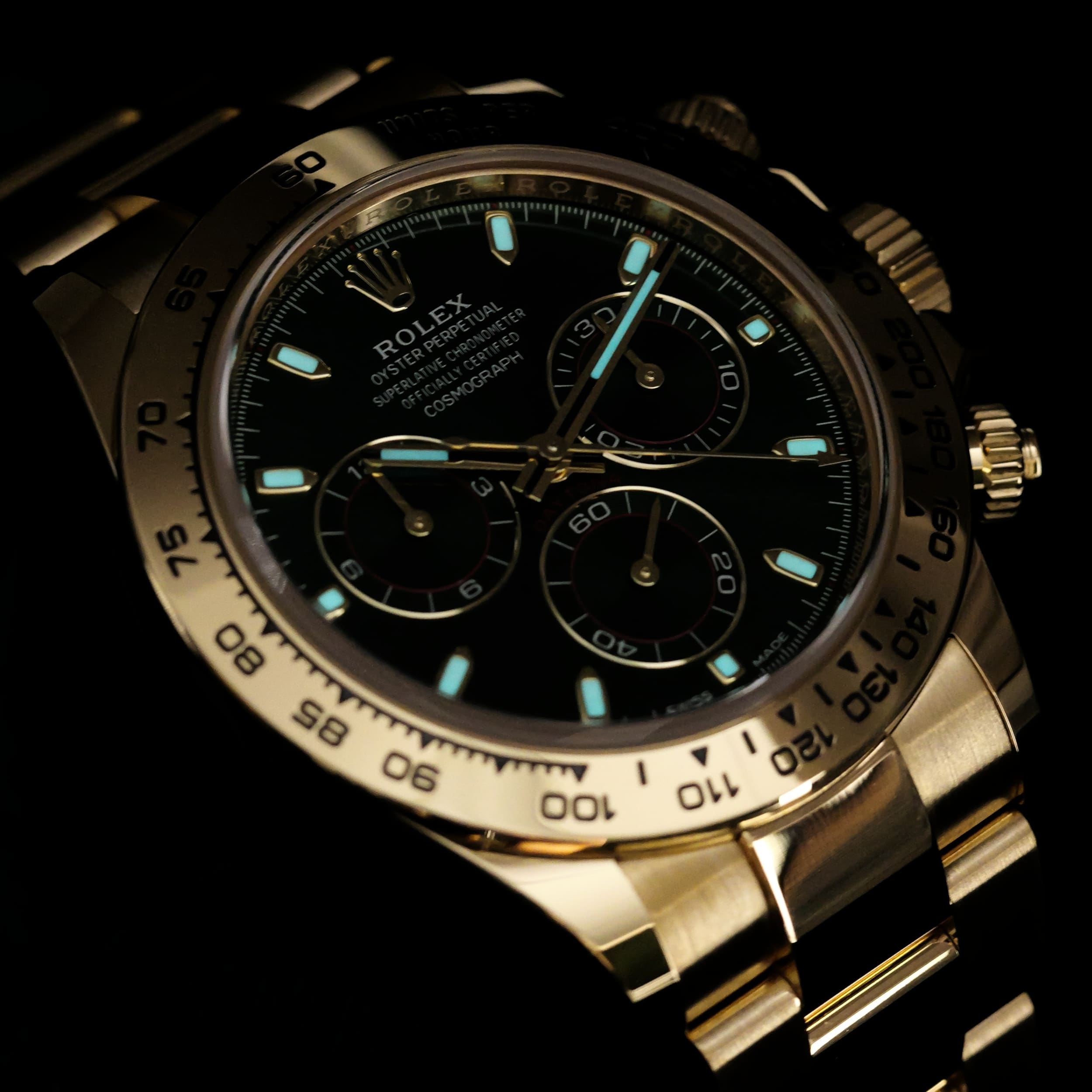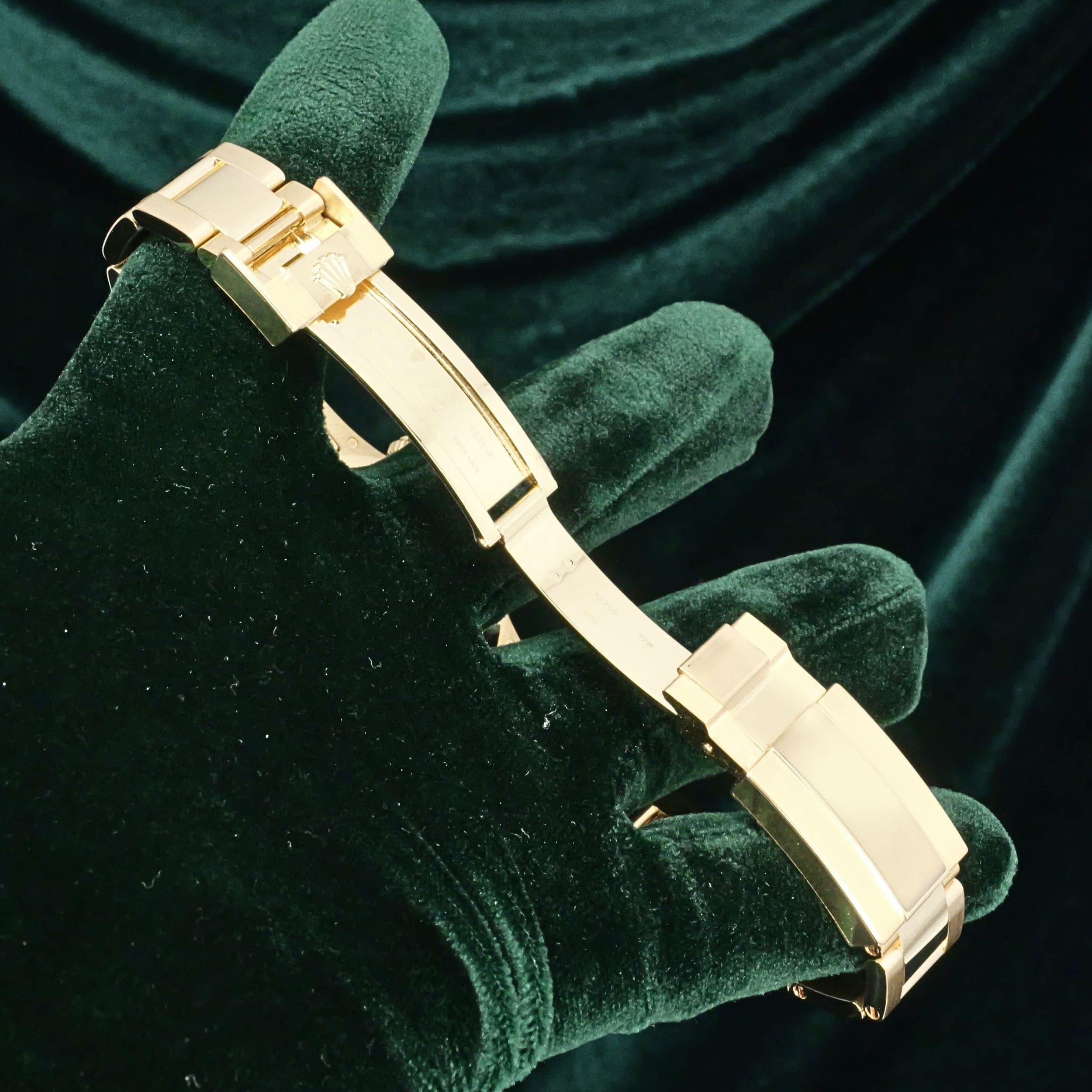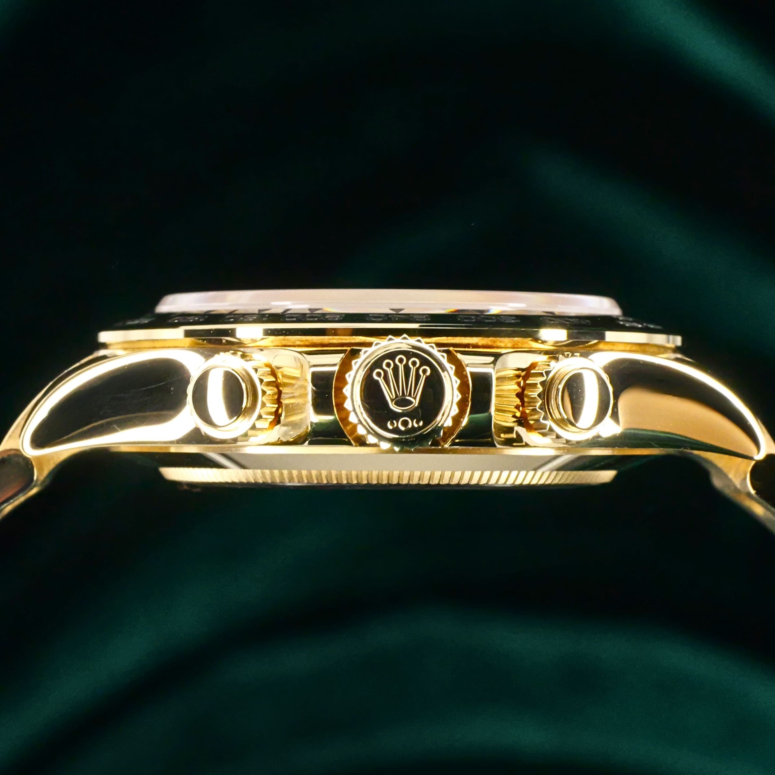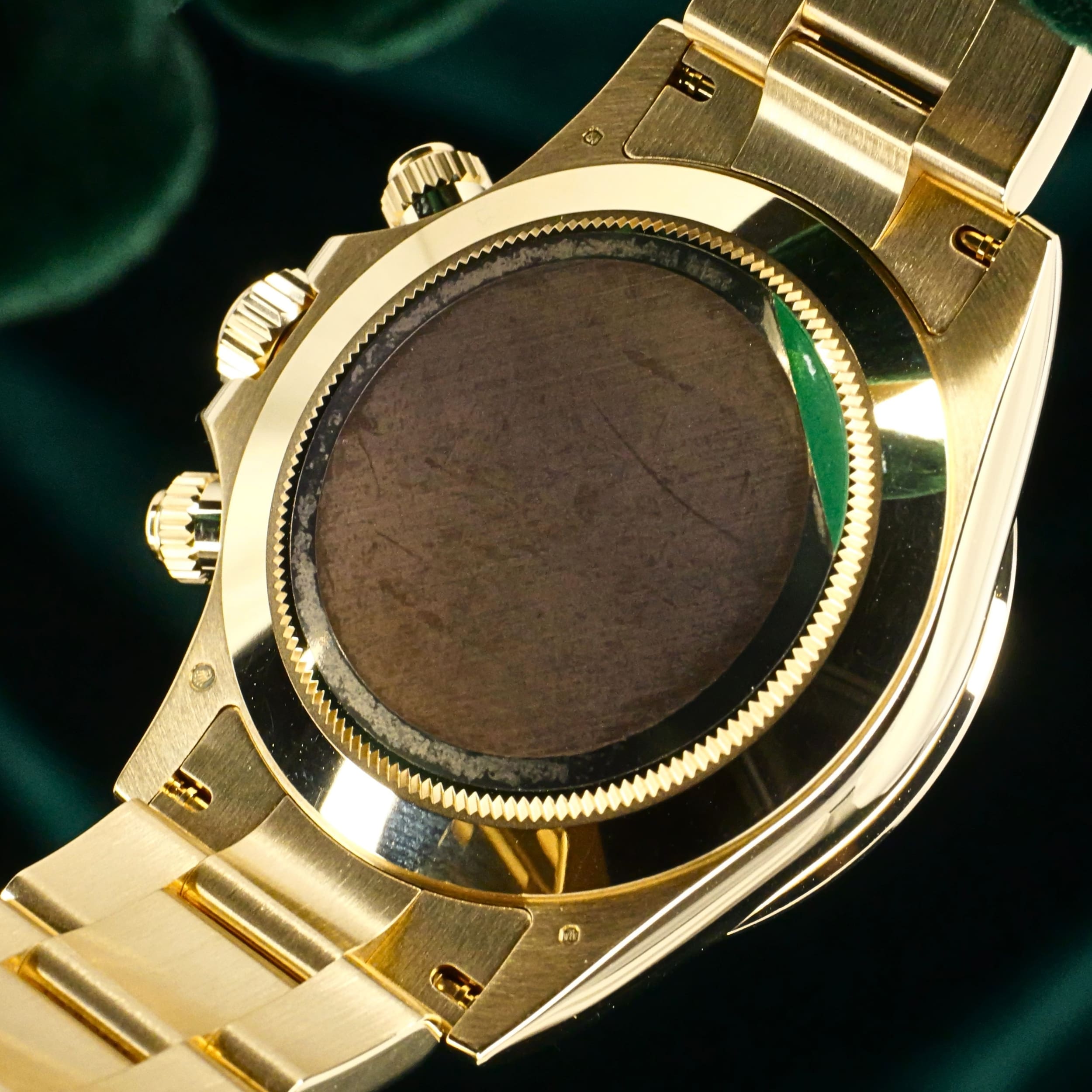 Presents itself in mint condition with little to no signs of wear. Features a lush green sunburst dial that sparkles with emerald depth, and depending on the angle of the light, it changes from bright lime to deep forest green. Solid 18K yellow gold case contrasts satin-brushed flanks with mirror-polished bezel and lugs, which make light play across every wrist movement. Matching green subdials glow with chromatic harmony against the main dial, their golden surrounds make the all-vert Rolex look even more hypnotic.