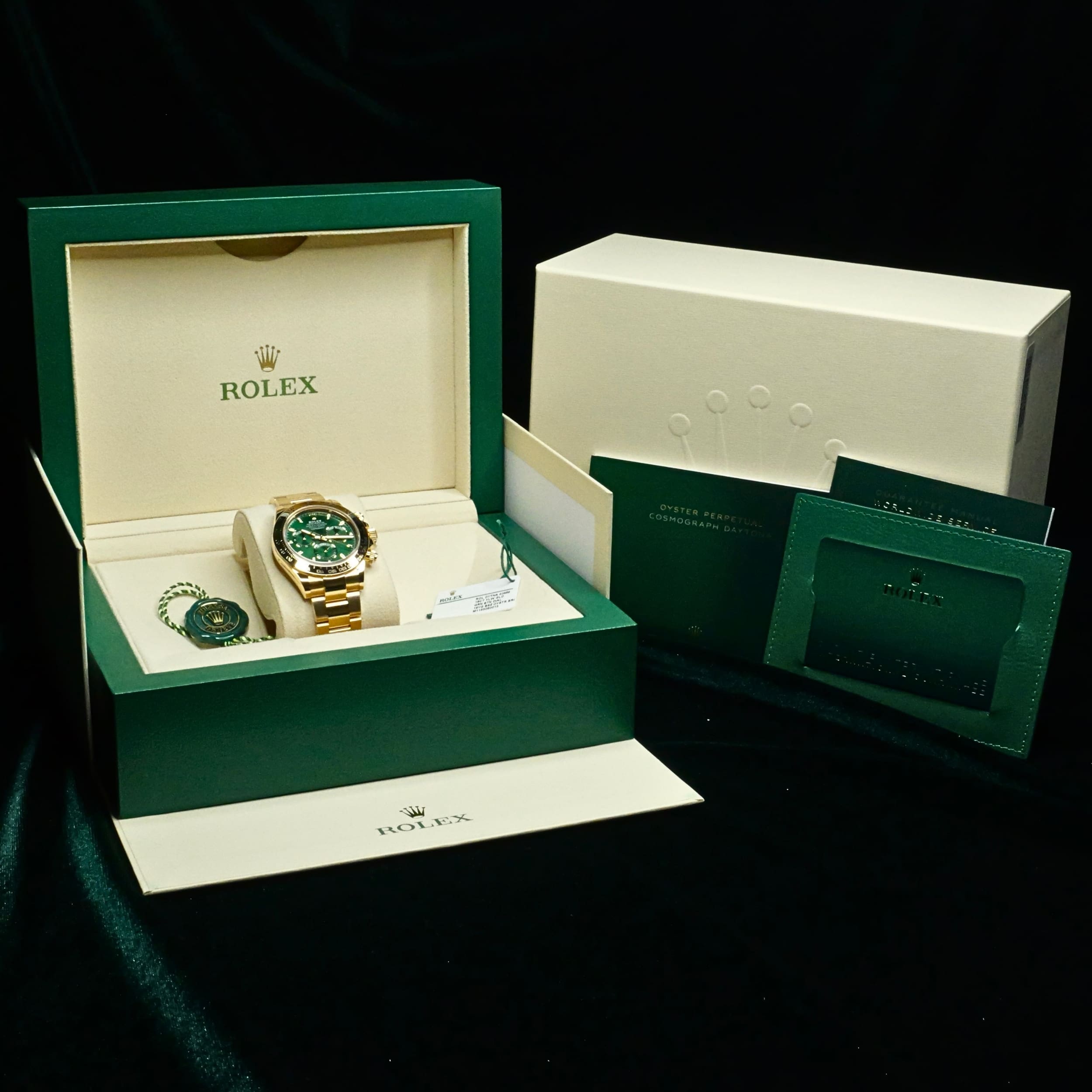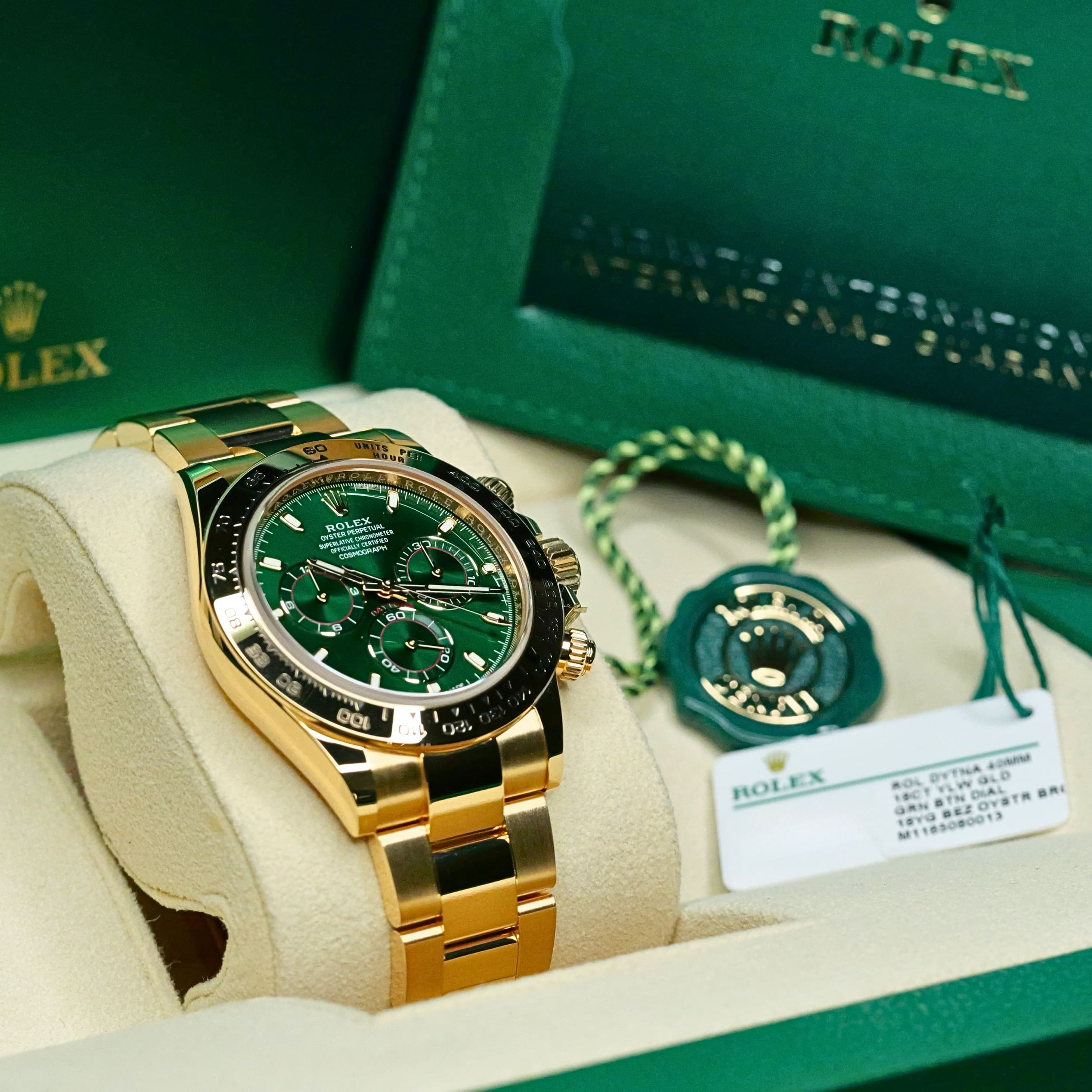 Comes as a full set, double-boxed with a watch pillow, Rolex guarantee card, warranty booklets, and green and white hang tags.