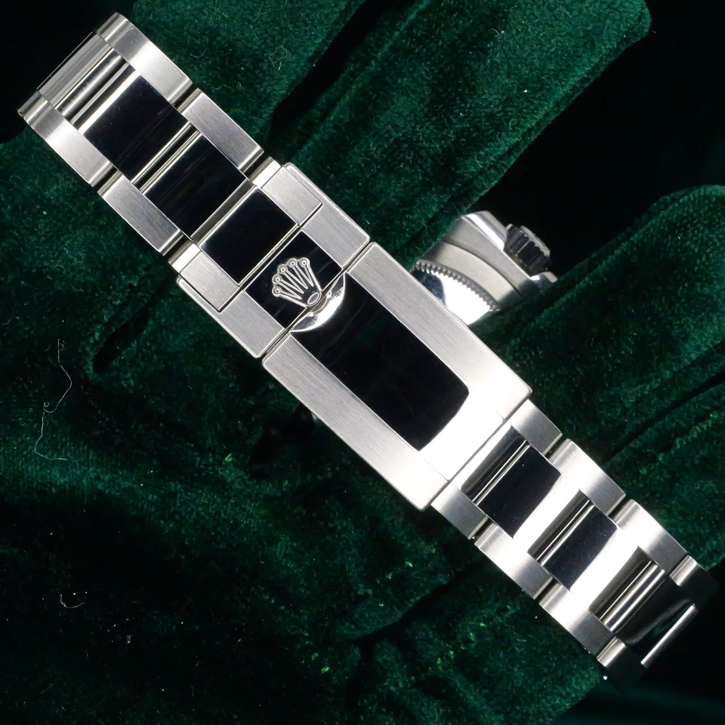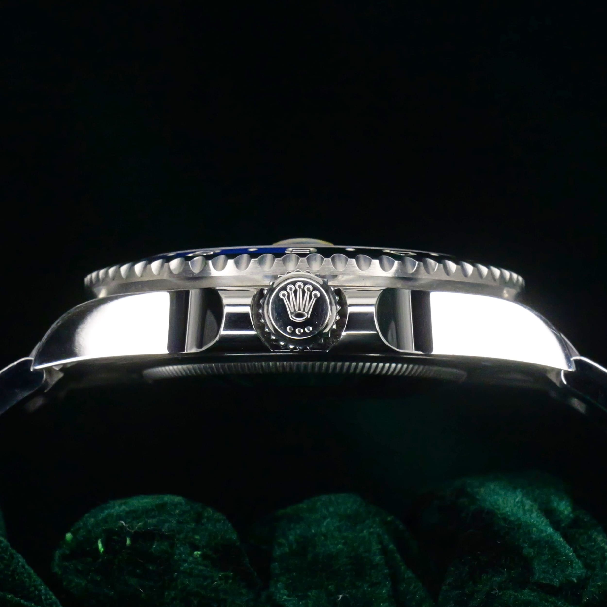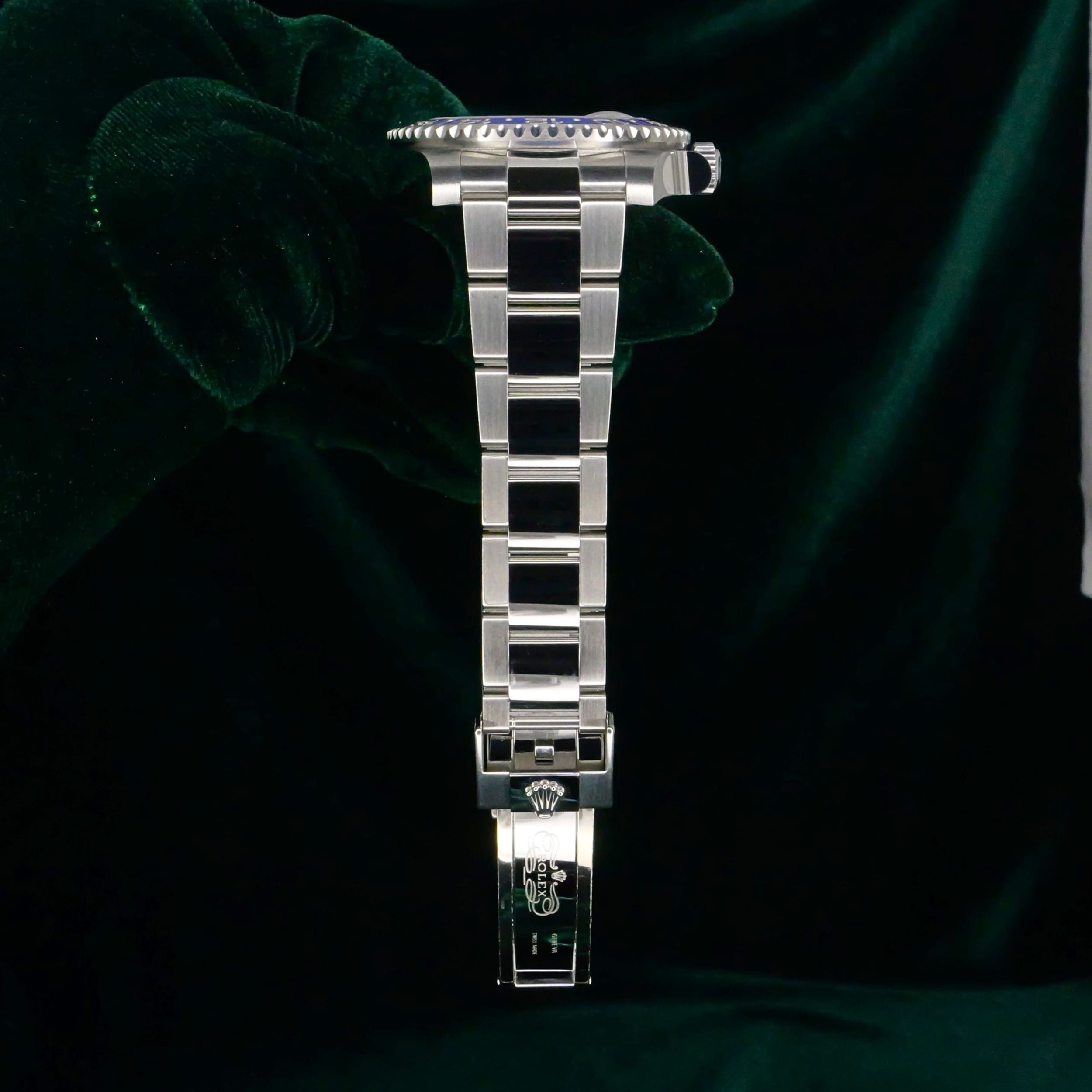 Presents itself in mint condition with little to no signs of wear. The black dial offers a deep, glossy surface that enhances the brightness of the white gold hour markers and Mercedes hands. The blue and black Cerachrom bezel displays a seamless transition between tones, shifting subtly under light while maintaining a crisp, polished finish. The stainless steel case and Oyster bracelet showcase a dynamic mix of brushed and high-polish surfaces, giving the watch a durable presence on the wrist.