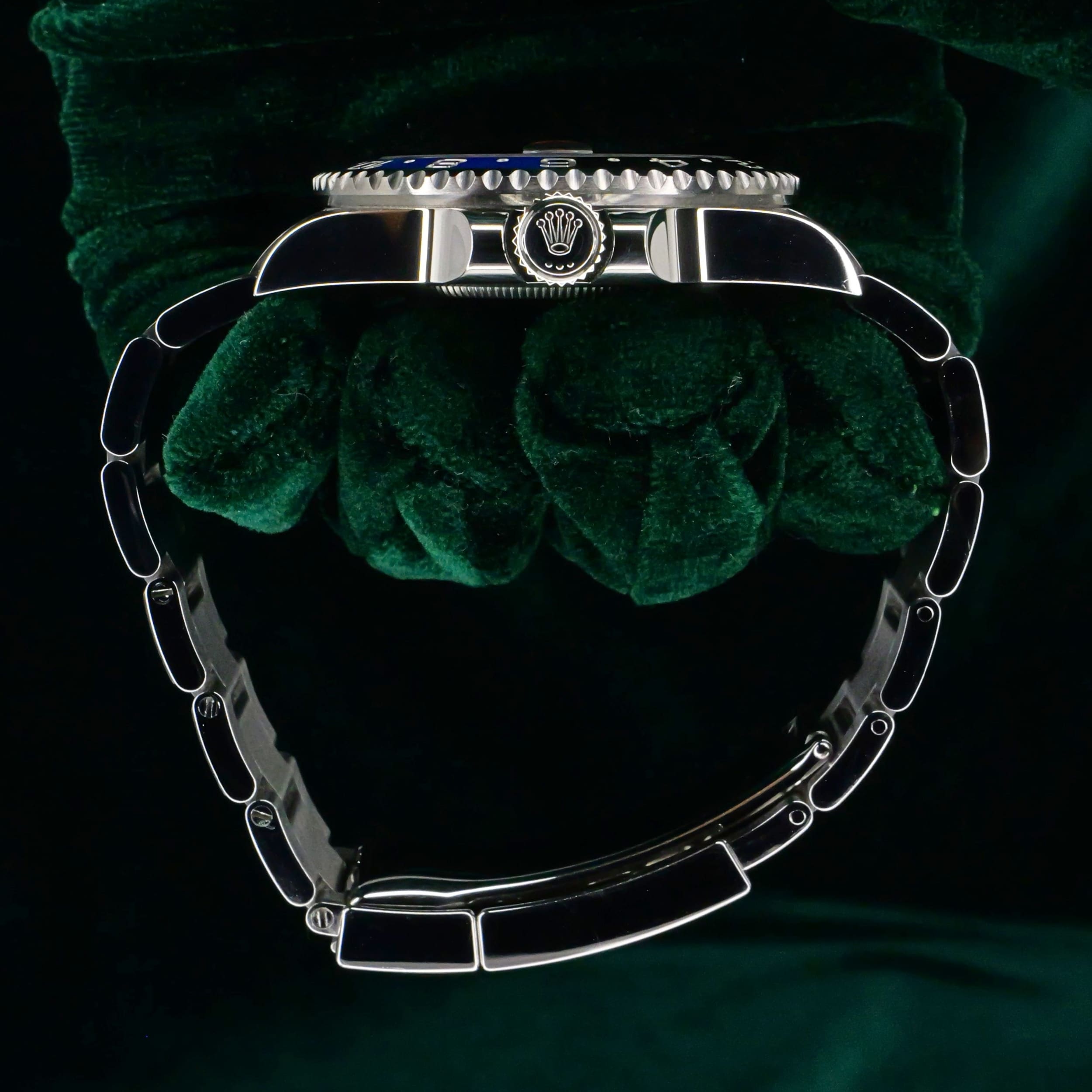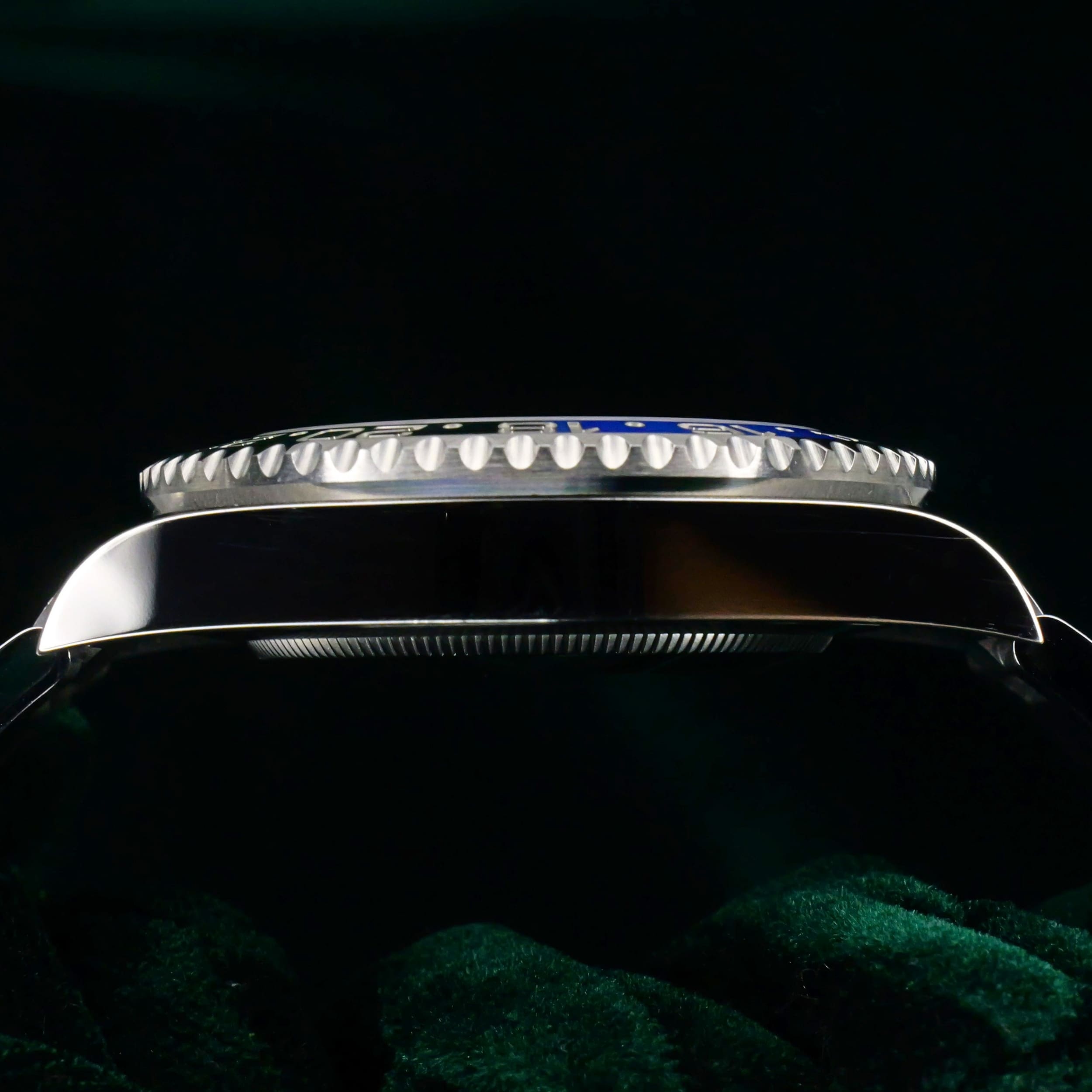 Recognized as the iconic “Batman,” this GMT-Master II stands out with its bold blue and black ceramic bezel, reflecting the dark, stealth-inspired aesthetic behind its nickname. Designed with both form and function in mind, it pairs a deep black dial with a two-tone bezel to distinguish day and night across multiple time zones, making it a strong choice for those who value both presence and practicality.