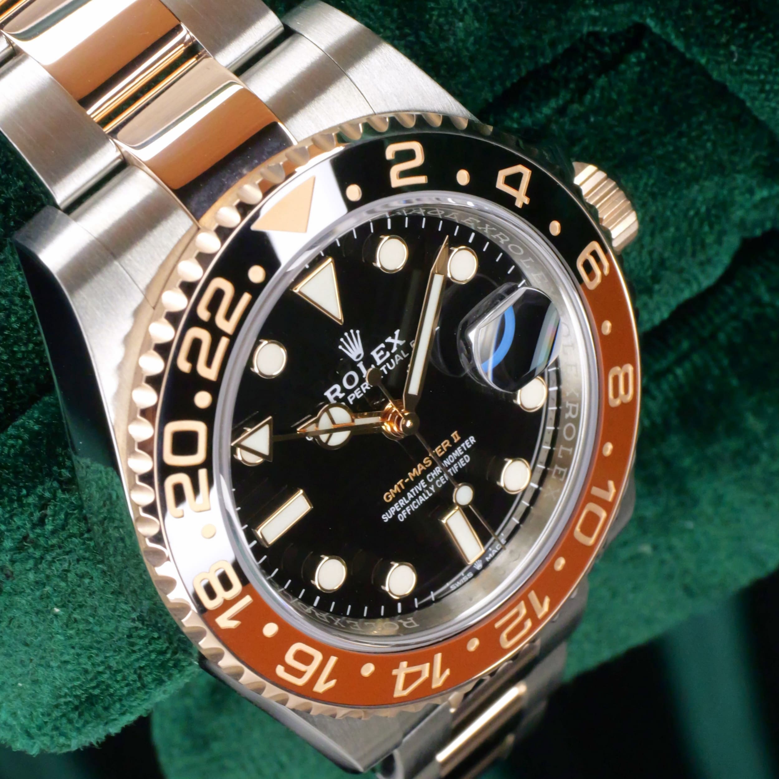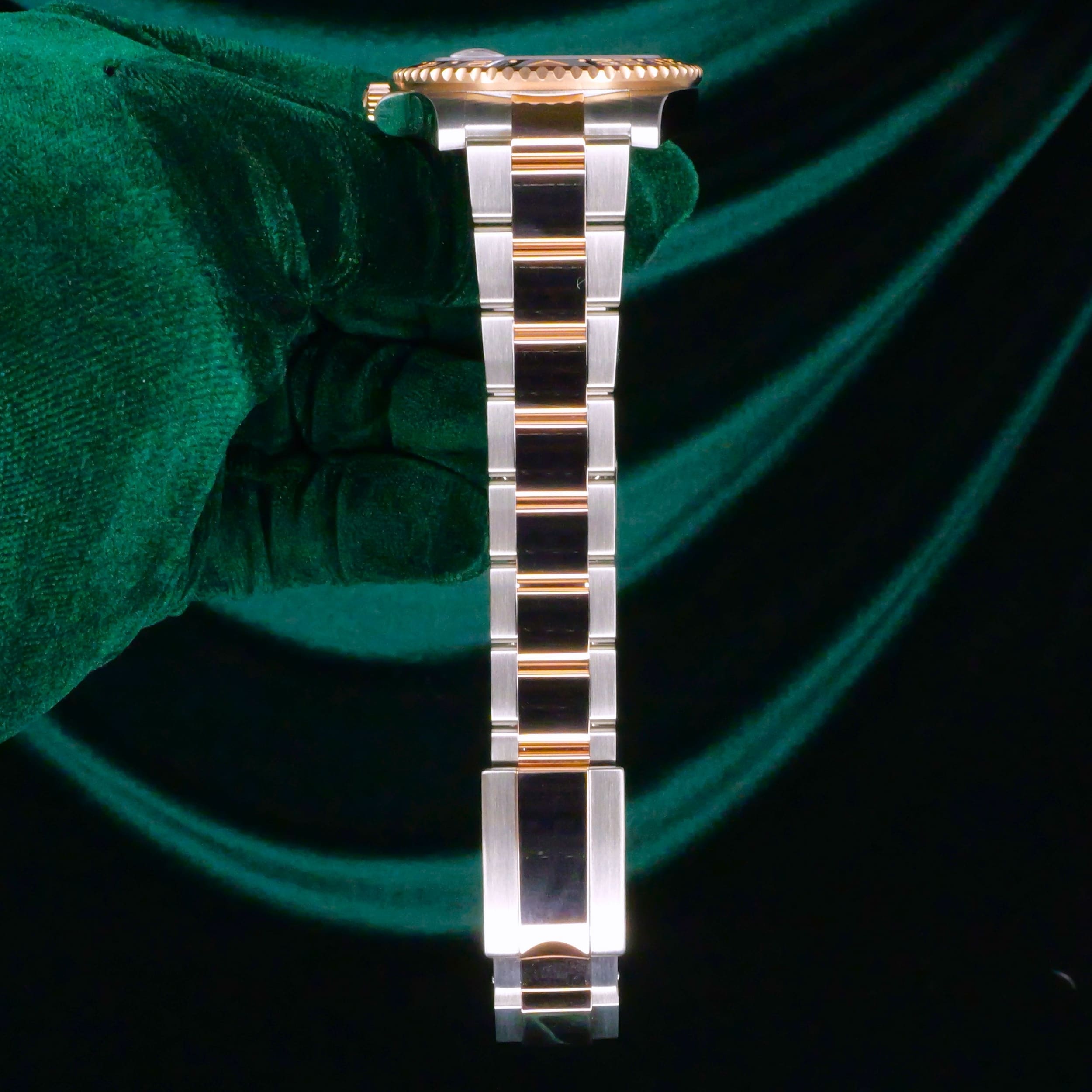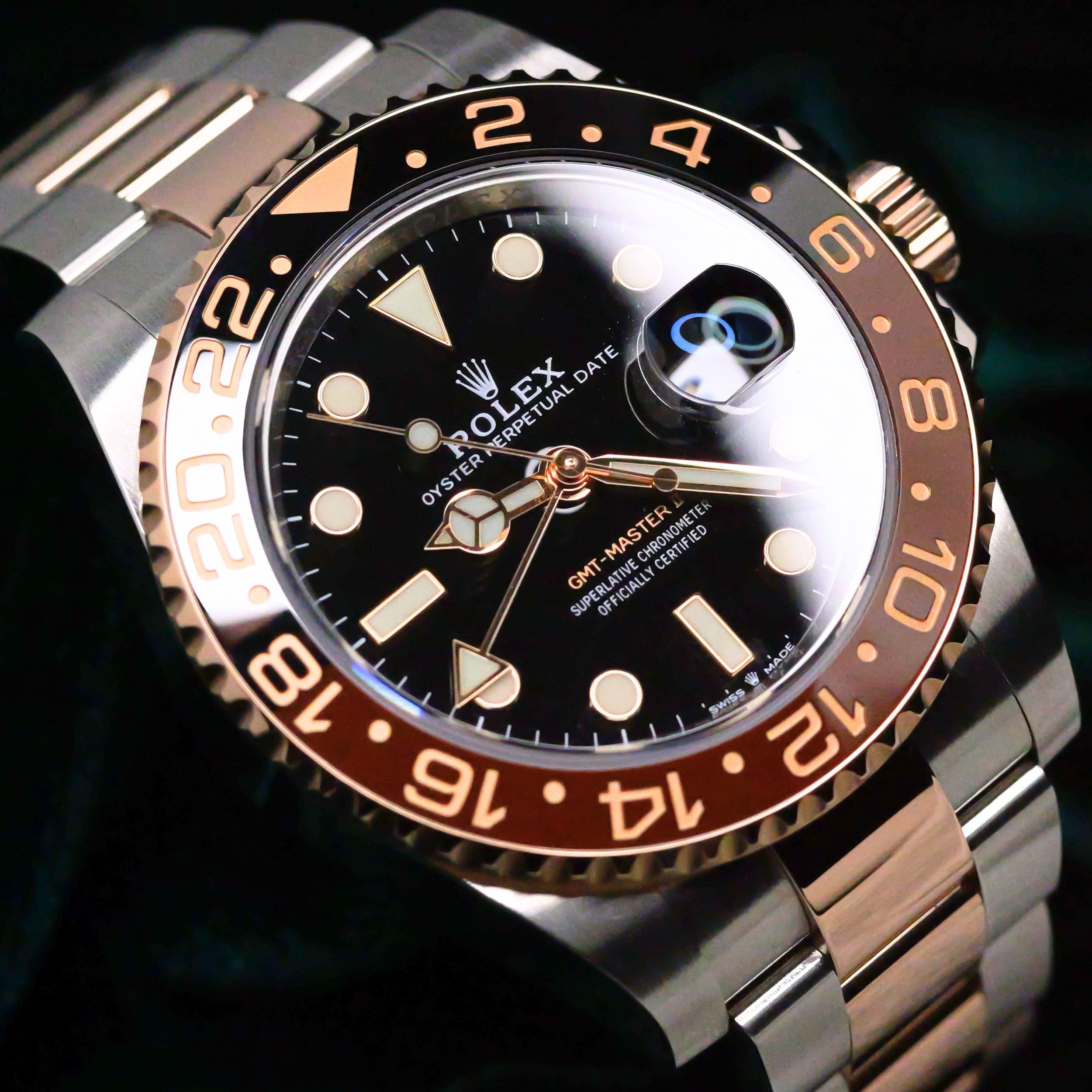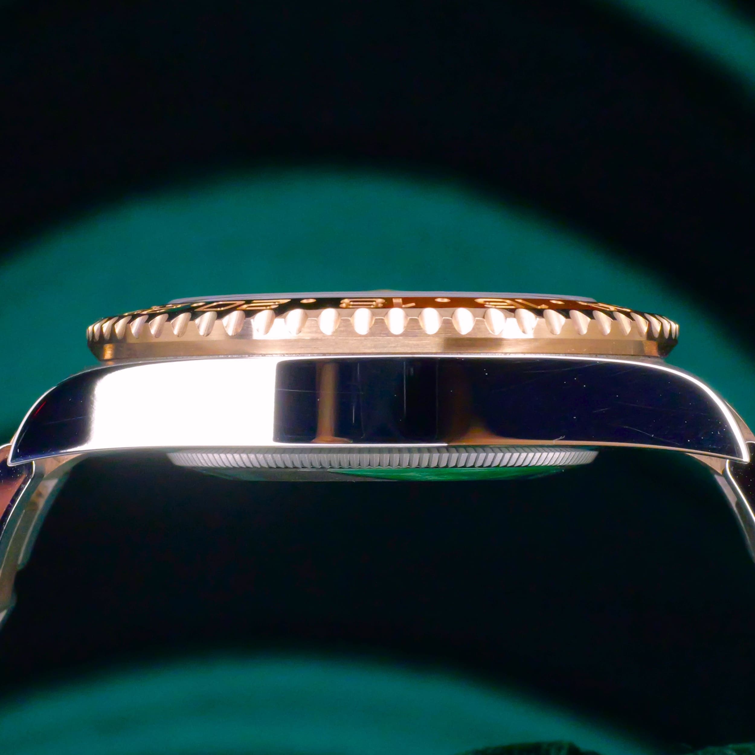 Presents itself in mint condition with little to no signs of wear. A black dial variant contrasting against the warm bezel tones, creating unmatched visual tension. One of only a handful of Rolex references to feature a bi-color ceramic “Root Beer” bezel in black and brown, a color combination exclusive to this model family. The only GMT using the “Everose” gold paired with 904L stainless steel in a 40mm Oyster case.