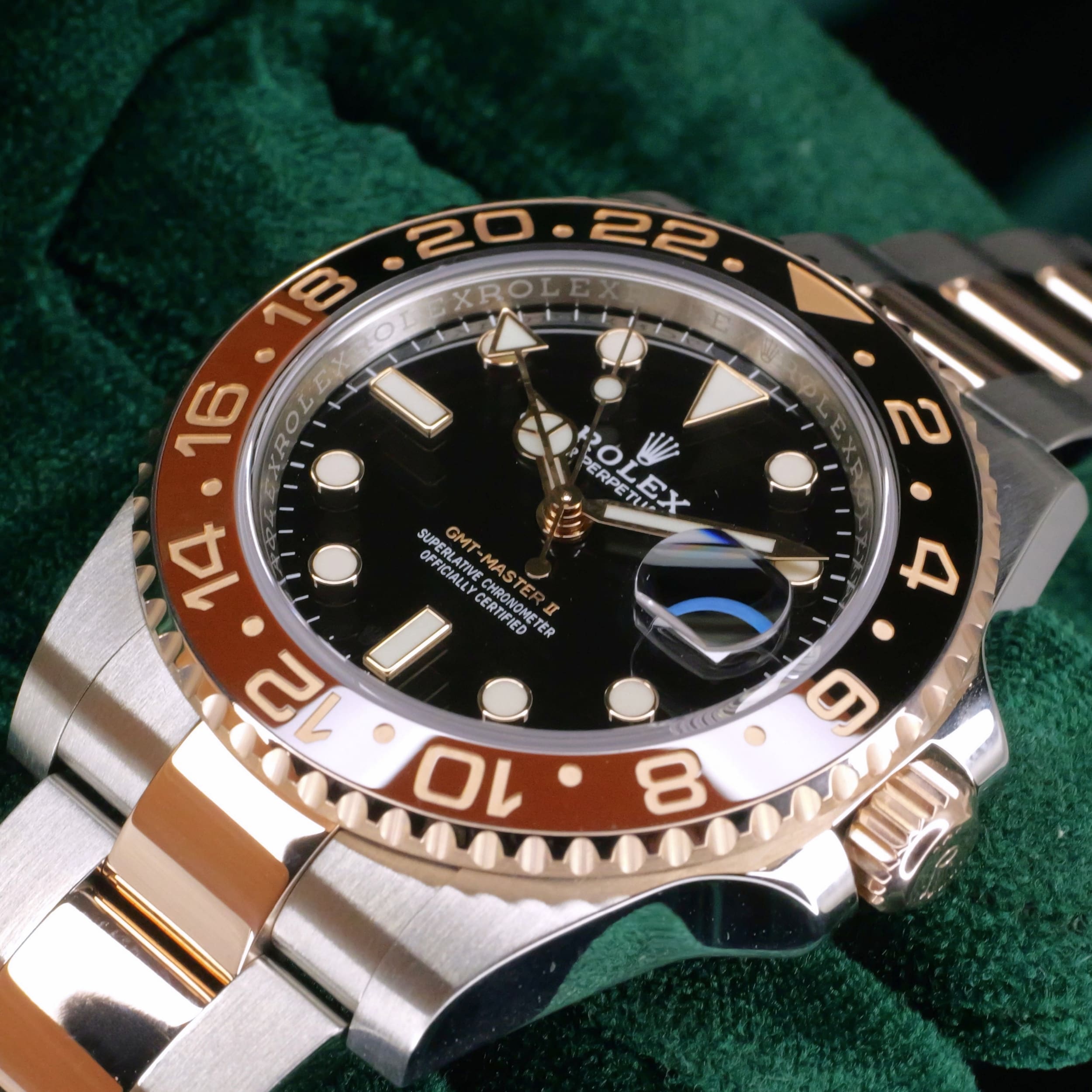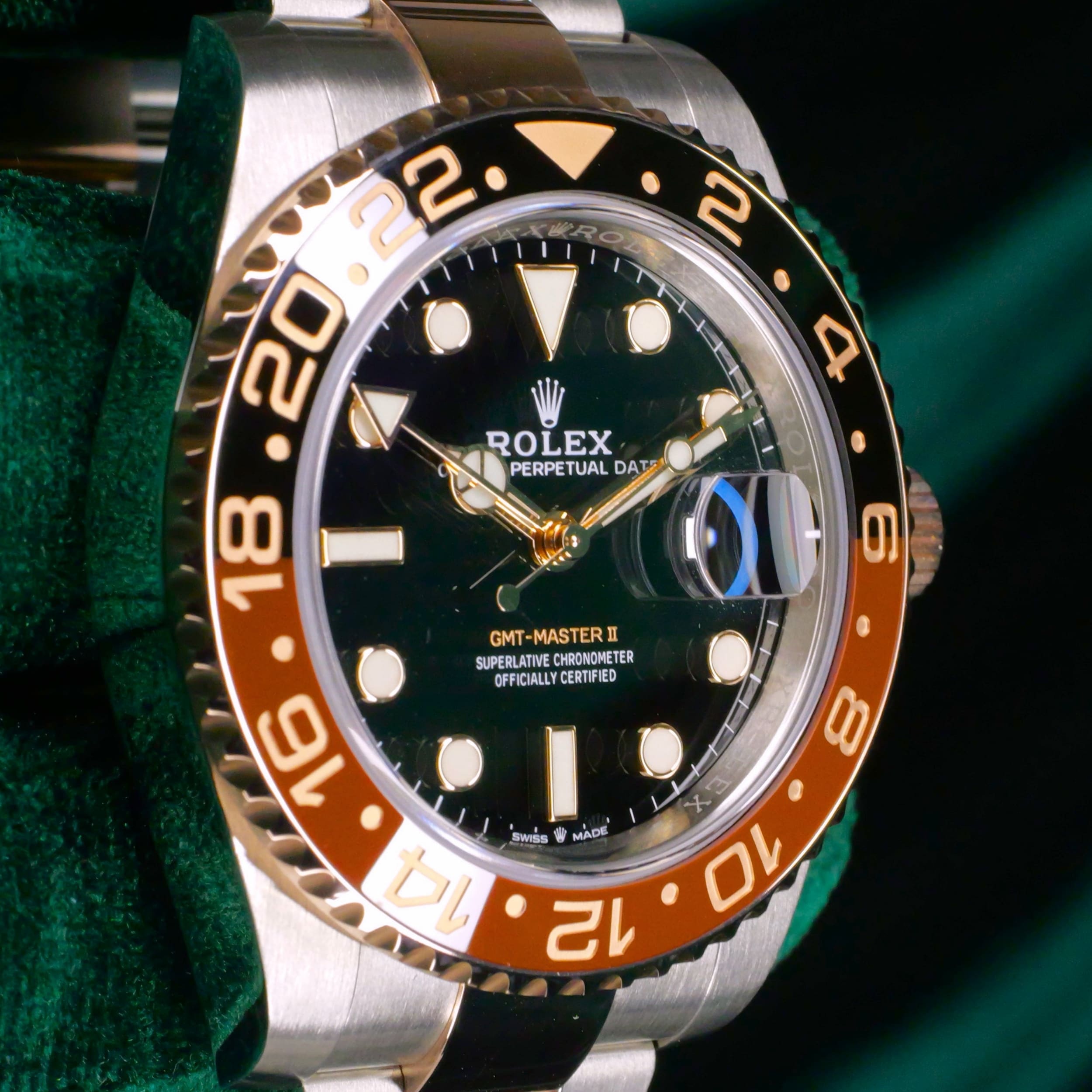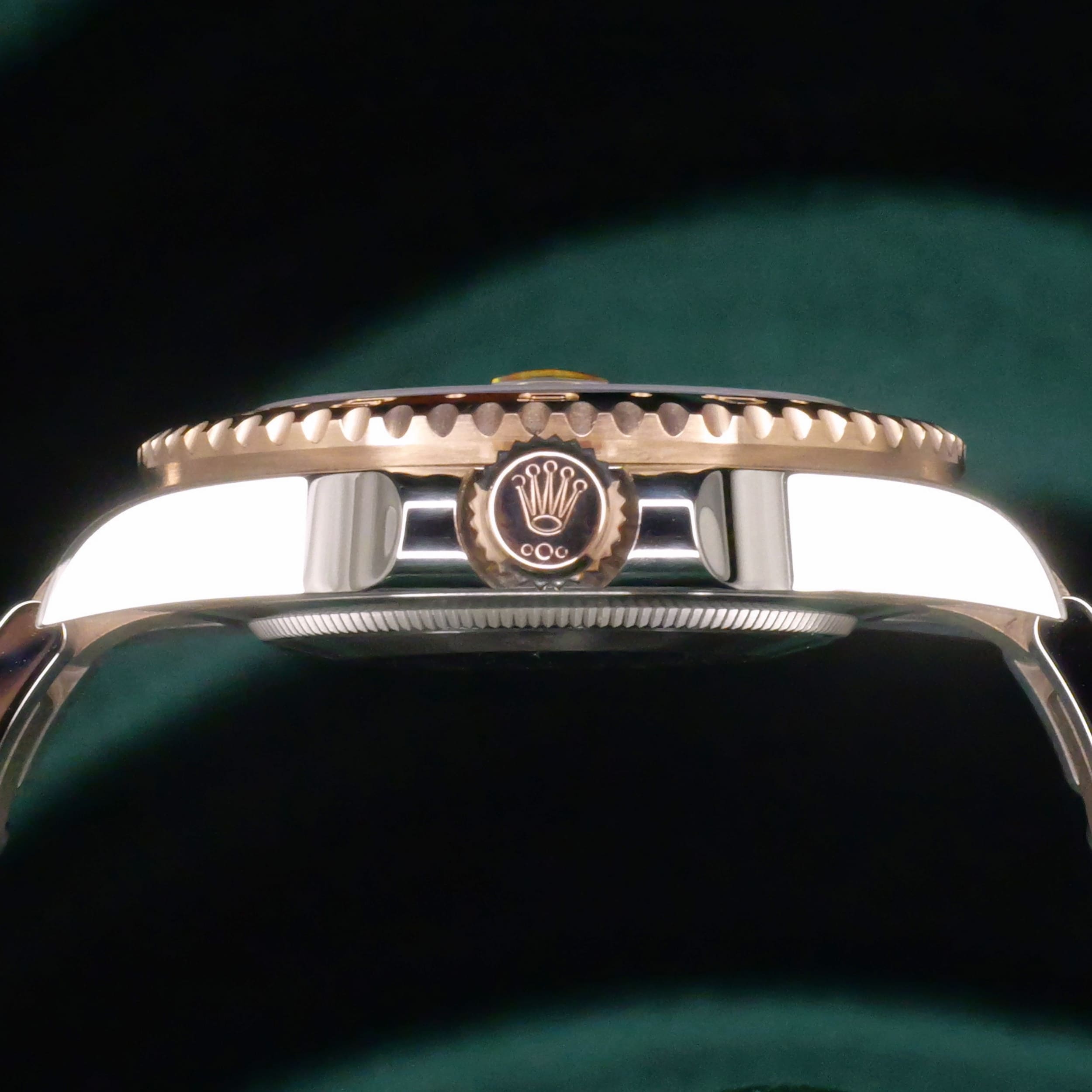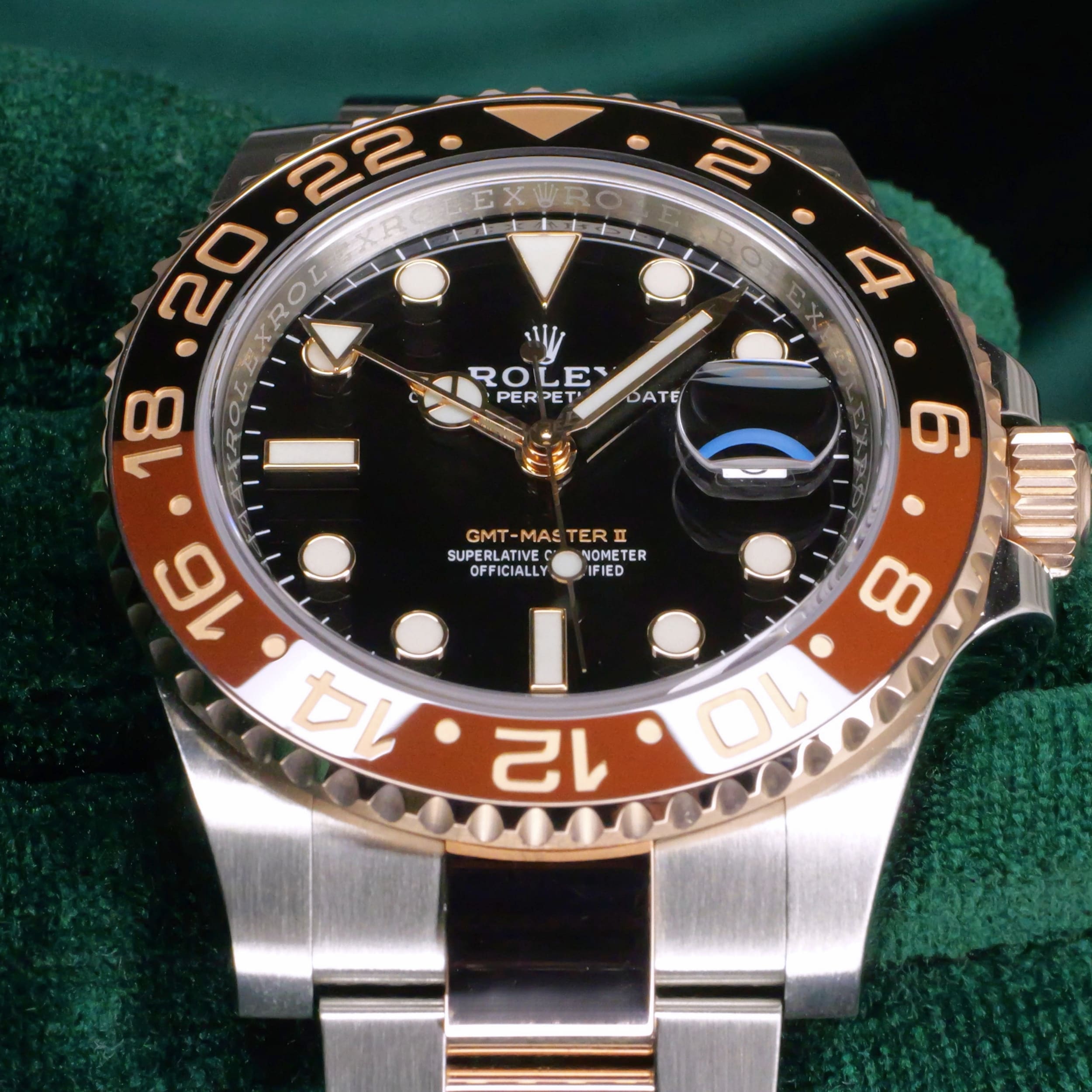 Presents itself in mint condition with little to no signs of wear. A black dial variant contrasting against the warm bezel tones, creating unmatched visual tension. One of only a handful of Rolex references to feature a bi-color ceramic “Root Beer” bezel in black and brown, a color combination exclusive to this model family. The only GMT using the “Everose” gold paired with 904L stainless steel in a 40mm Oyster case.