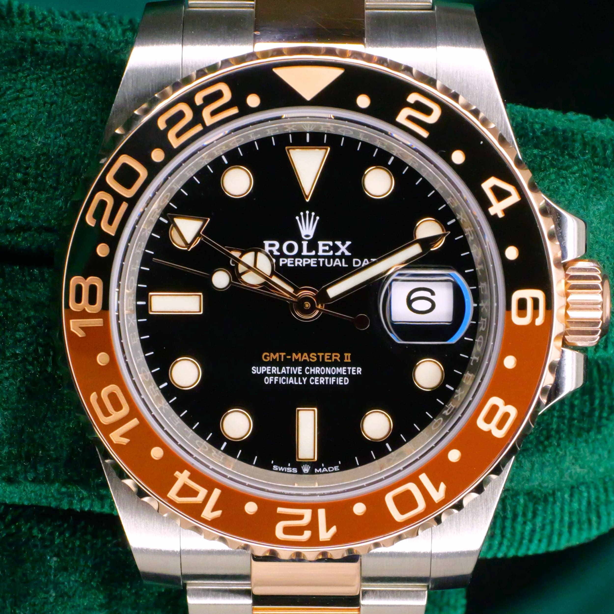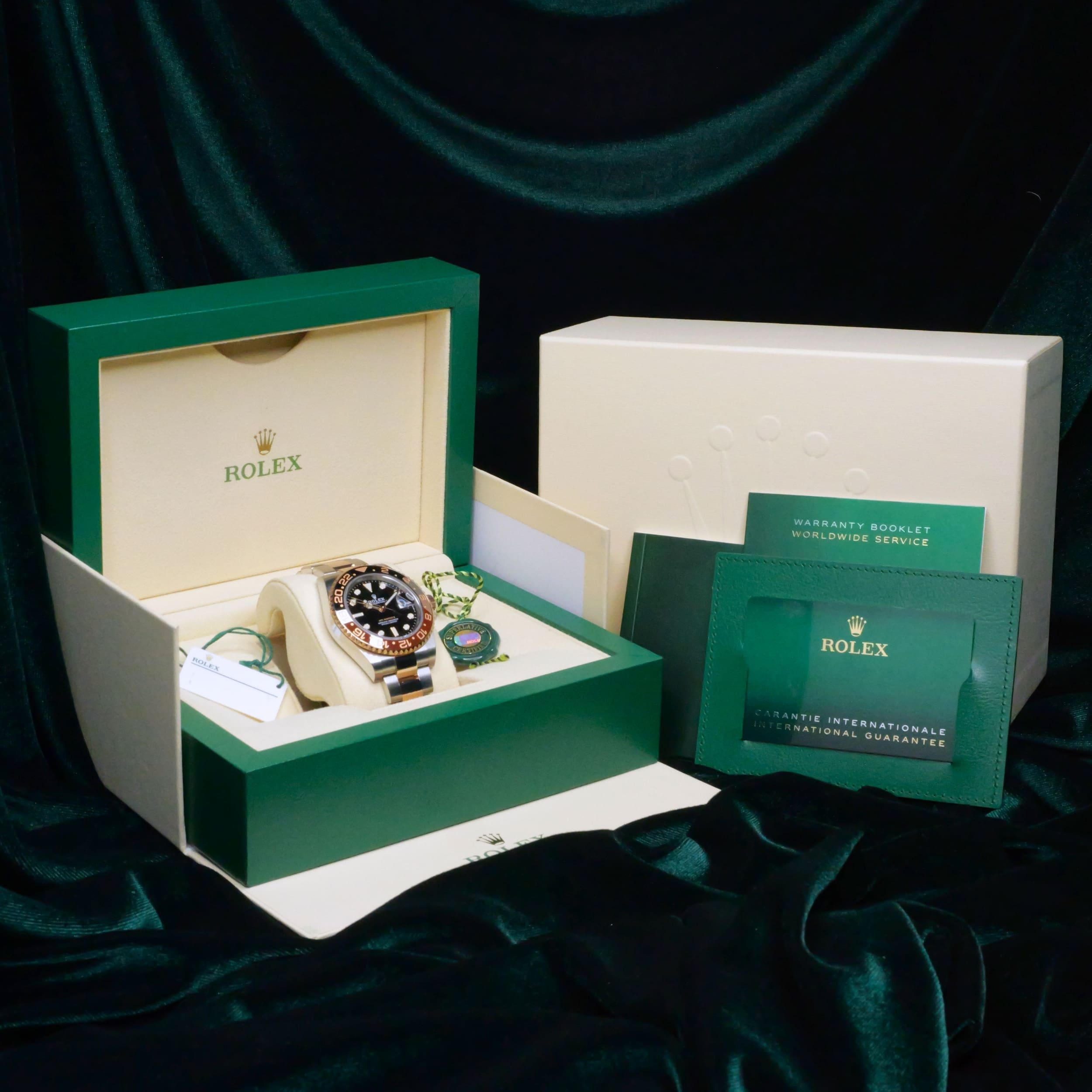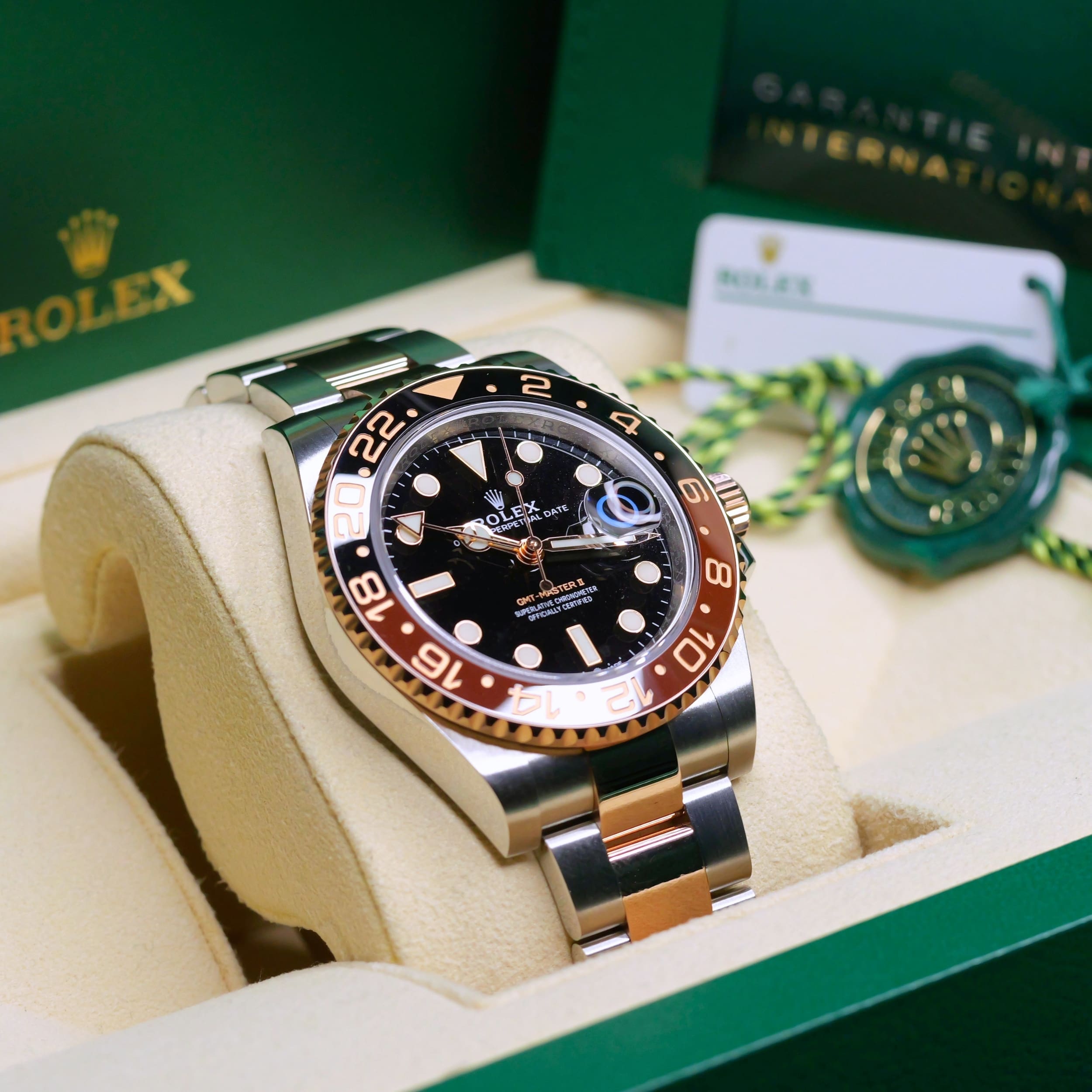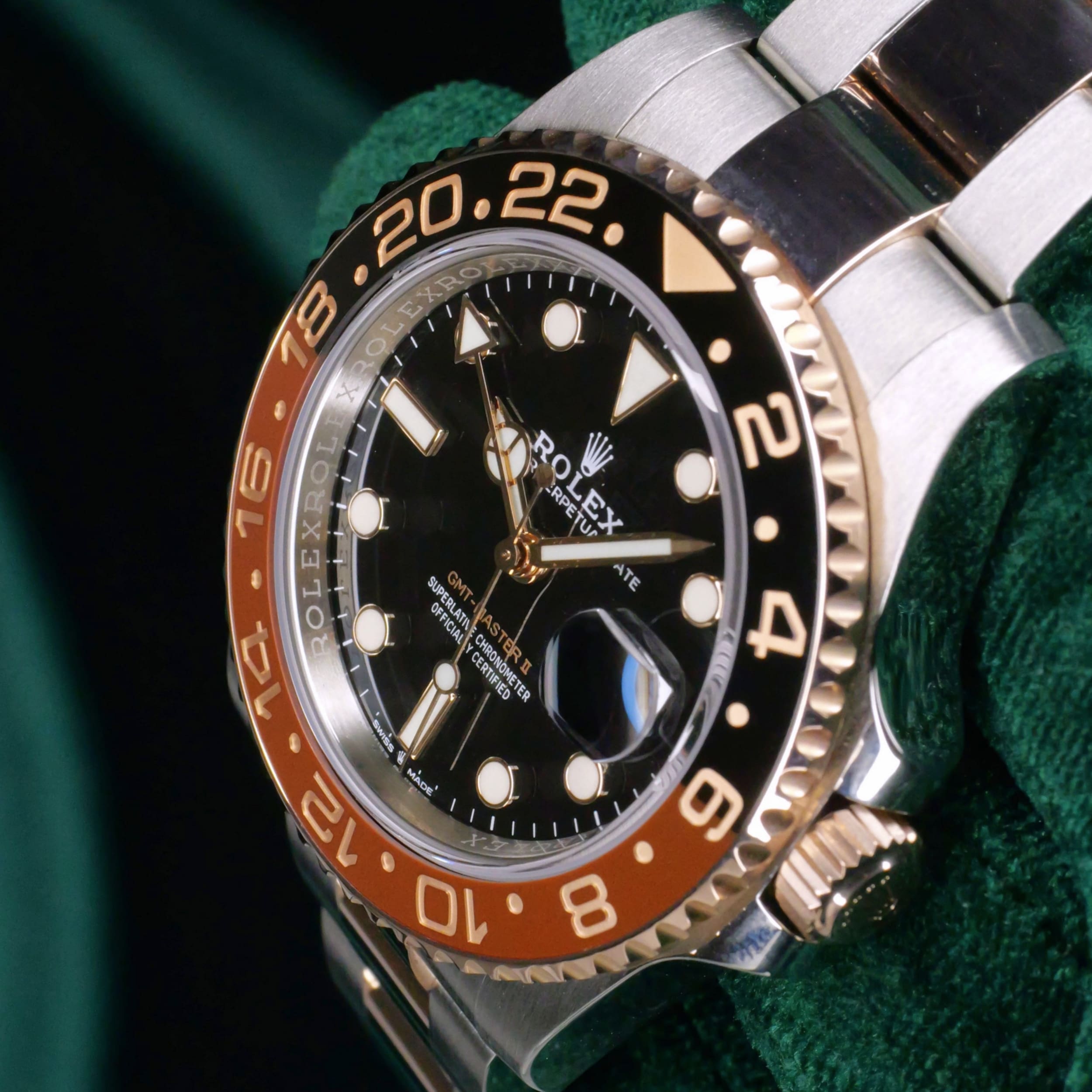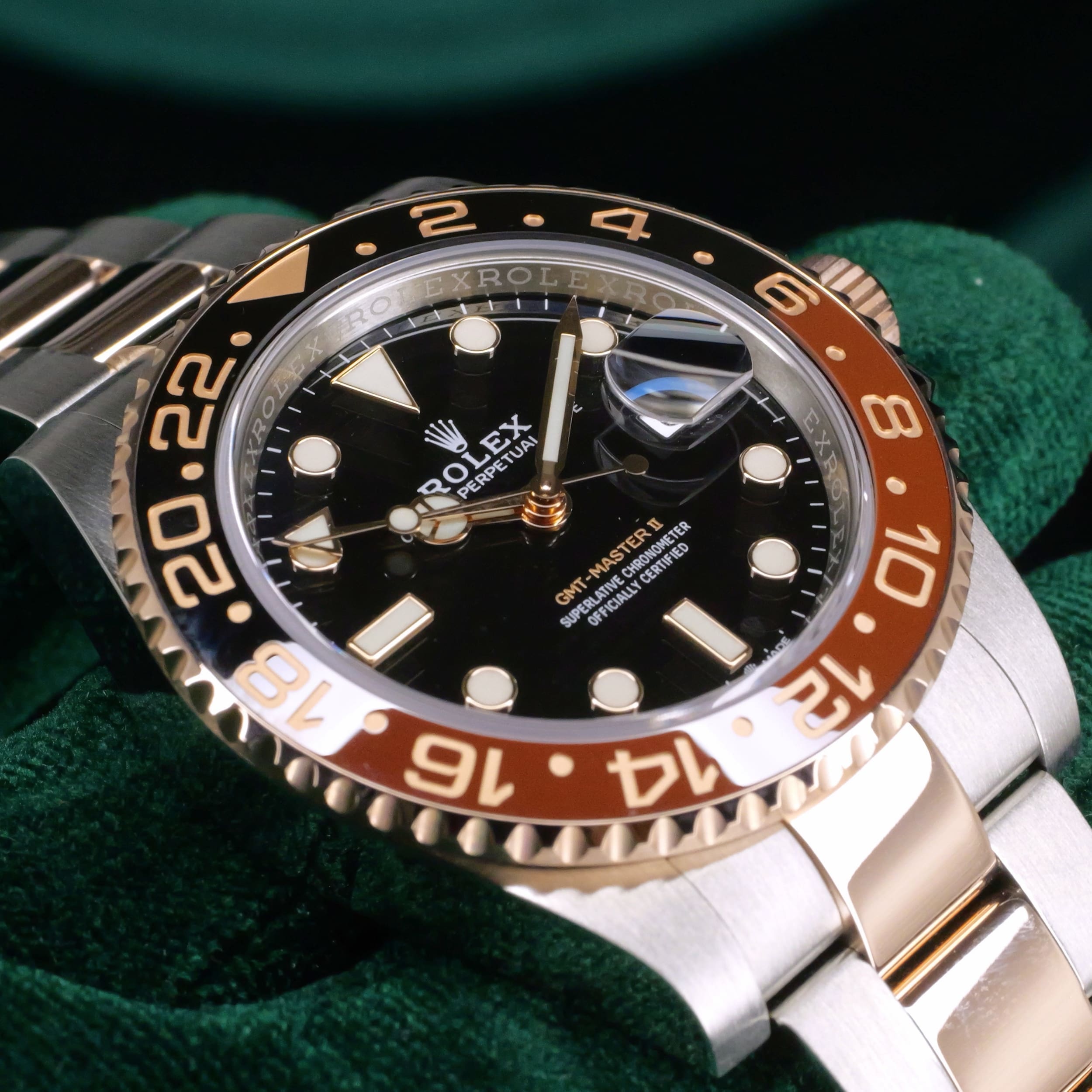 Presents itself in mint condition with little to no signs of wear. A black dial variant contrasting against the warm bezel tones, creating unmatched visual tension. One of only a handful of Rolex references to feature a bi-color ceramic “Root Beer” bezel in black and brown, a color combination exclusive to this model family. The only GMT using the “Everose” gold paired with 904L stainless steel in a 40mm Oyster case.