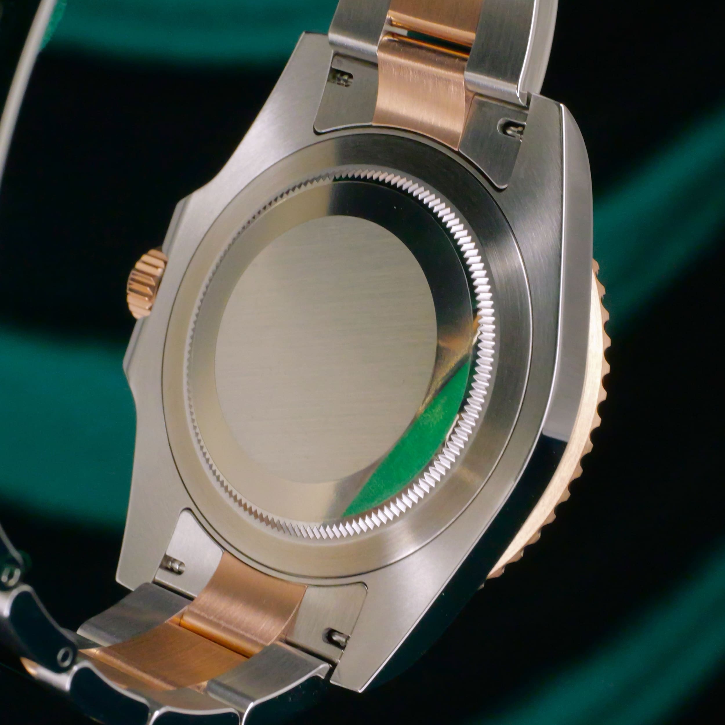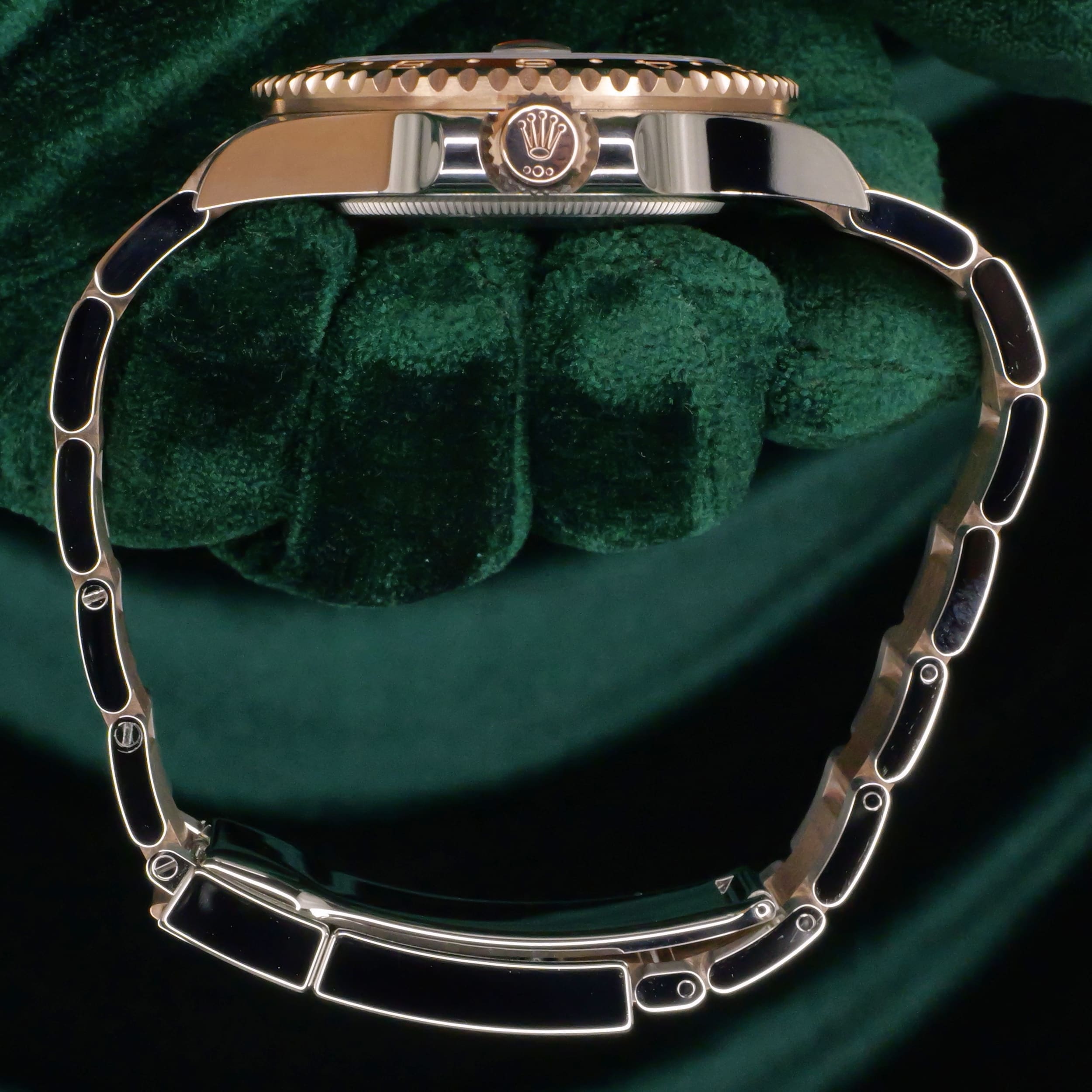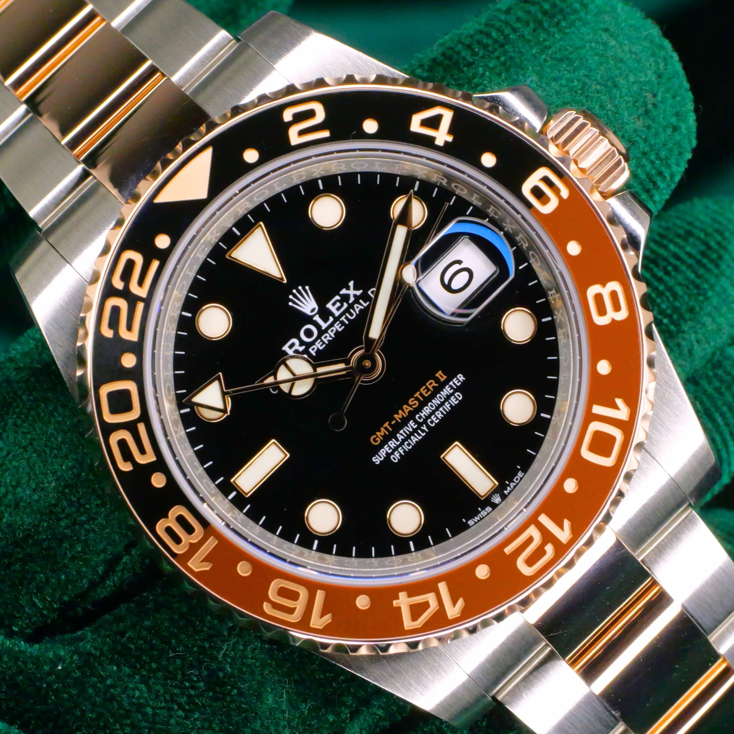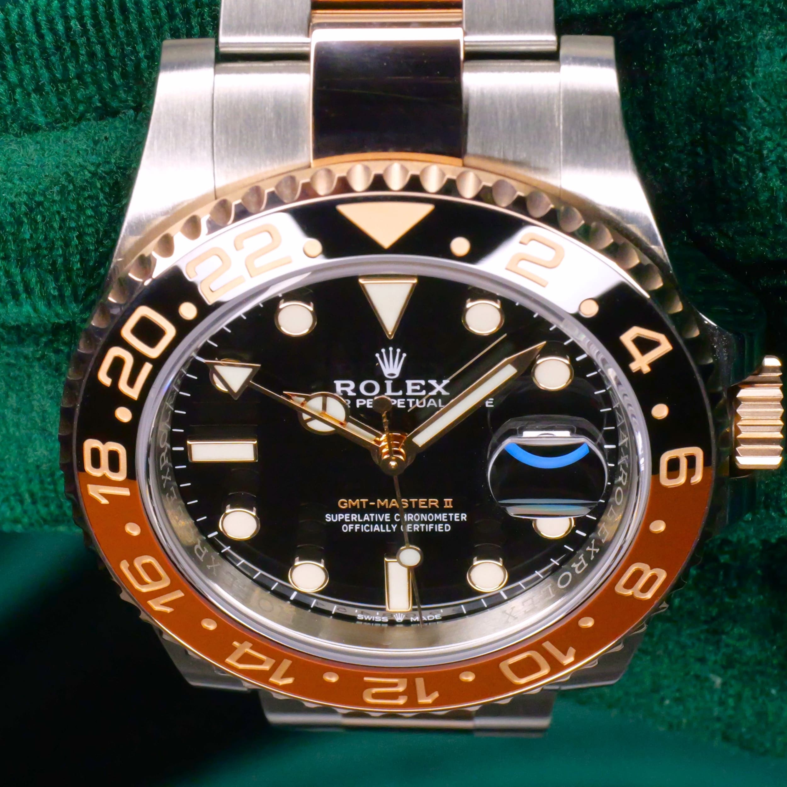 Presents itself in mint condition with little to no signs of wear. A black dial variant contrasting against the warm bezel tones, creating unmatched visual tension. One of only a handful of Rolex references to feature a bi-color ceramic “Root Beer” bezel in black and brown, a color combination exclusive to this model family. The only GMT using the “Everose” gold paired with 904L stainless steel in a 40mm Oyster case.