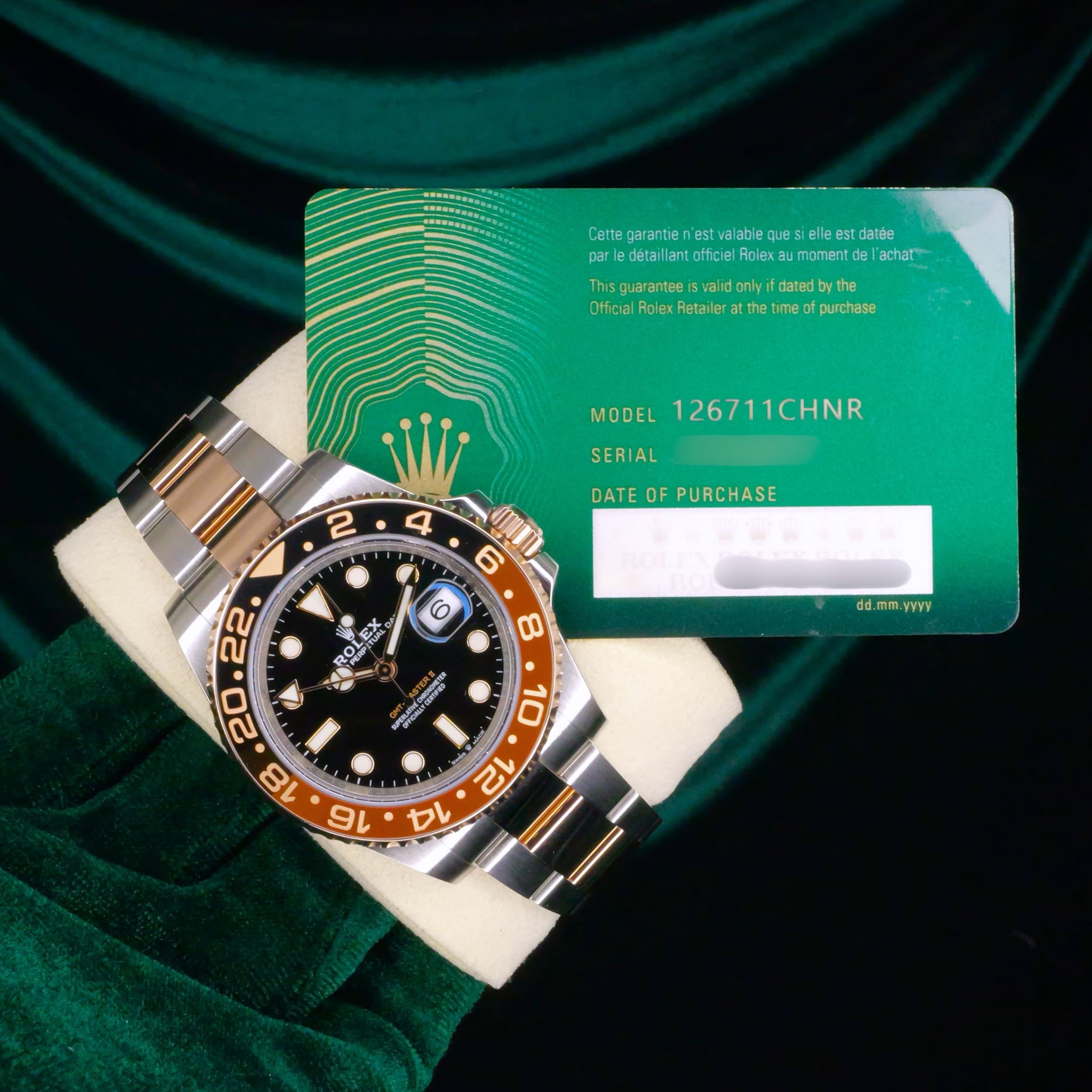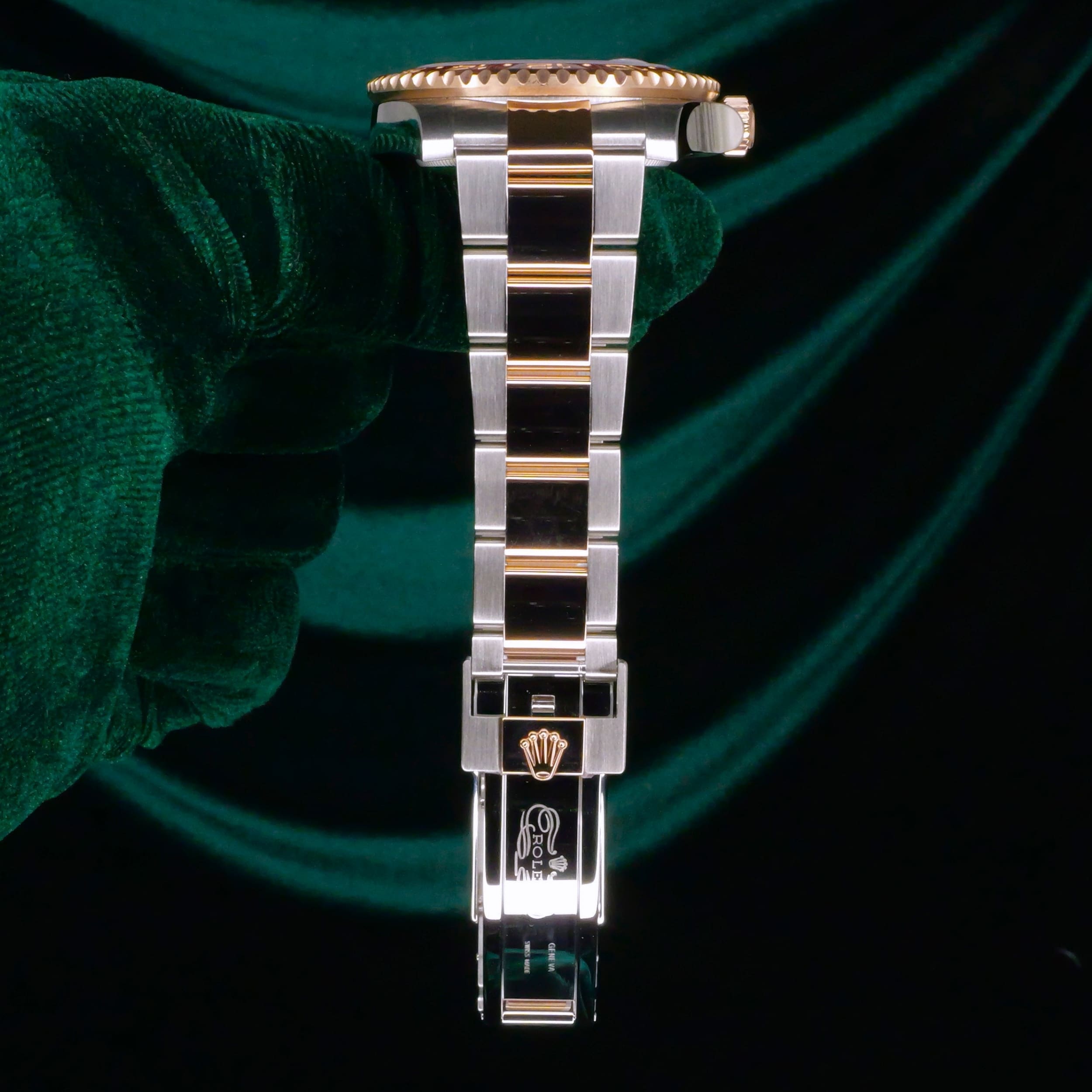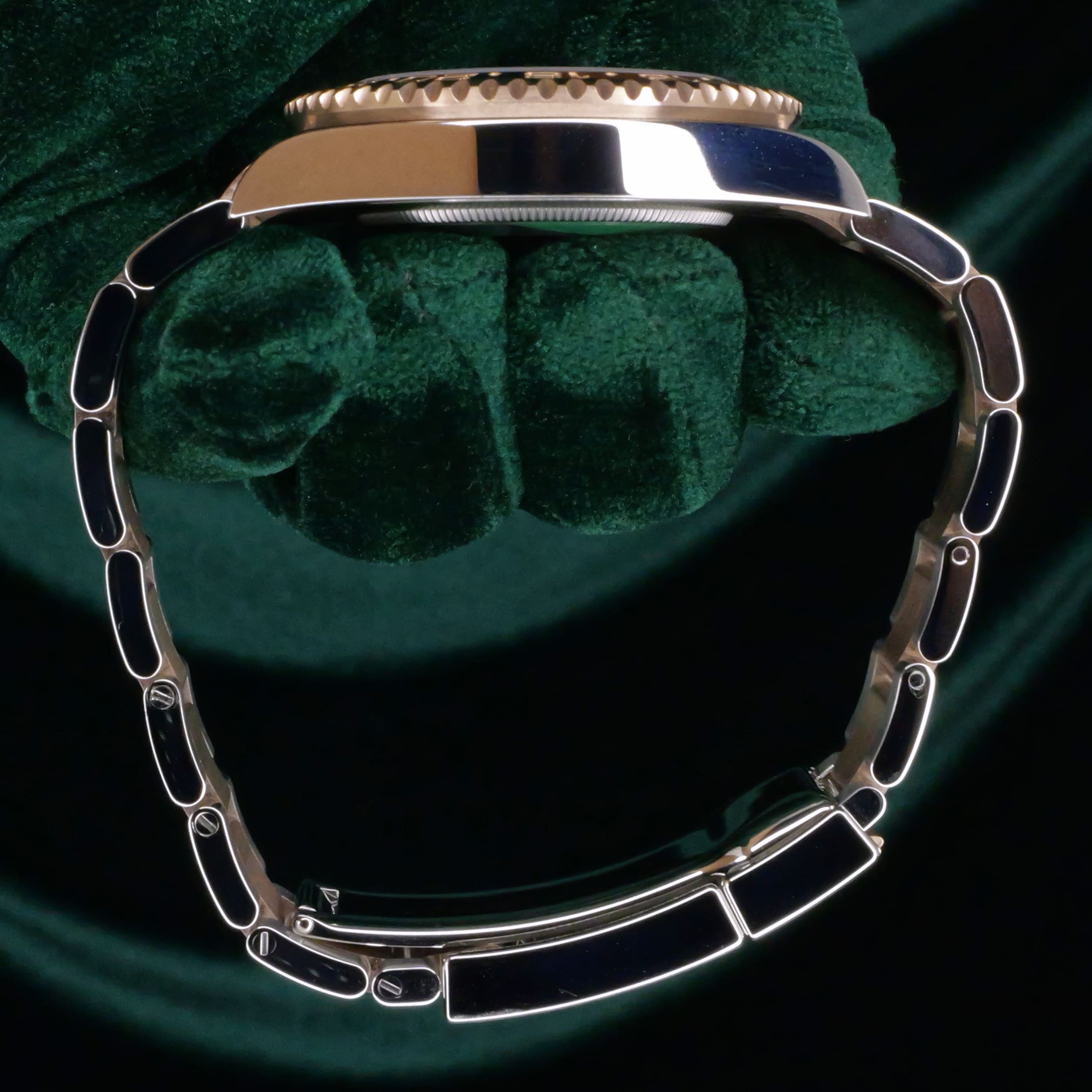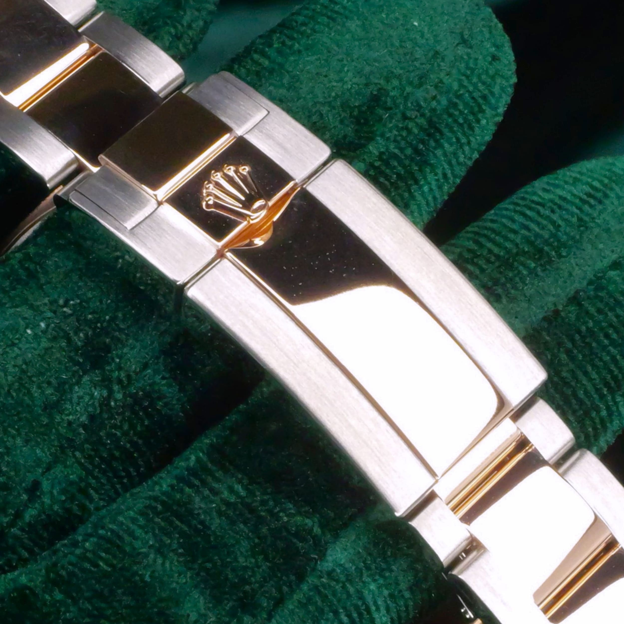 Presents itself in mint condition with little to no signs of wear. A black dial variant contrasting against the warm bezel tones, creating unmatched visual tension. One of only a handful of Rolex references to feature a bi-color ceramic “Root Beer” bezel in black and brown, a color combination exclusive to this model family. The only GMT using the “Everose” gold paired with 904L stainless steel in a 40mm Oyster case.