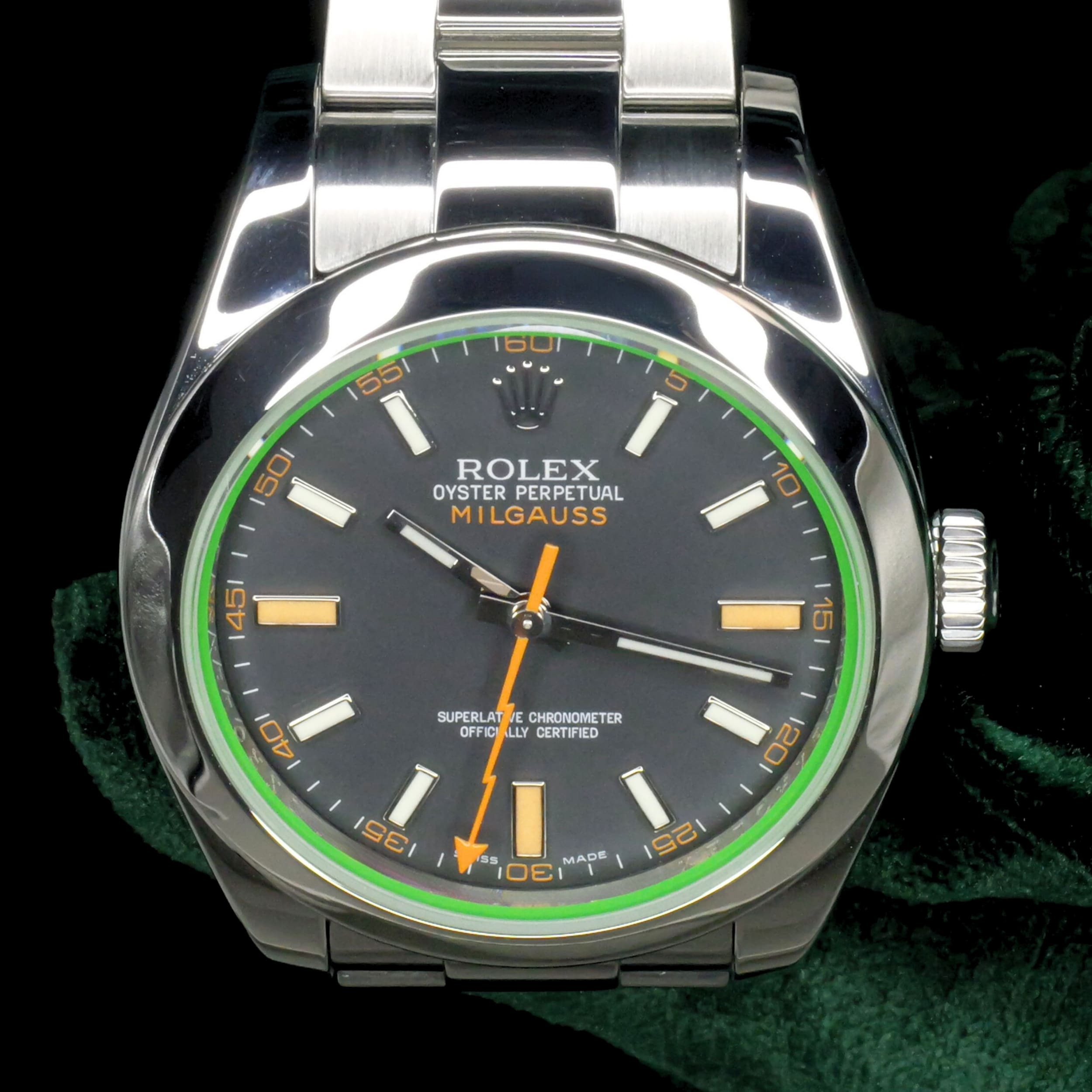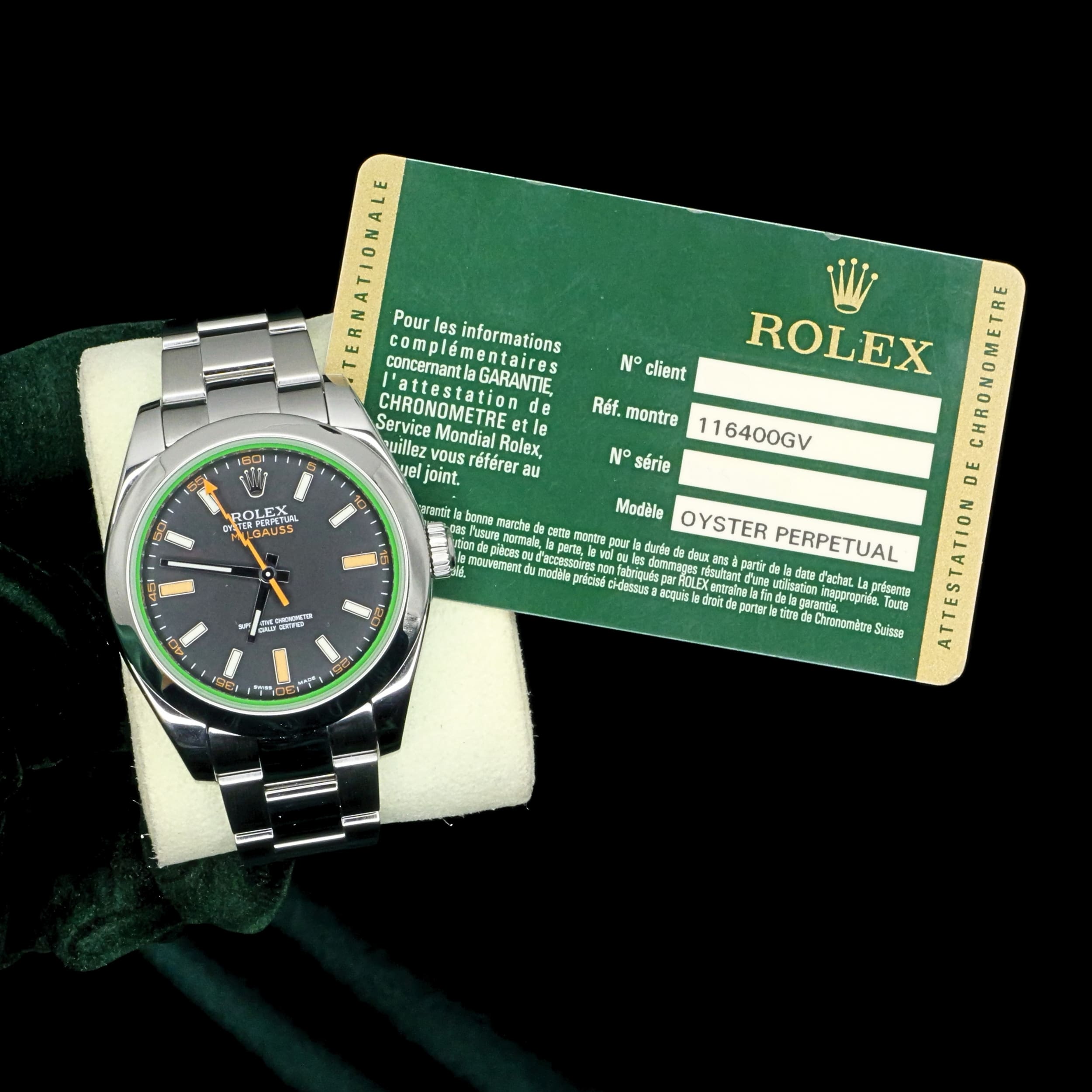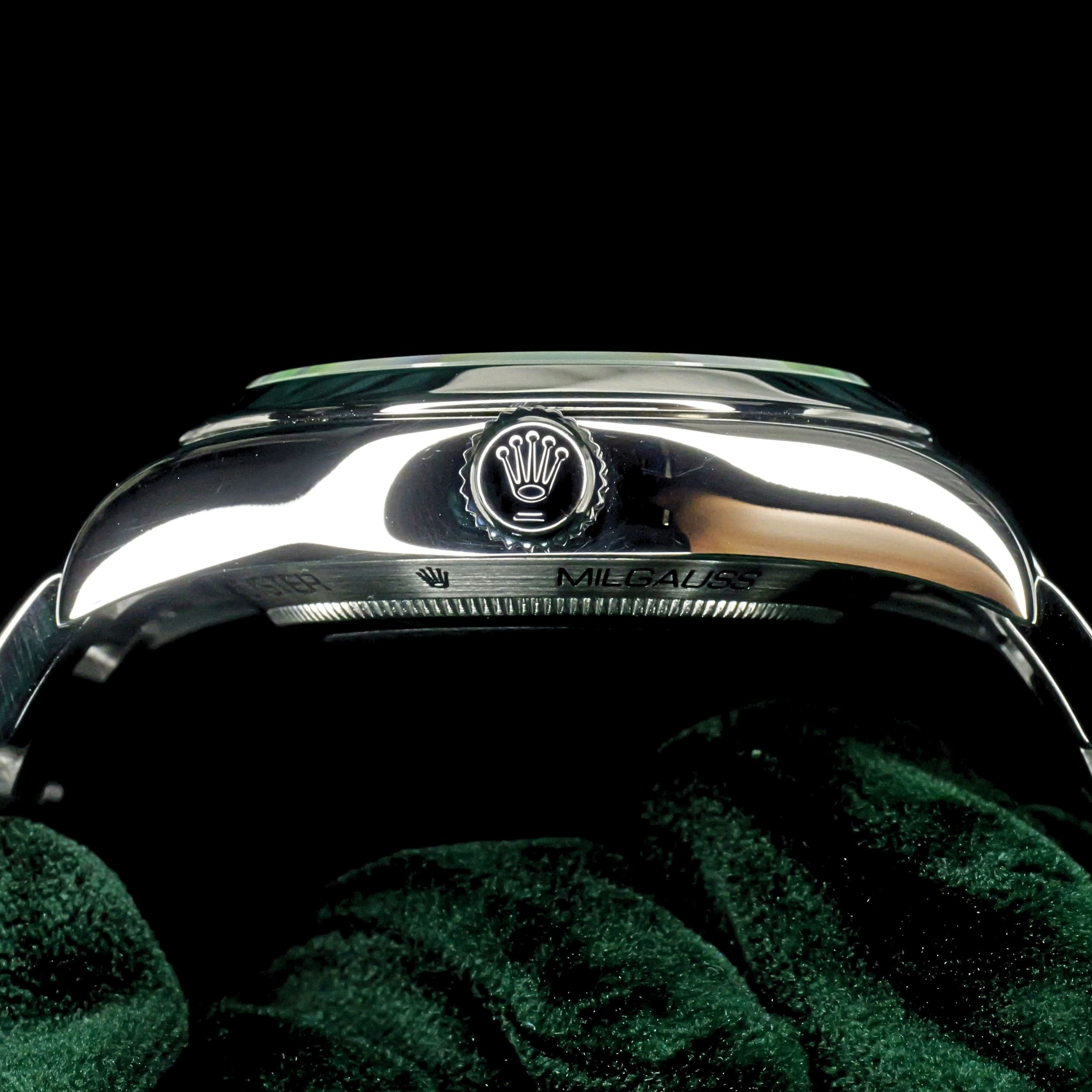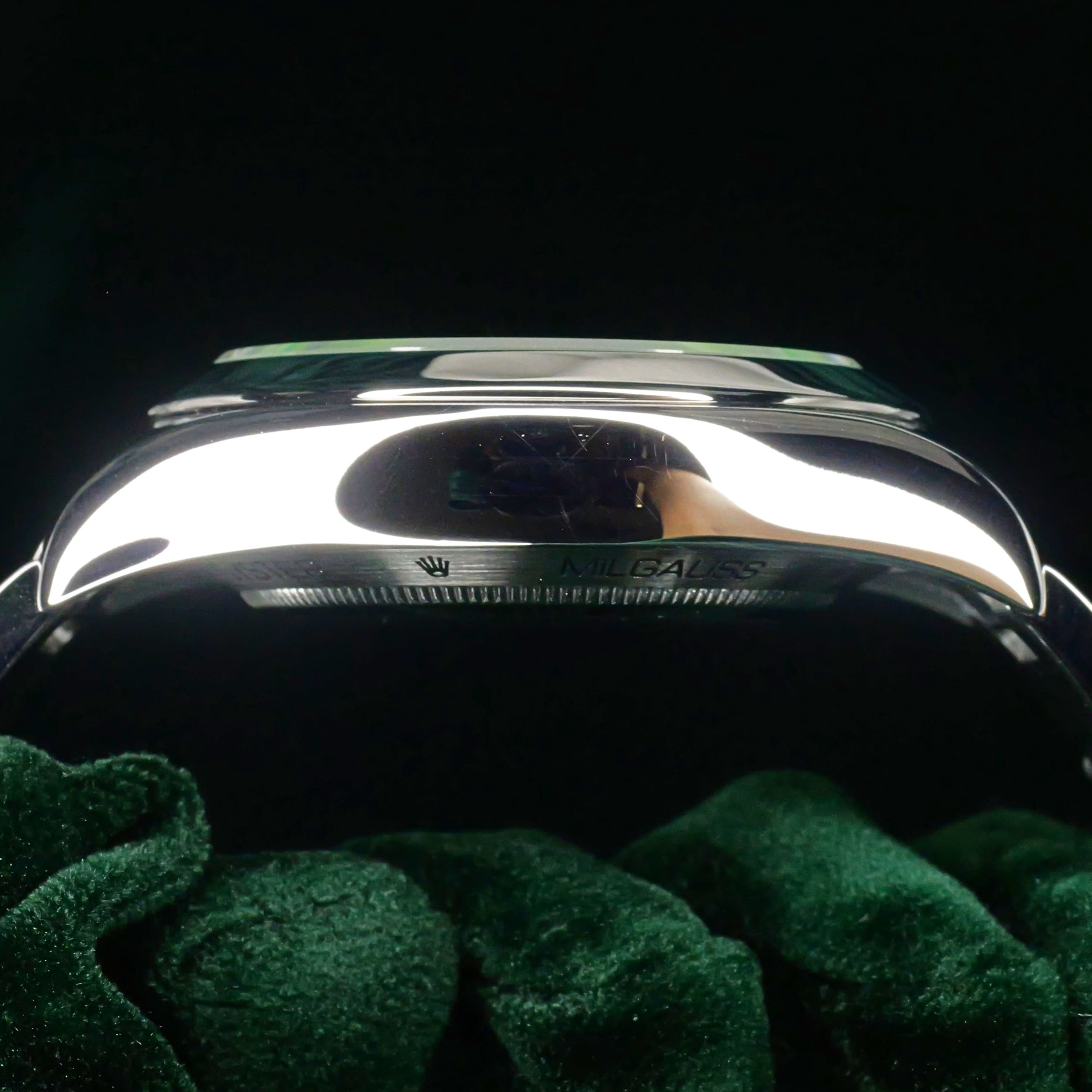 Comes as a full set, double-boxed, including a watch pillow, warranty card, Rolex Milgauss booklet, and white hang tag.
