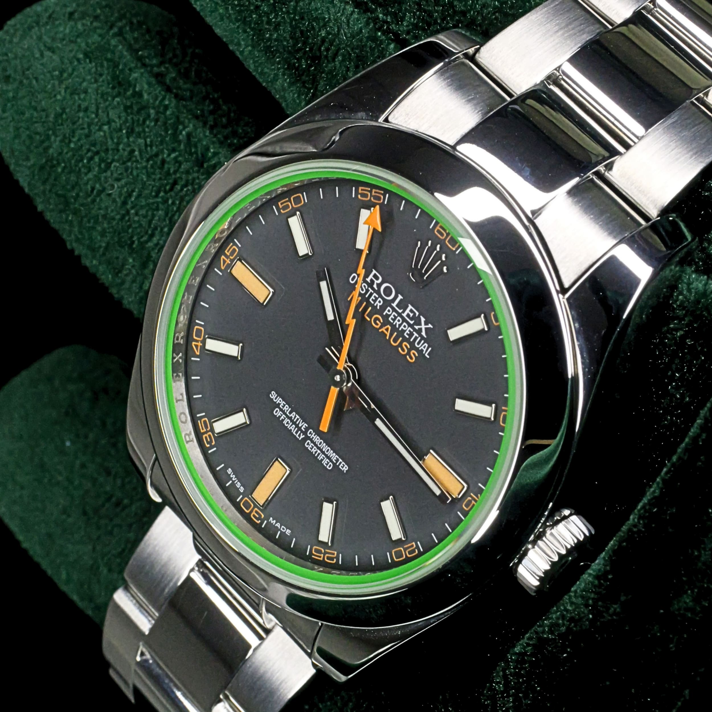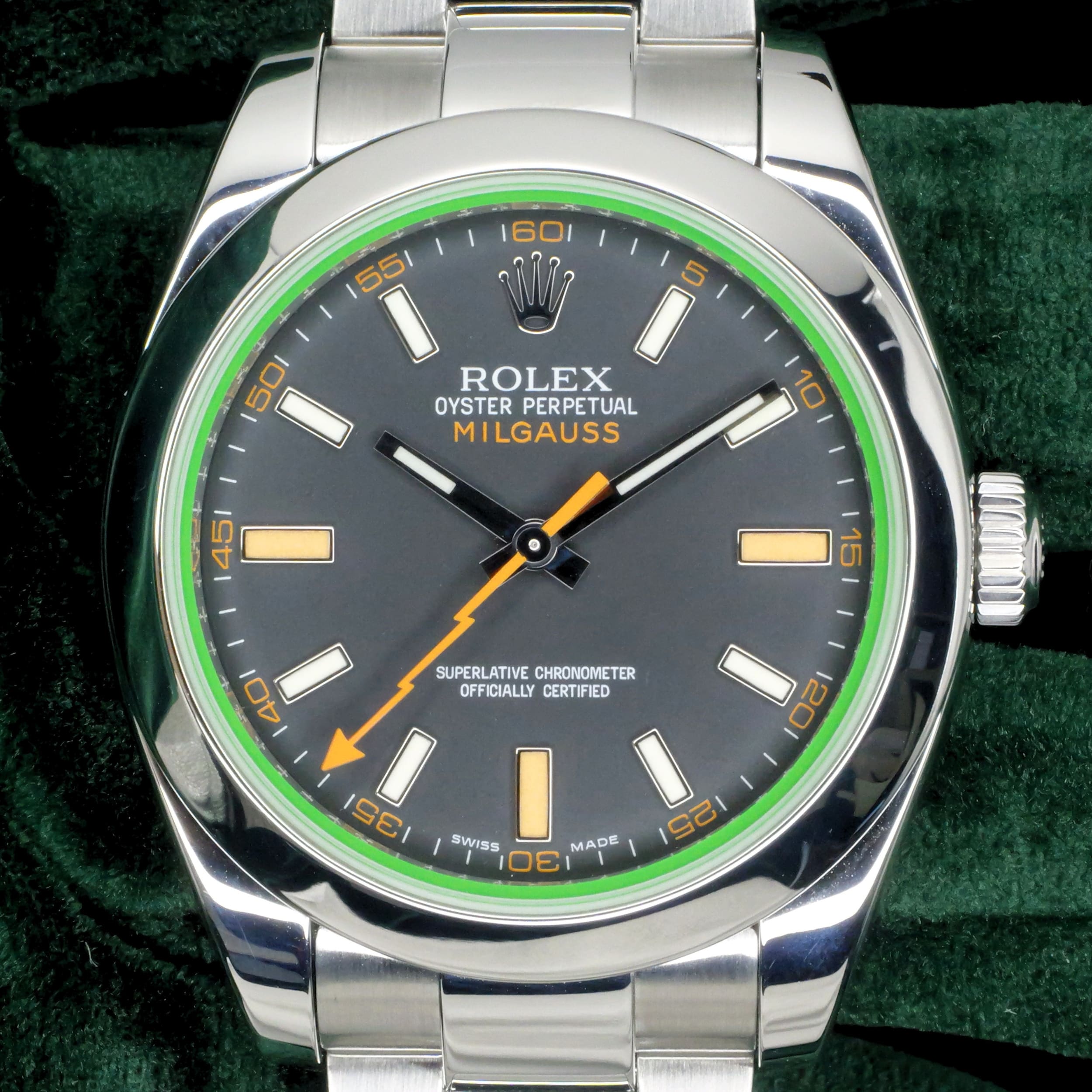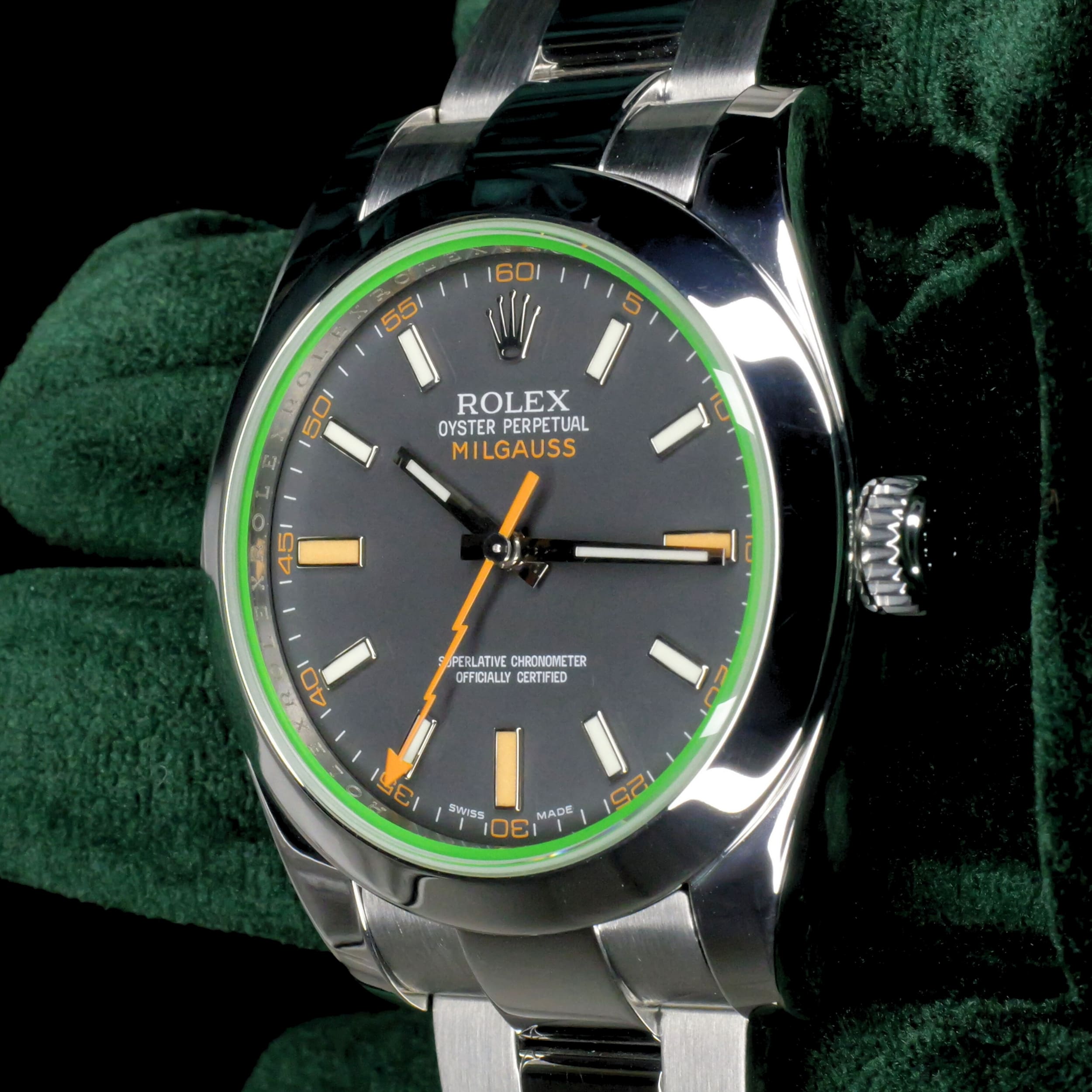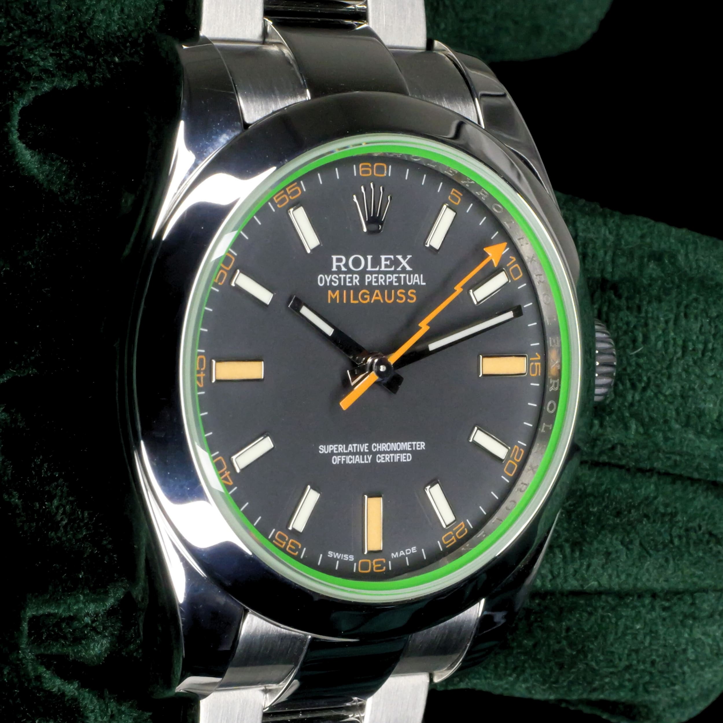 Comes as a full set, double-boxed, including a watch pillow, warranty card, Rolex Milgauss booklet, and white hang tag.