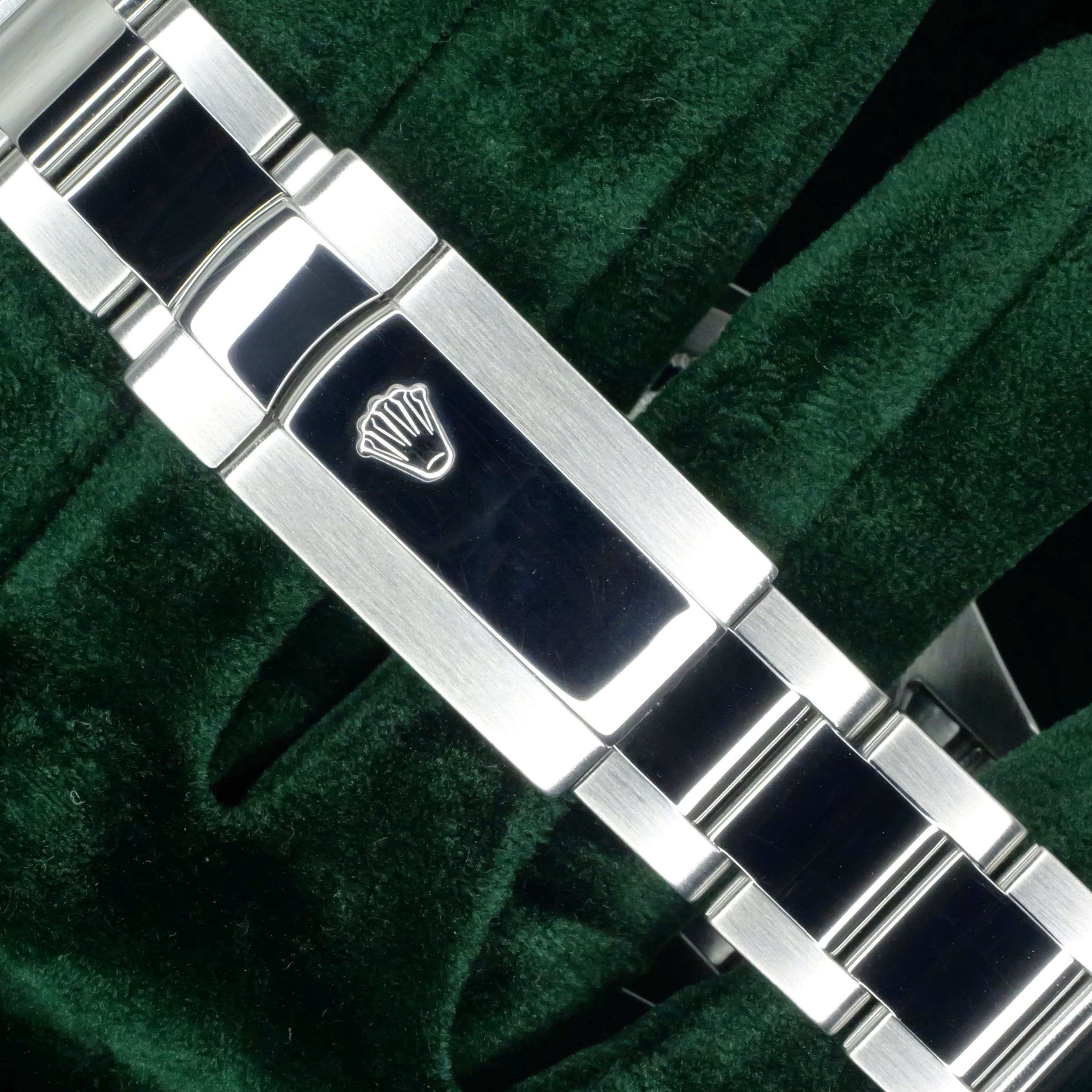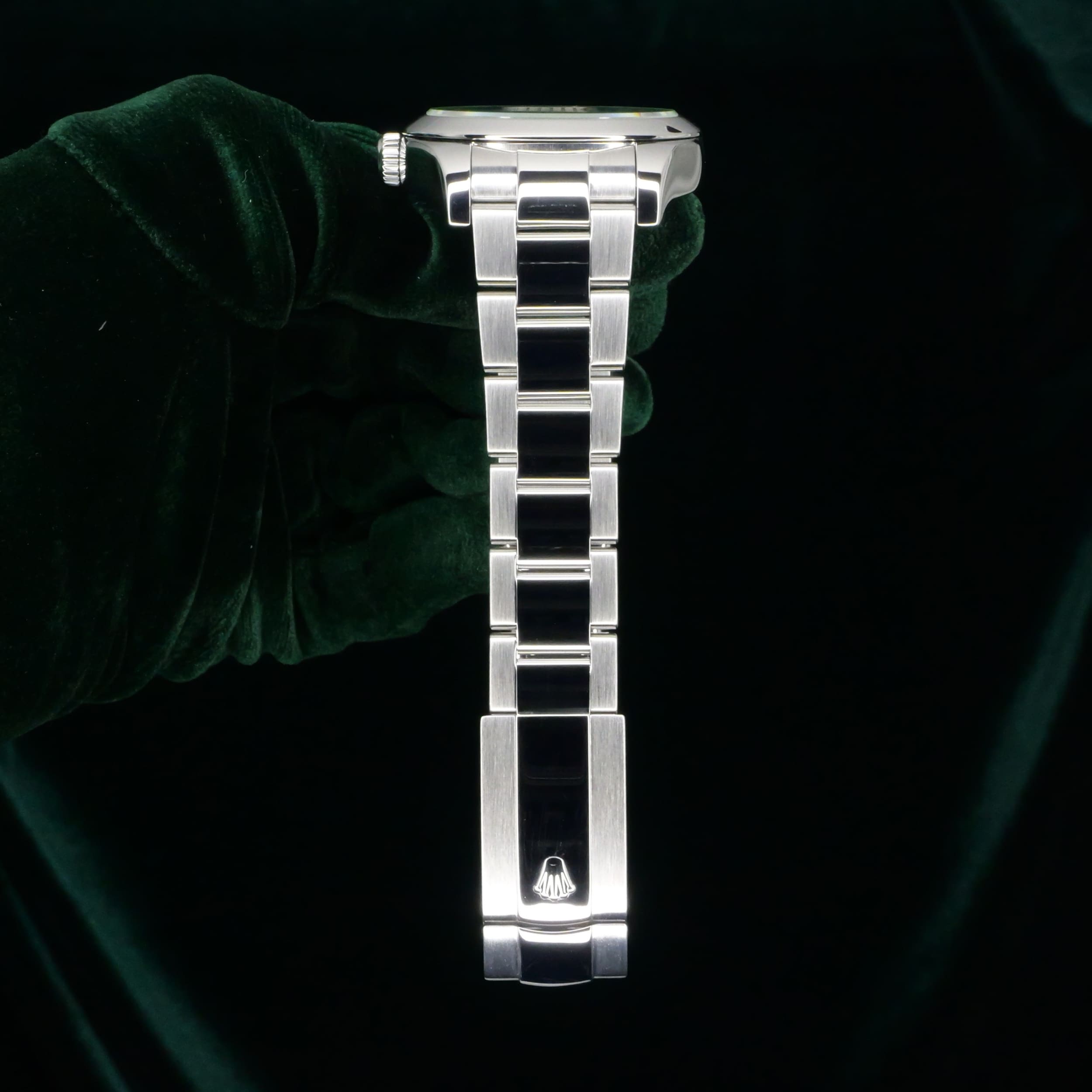 Presents itself in mint condition with little to no signs of wear. Its green sapphire crystal casts a subtle emerald hue across the dial, shifting gently as light moves across the surface and giving the watch a distinctive glow from every angle. Beneath it, the black dial provides a deep, clean backdrop that allows the orange lightning-bolt seconds hand and matching accents to stand out with striking contrast. It also features a beautiful high-polished Oystersteel case and solid caseback.