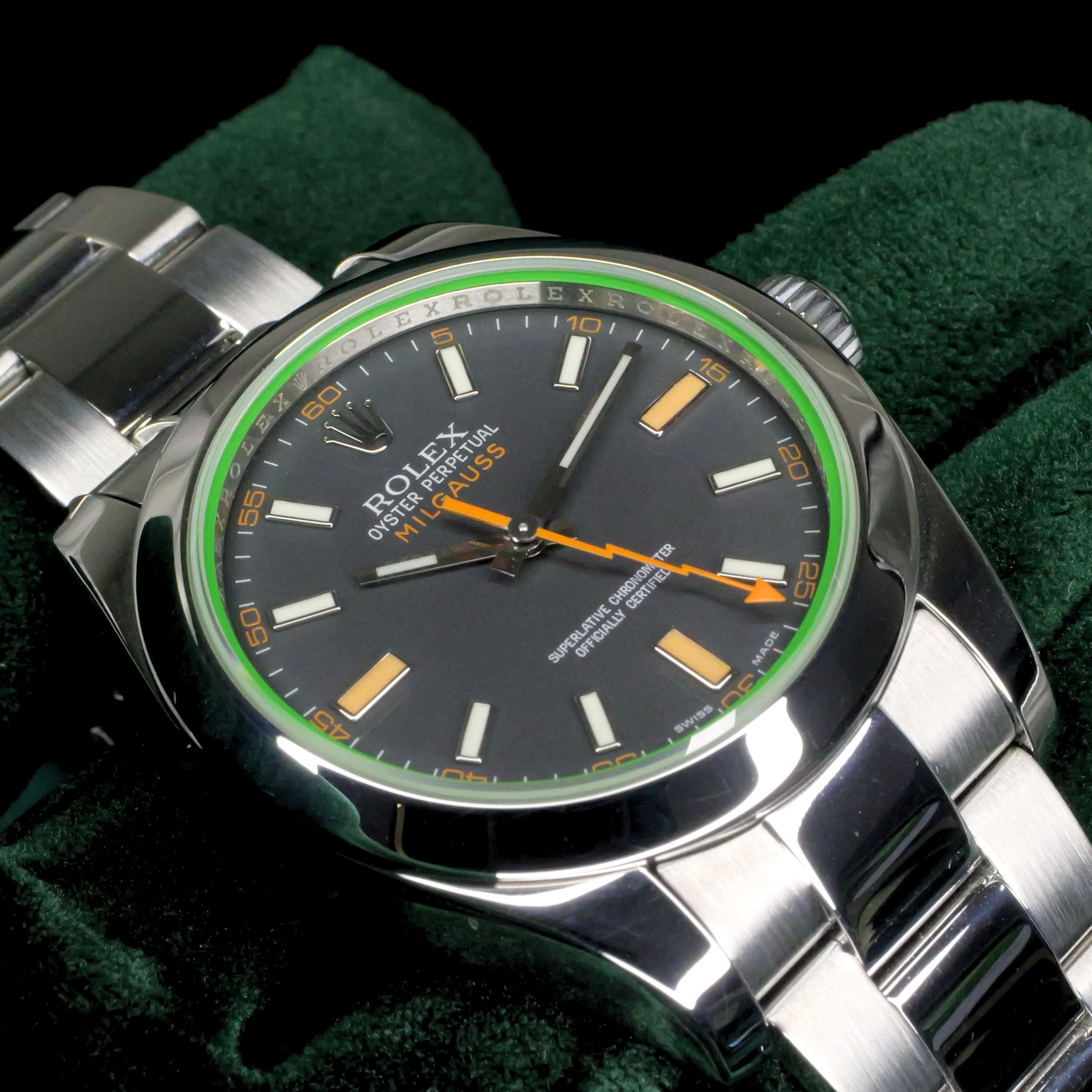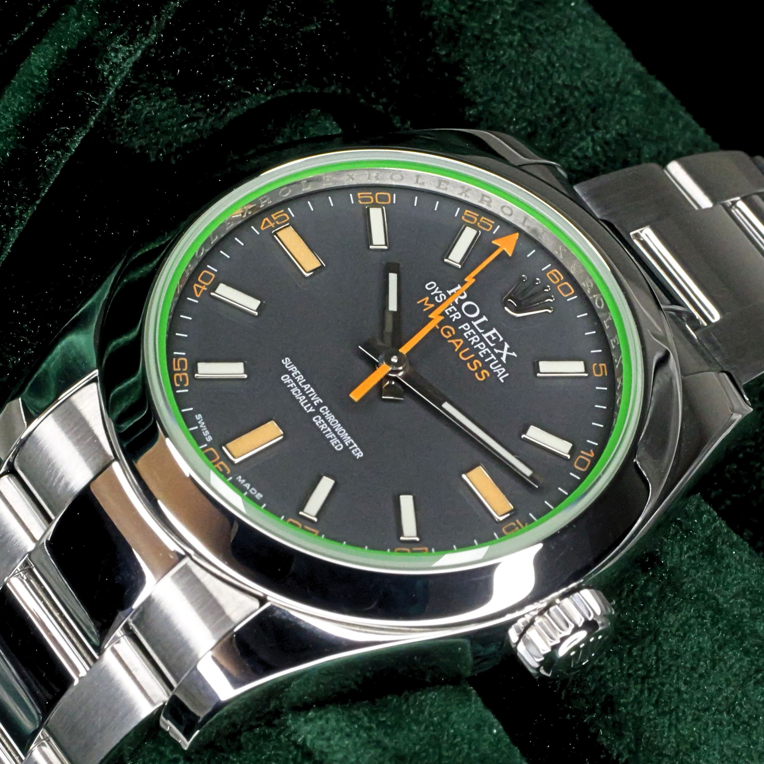 Designed to resist powerful magnetic interference, this distinctive Rolex Milgauss pairs a black dial with a green sapphire crystal and the signature orange lightning-bolt seconds hand, creating an unmistakable visual identity rarely found elsewhere in the Rolex catalog. An ideal addition for collectors drawn to Rolex models with a distinct personality, this Milgauss stands apart with its blend of scientific heritage, bold color accents, and the unmistakable green sapphire crystal that defines the GV reference.