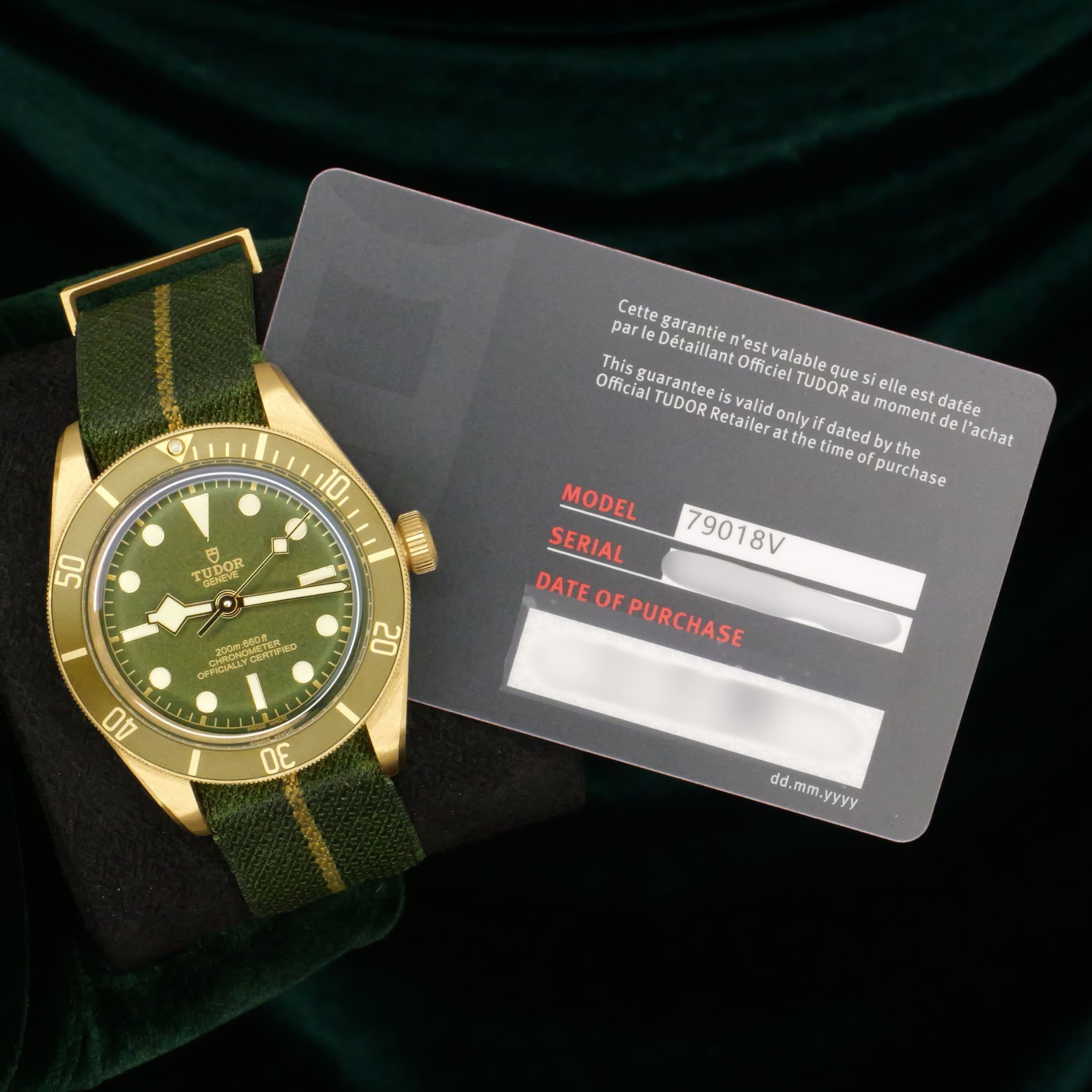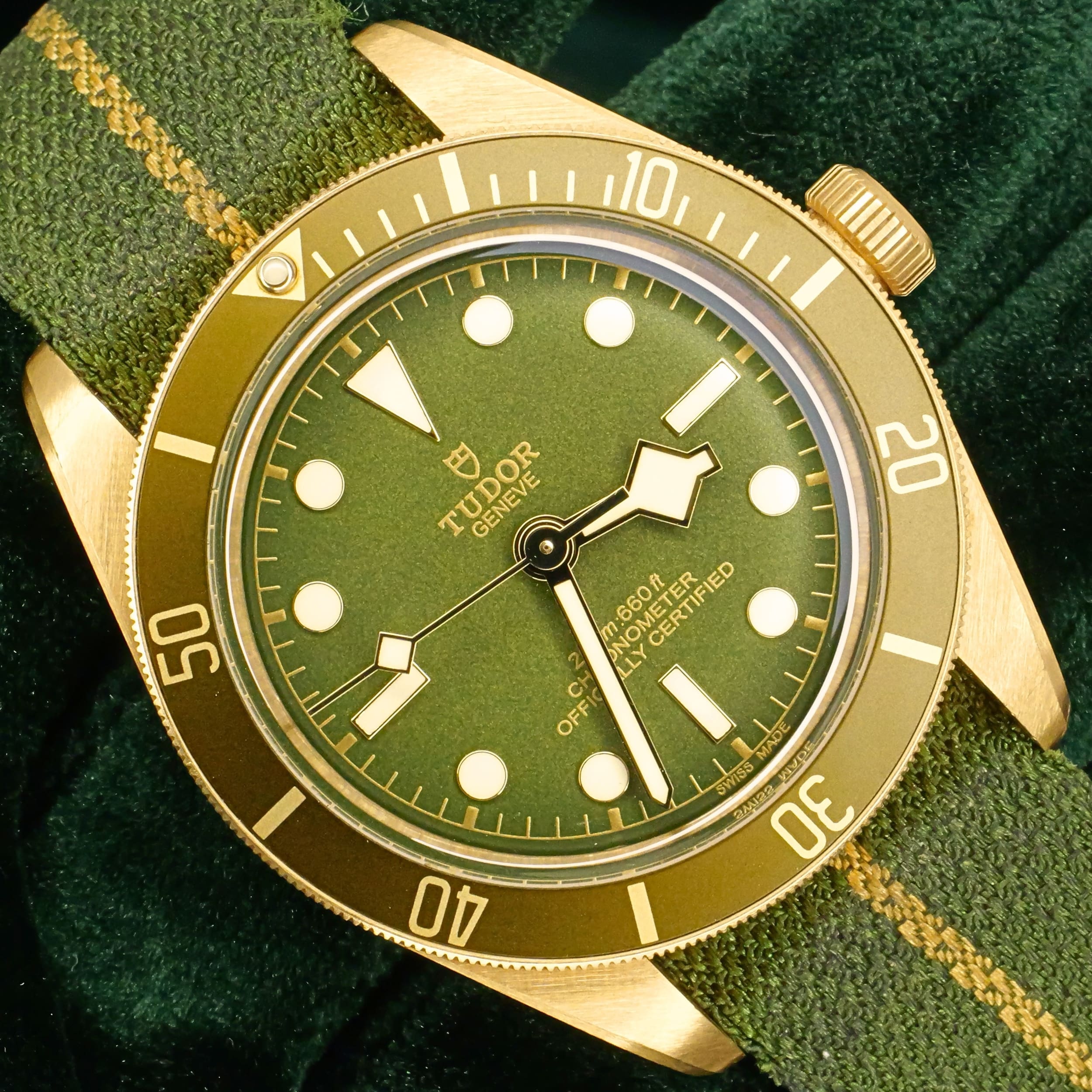 Presents itself in mint condition with little to no signs of wear. Showcasing a matte green dial, it displays a rich, muted tone complemented by applied gold hour markers and hands that blend warmth with strong legibility. Features a matching green bezel insert that adds depth while maintaining a cohesive look. Solid 18K yellow gold case introduces weight and presence, finished with soft brushing that keeps the watch from feeling overly flashy.