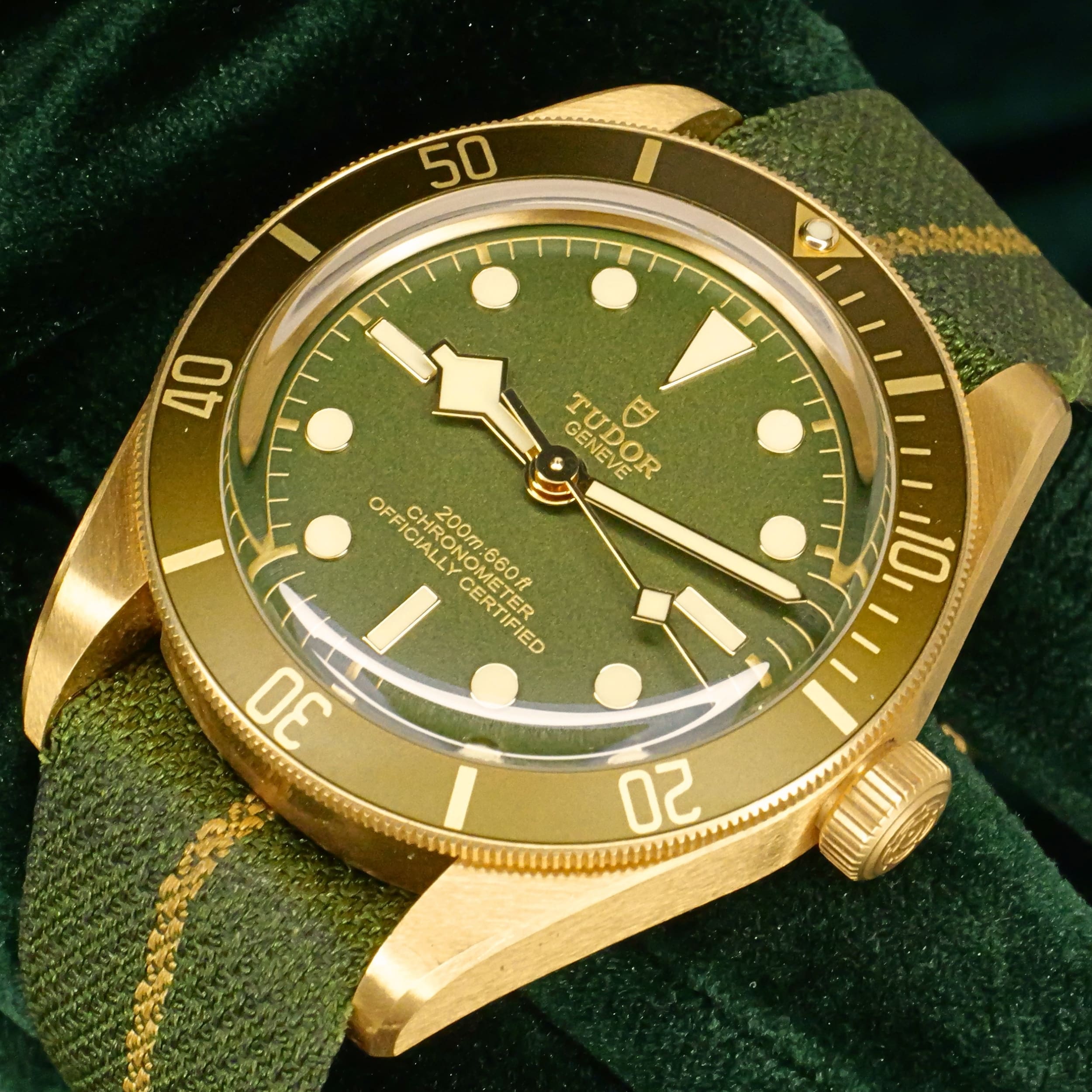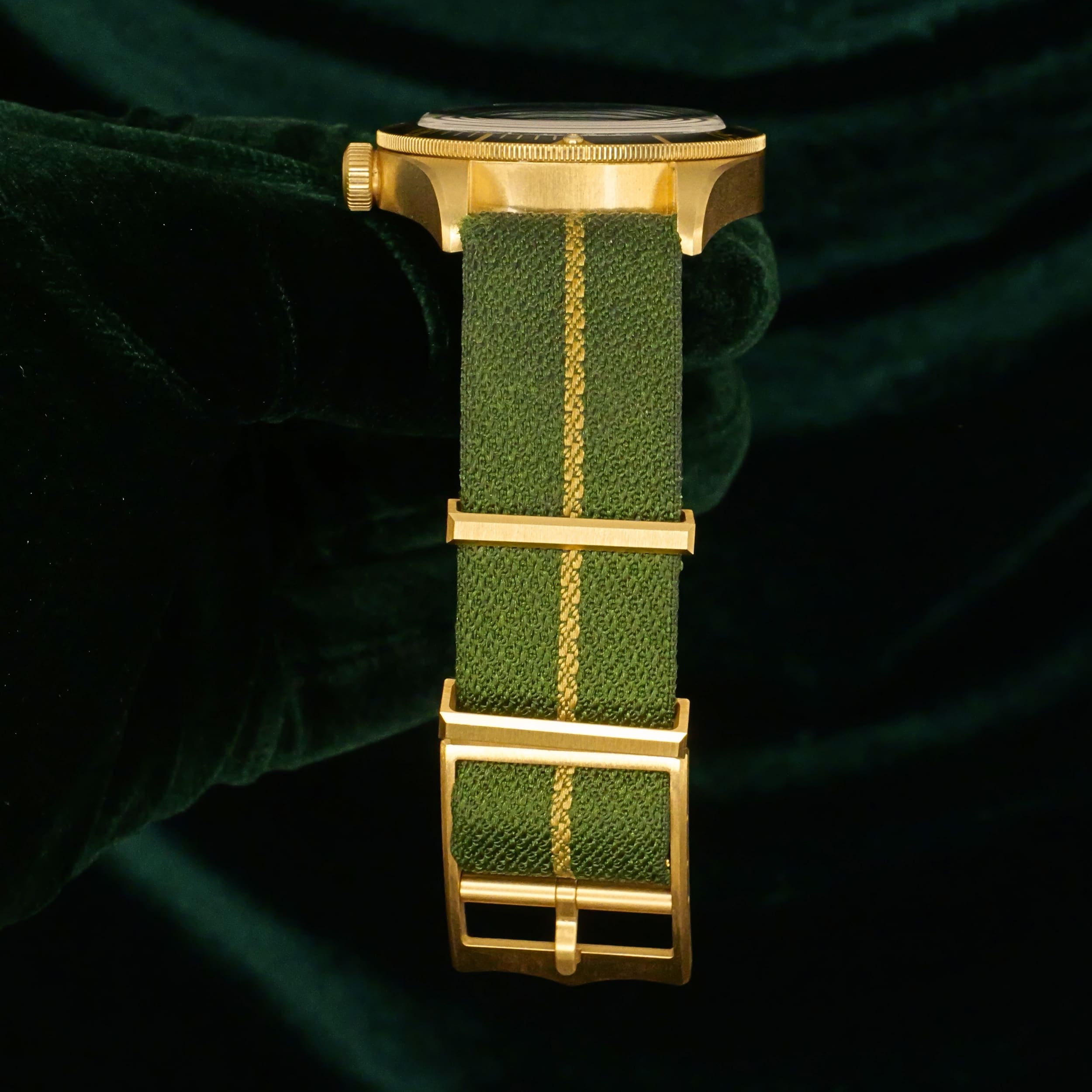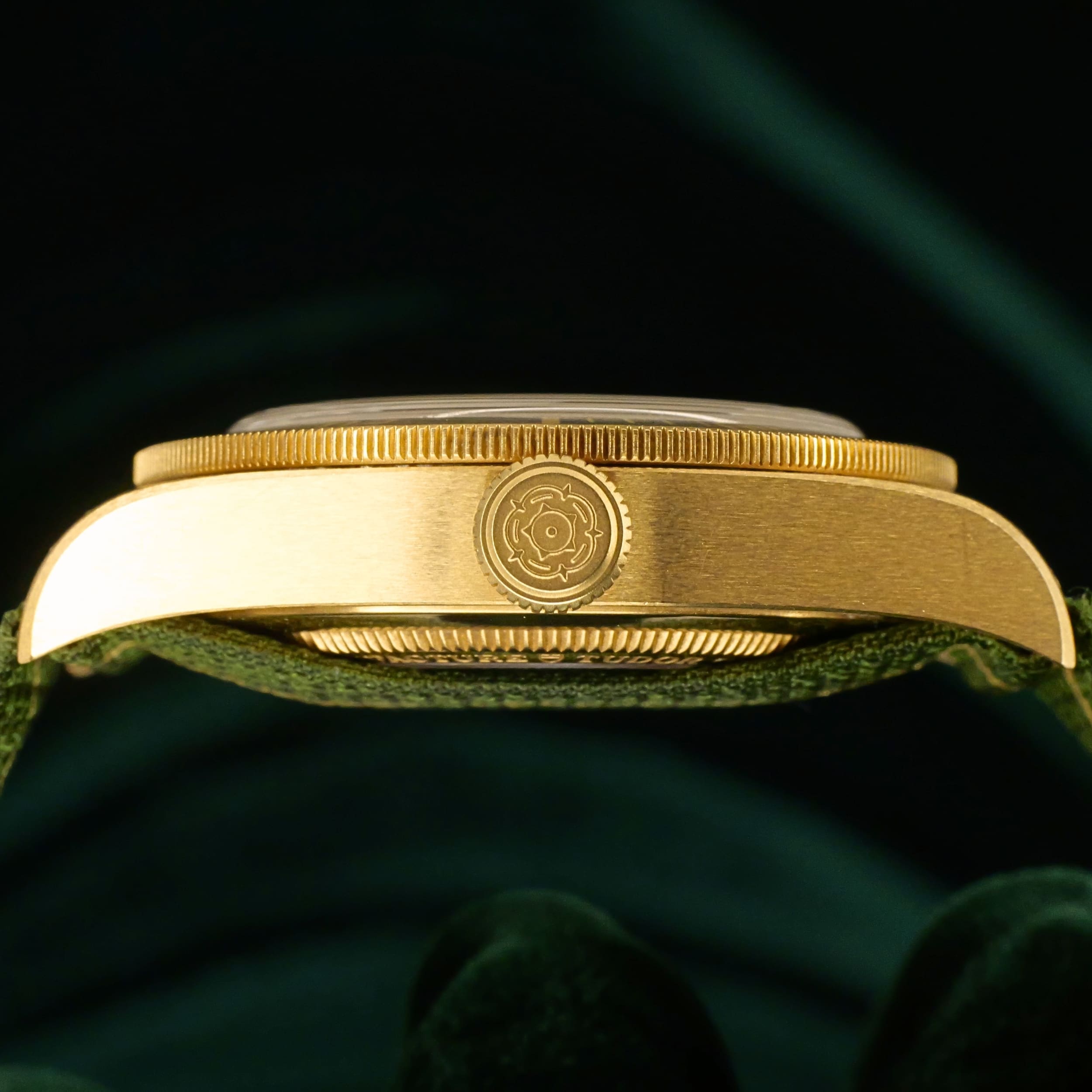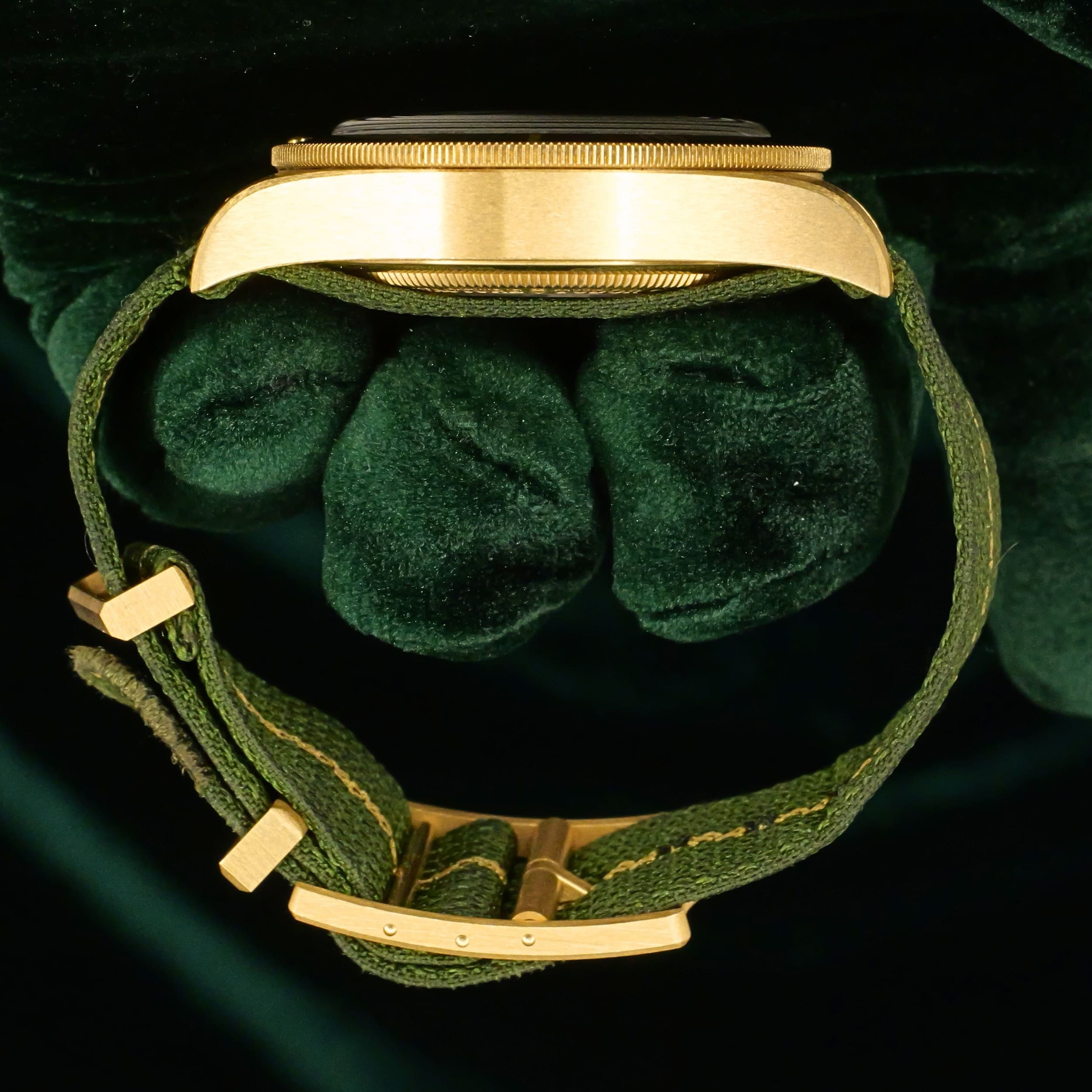 As sunlight settles across olive‑green terrain, this timepiece’s dial and bezel carry a warm, natural tone that feels both grounded and refined. Ideal for collectors who want a diver with real precious metal presence but a more understated, earthy character.