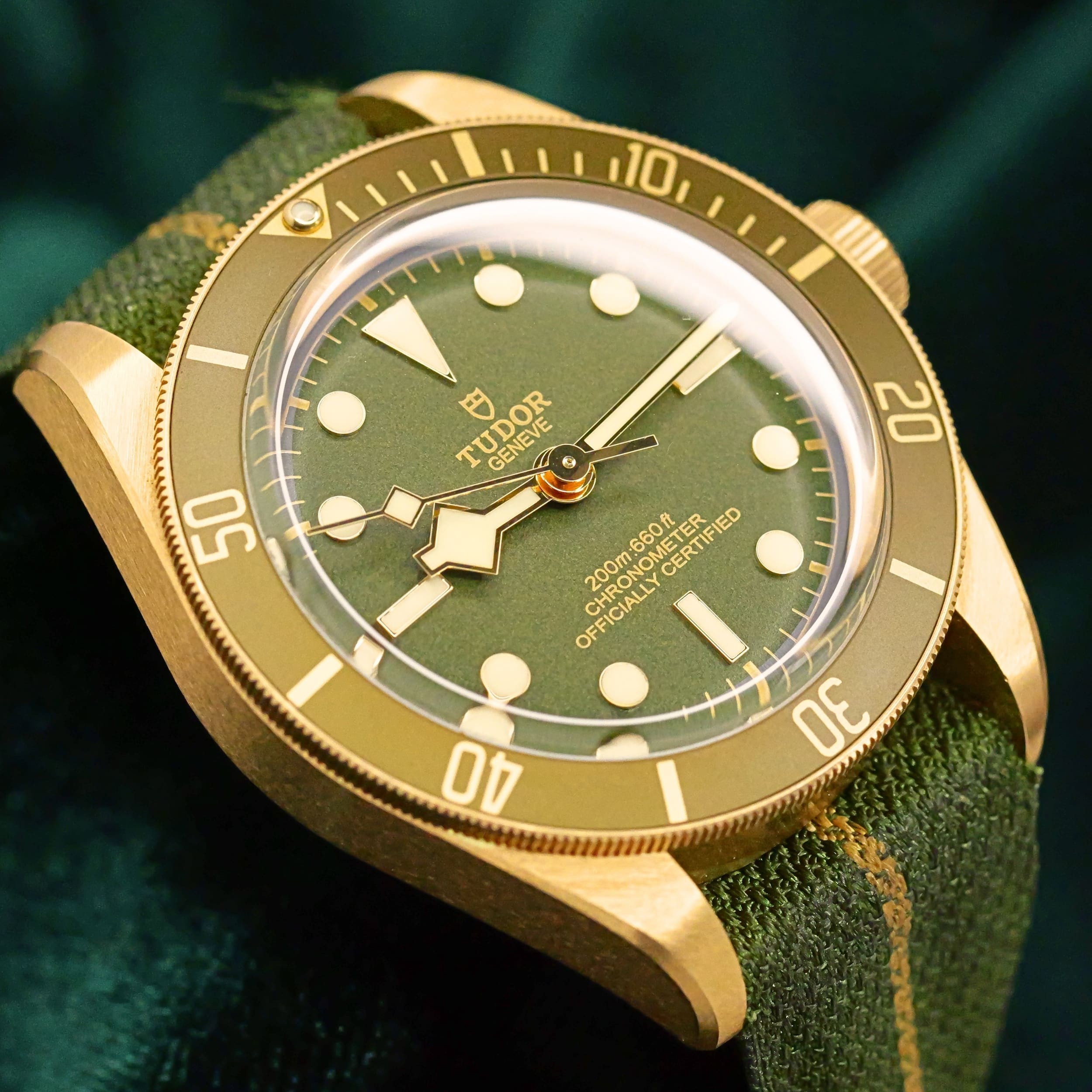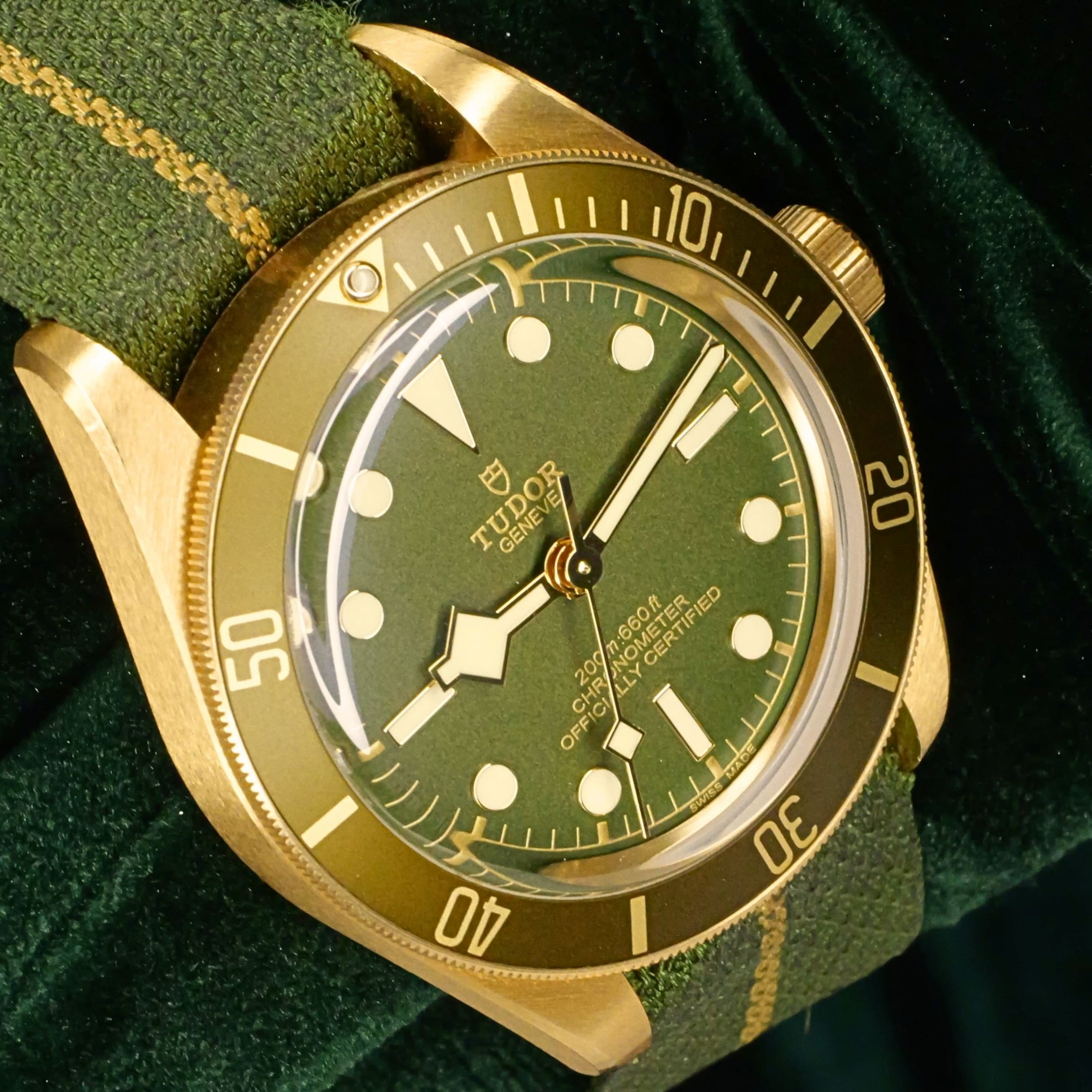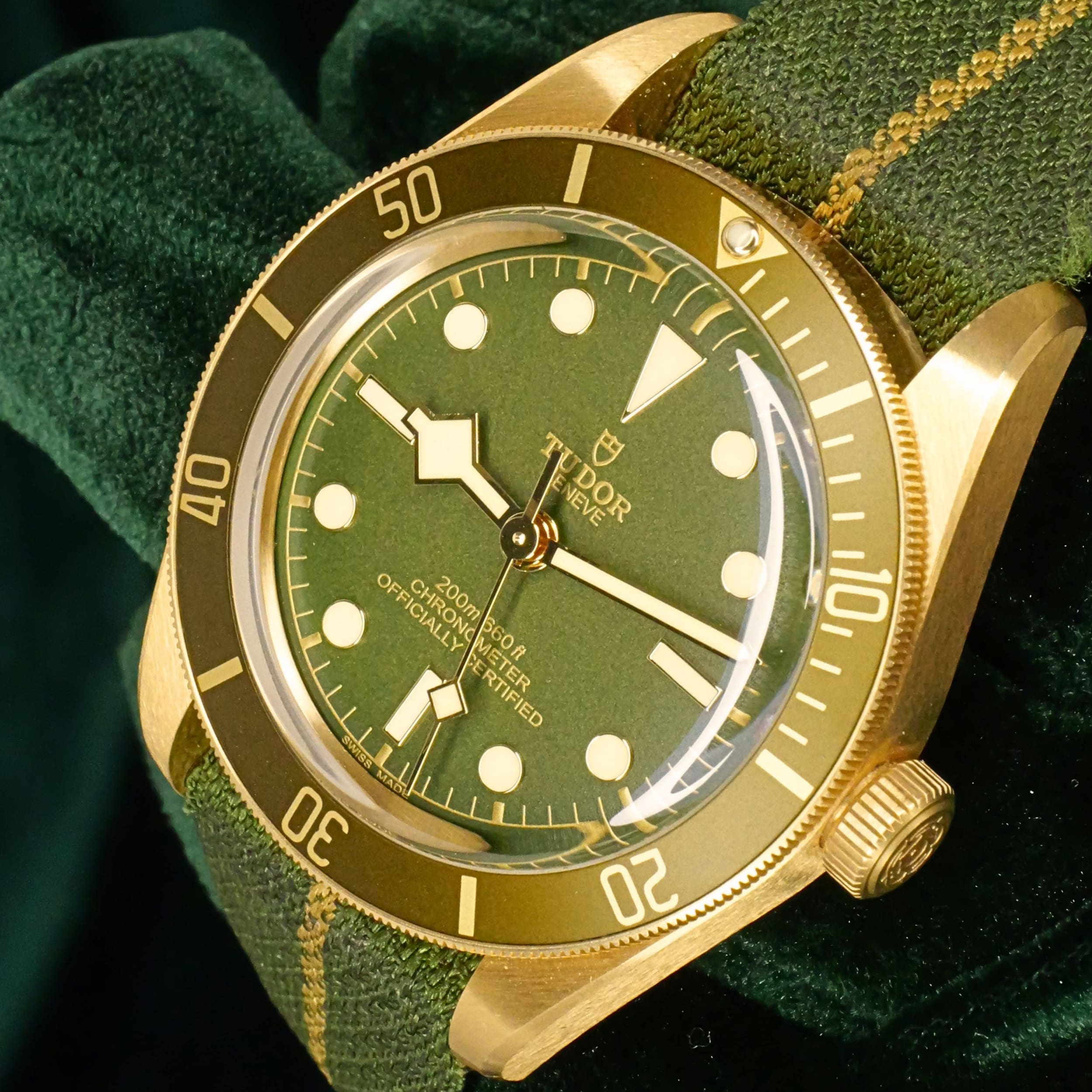As sunlight settles across olive‑green terrain, this timepiece’s dial and bezel carry a warm, natural tone that feels both grounded and refined. Ideal for collectors who want a diver with real precious metal presence but a more understated, earthy character.