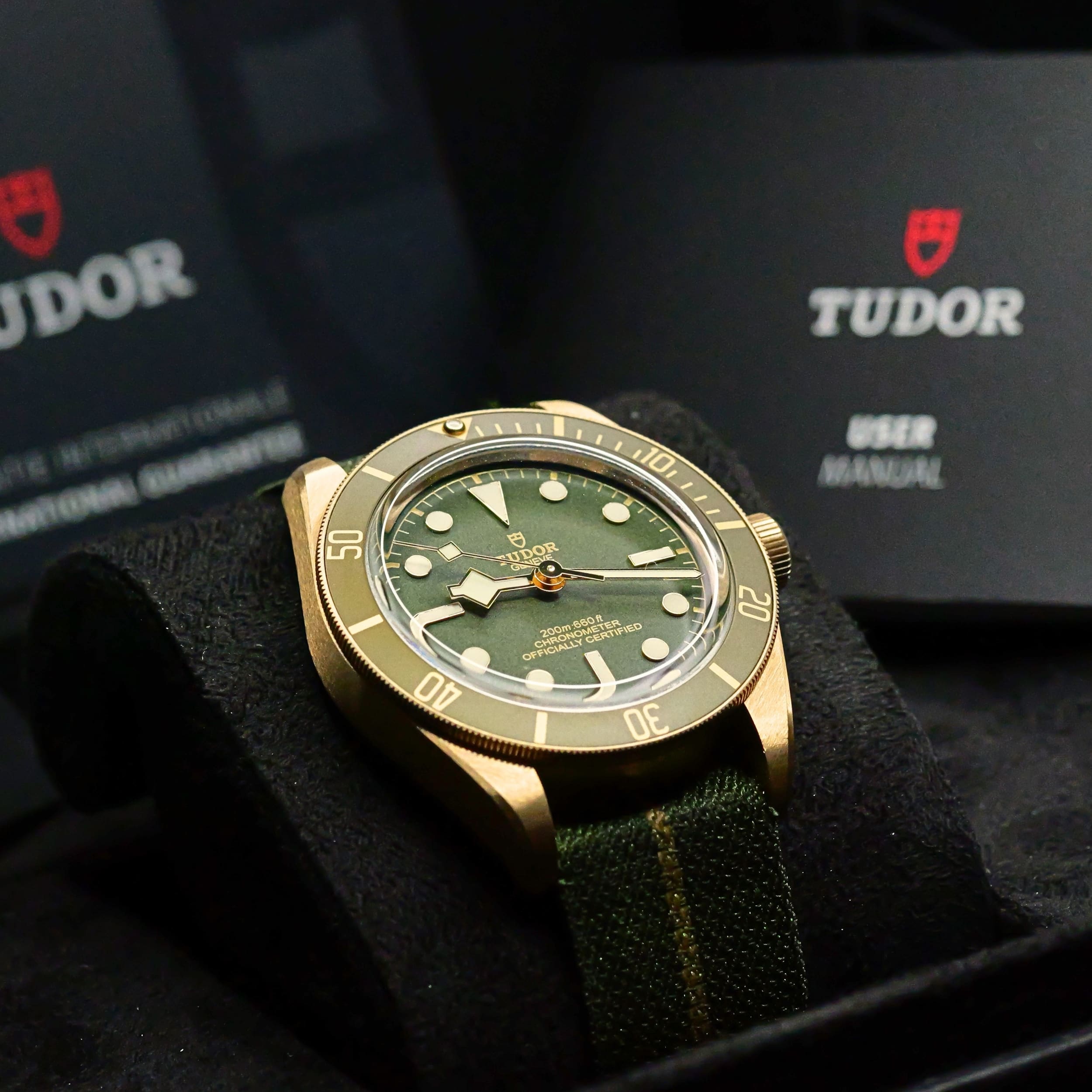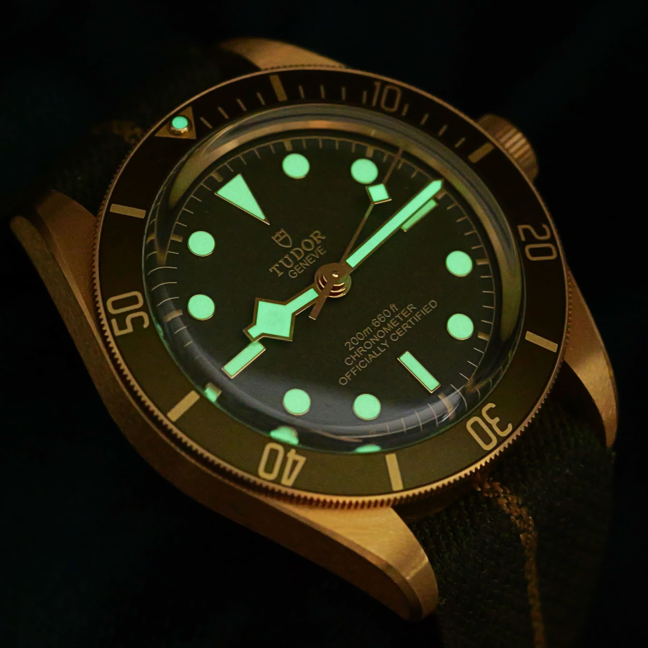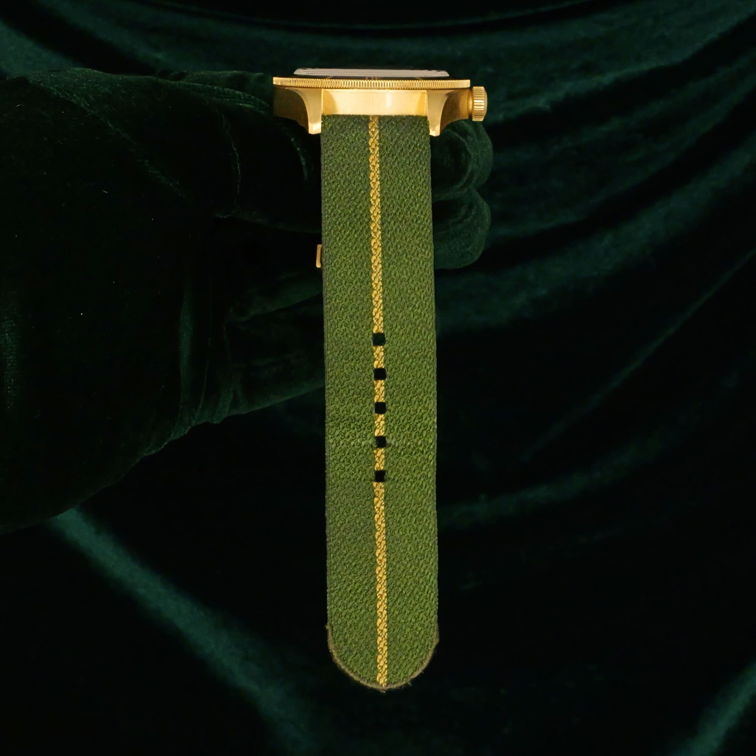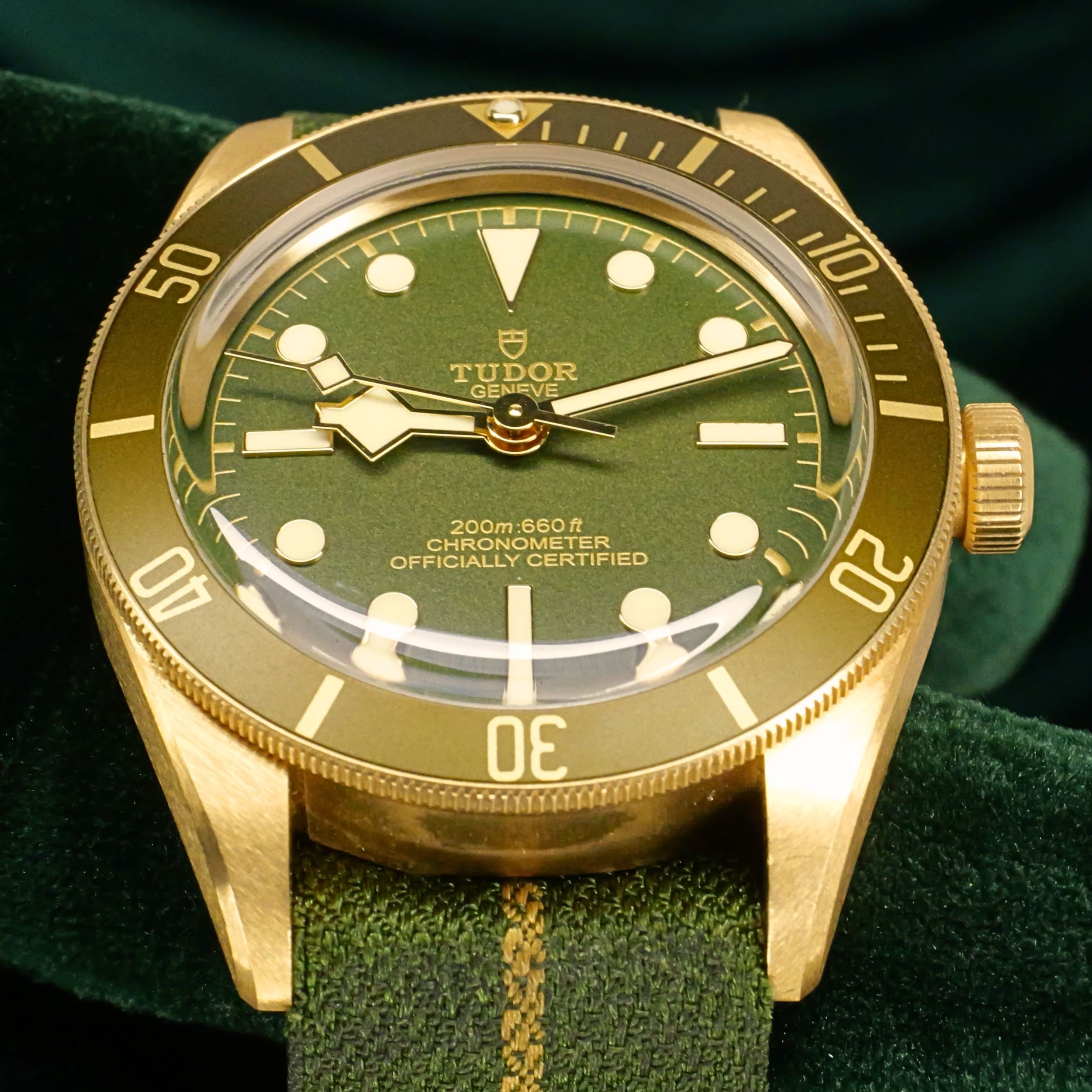 As sunlight settles across olive‑green terrain, this timepiece’s dial and bezel carry a warm, natural tone that feels both grounded and refined. Ideal for collectors who want a diver with real precious metal presence but a more understated, earthy character.