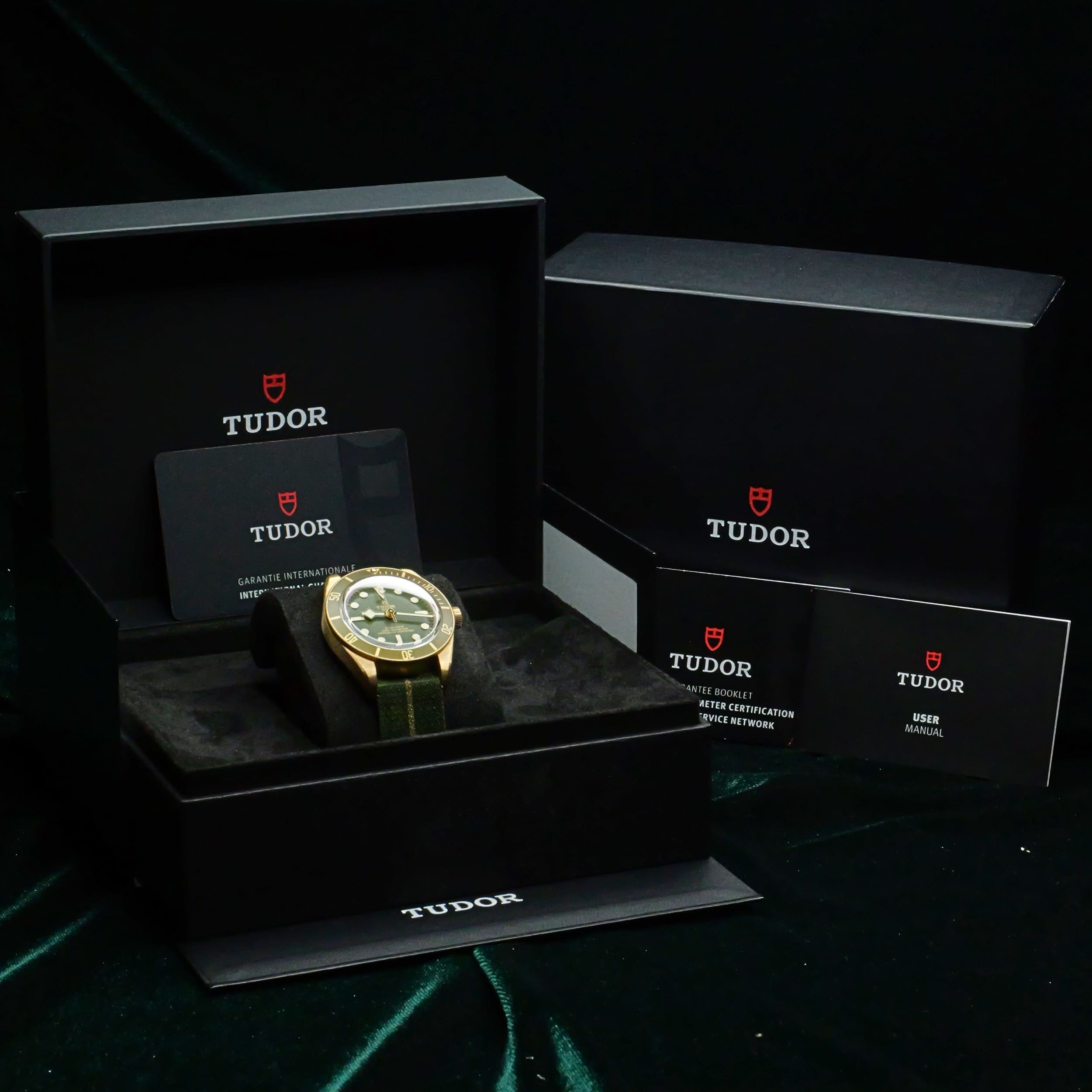 Comes as a full set, double-boxed, including the watch pillow, warranty card, user manual, and guarantee booklet.
