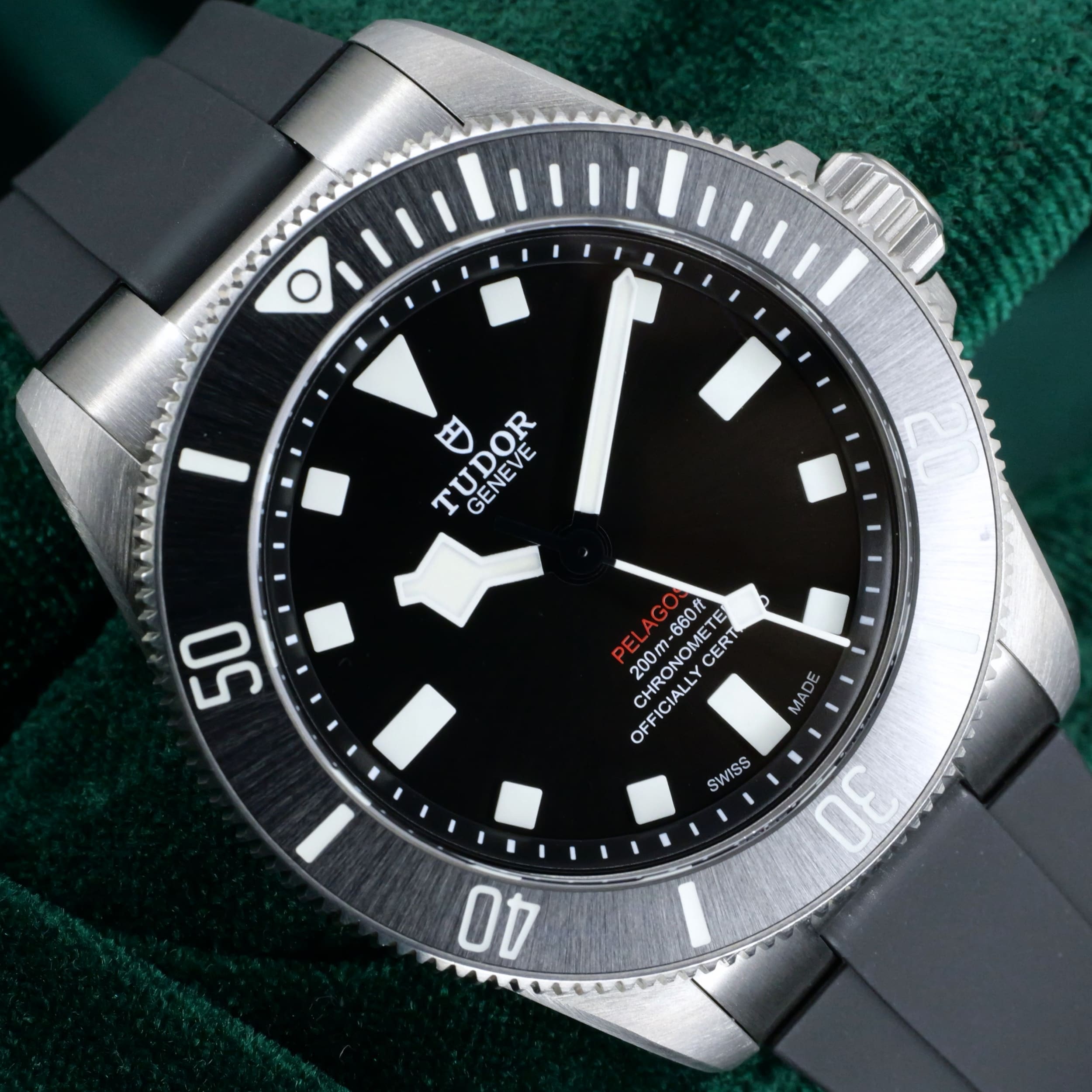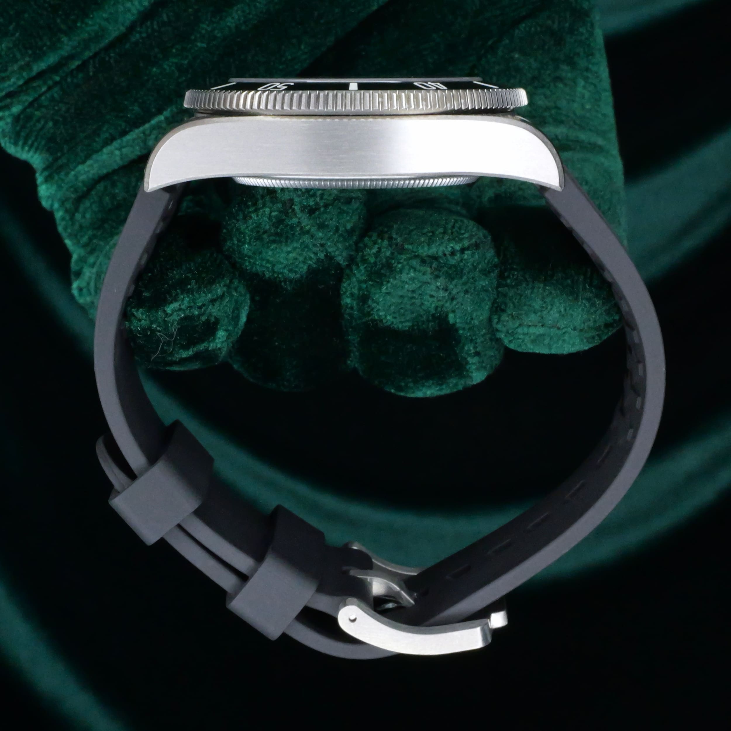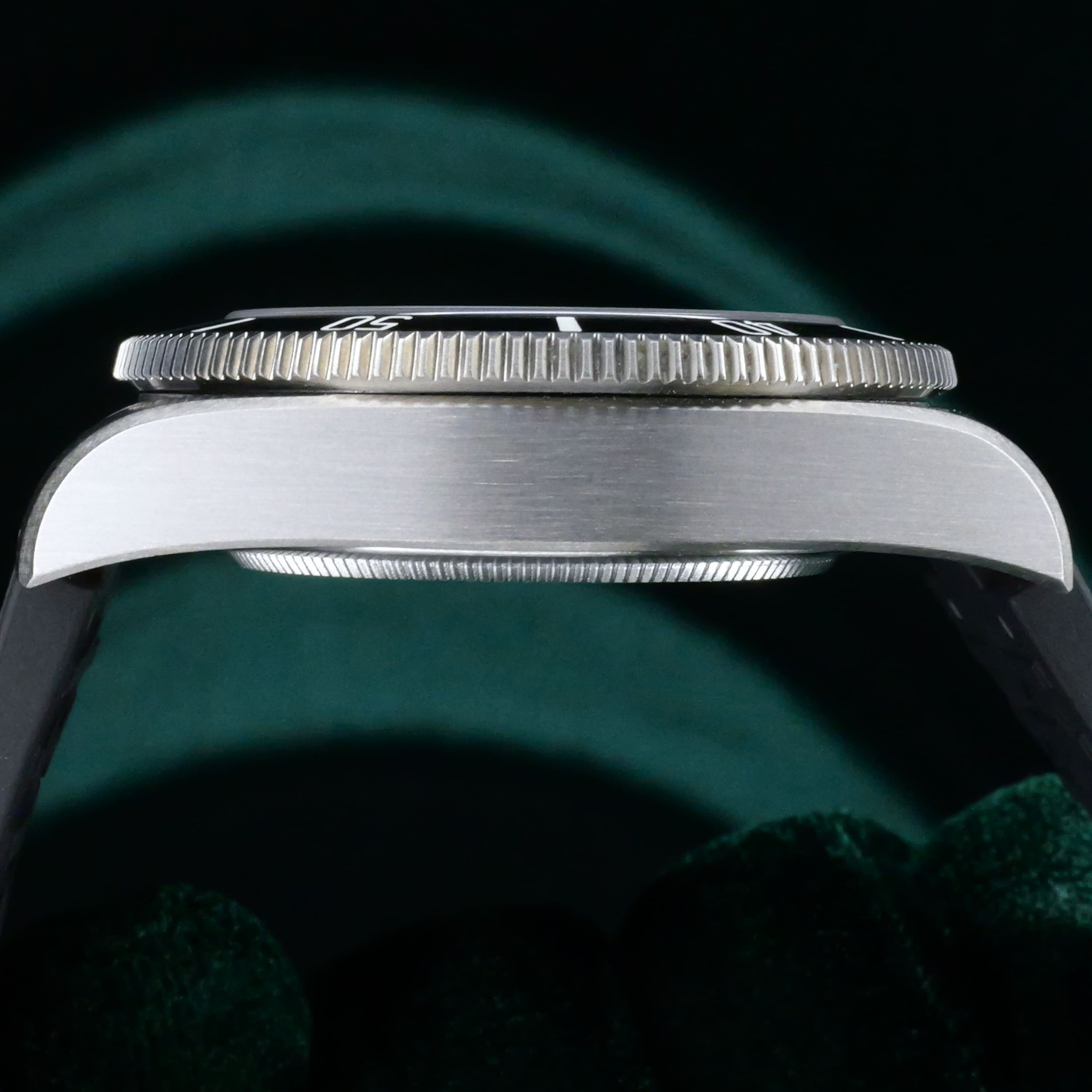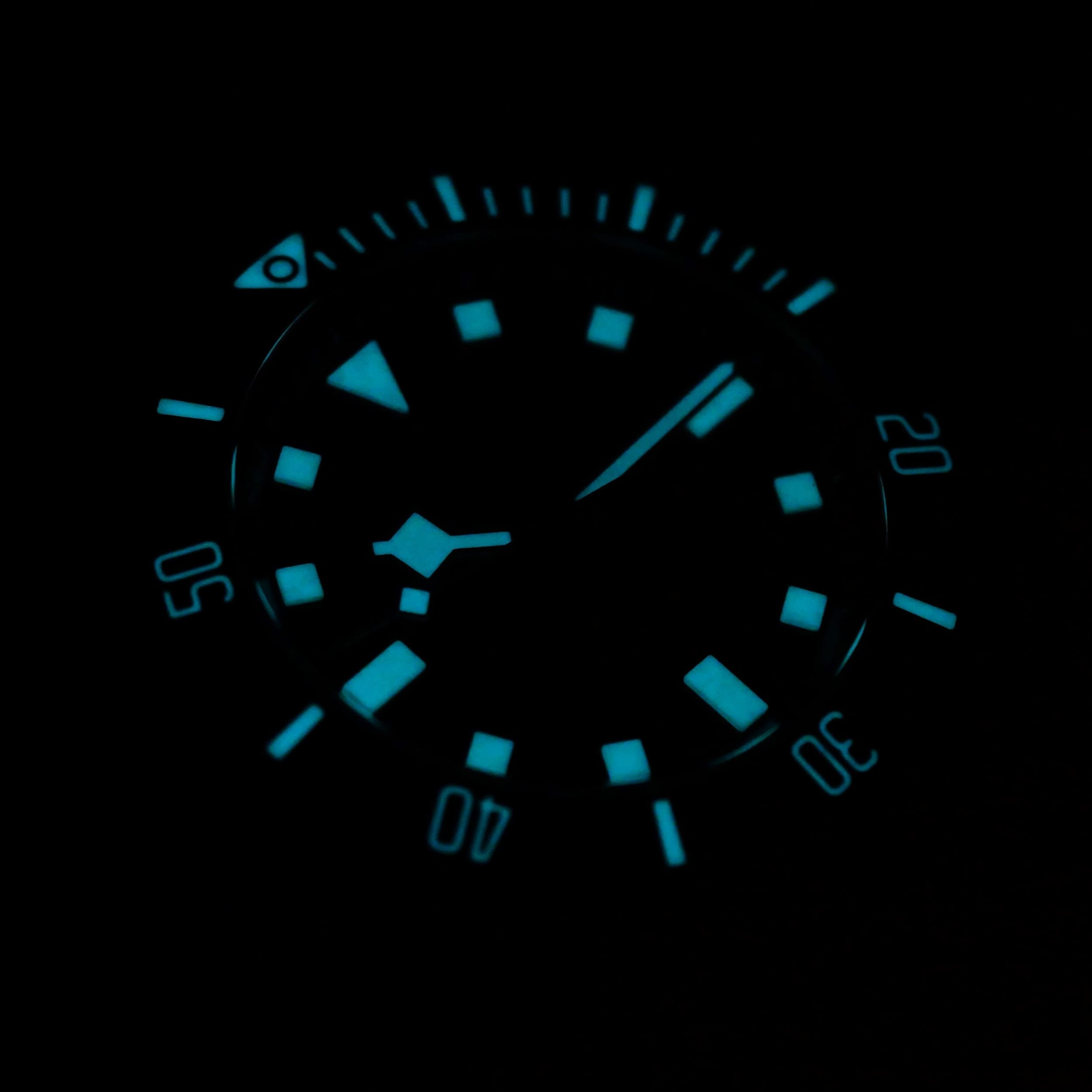 Presents itself in mint condition with little to no signs of wear. Combining the black dial with matte black bezel makes it ideal for those wanting a blacked-out aesthetic. The knurled grip on the rotating bezel ensures reliable single-hand operation even with dive gloves. With the combination of luminous features on the dial and bezel, the wearer will be provided with generous visibility in low-light conditions.