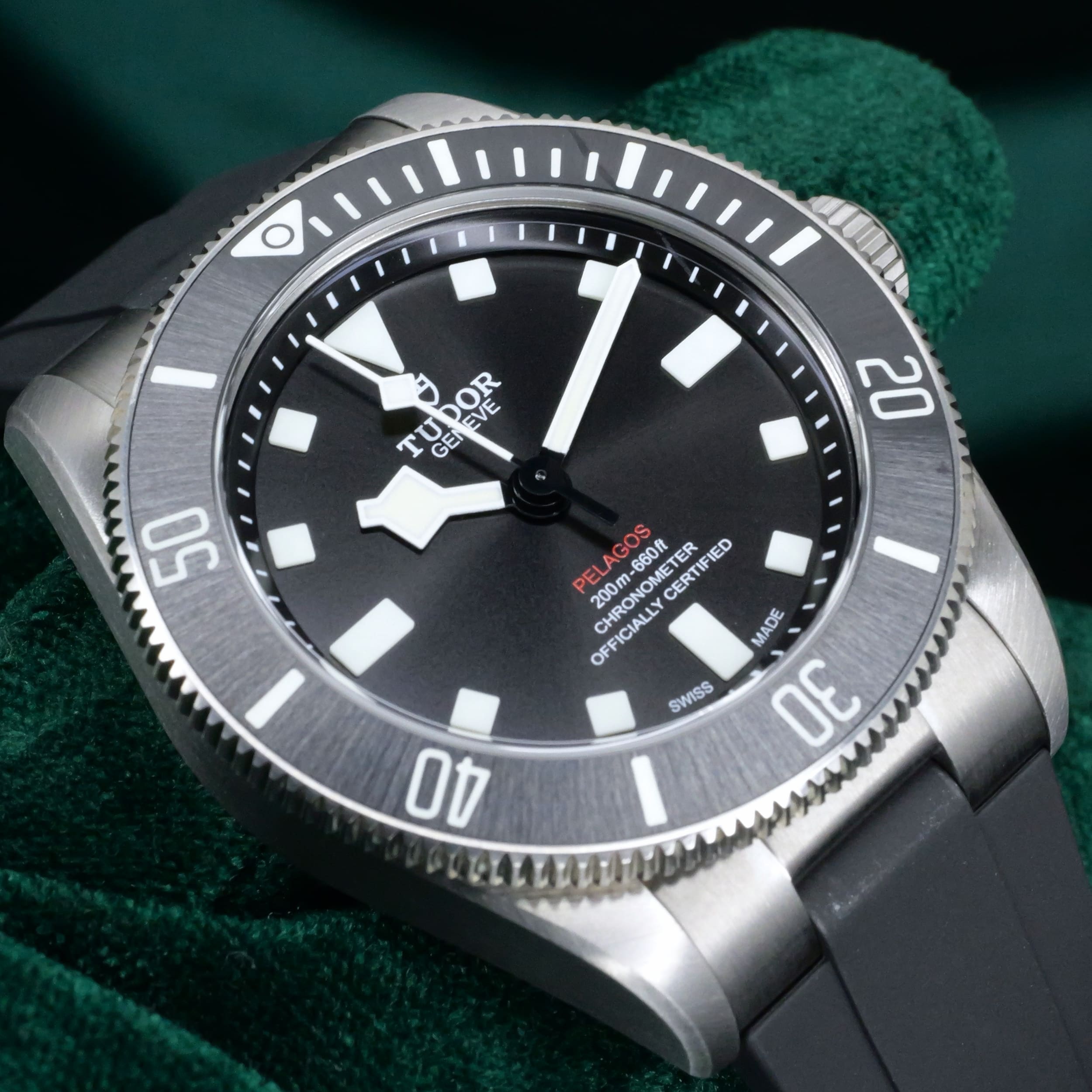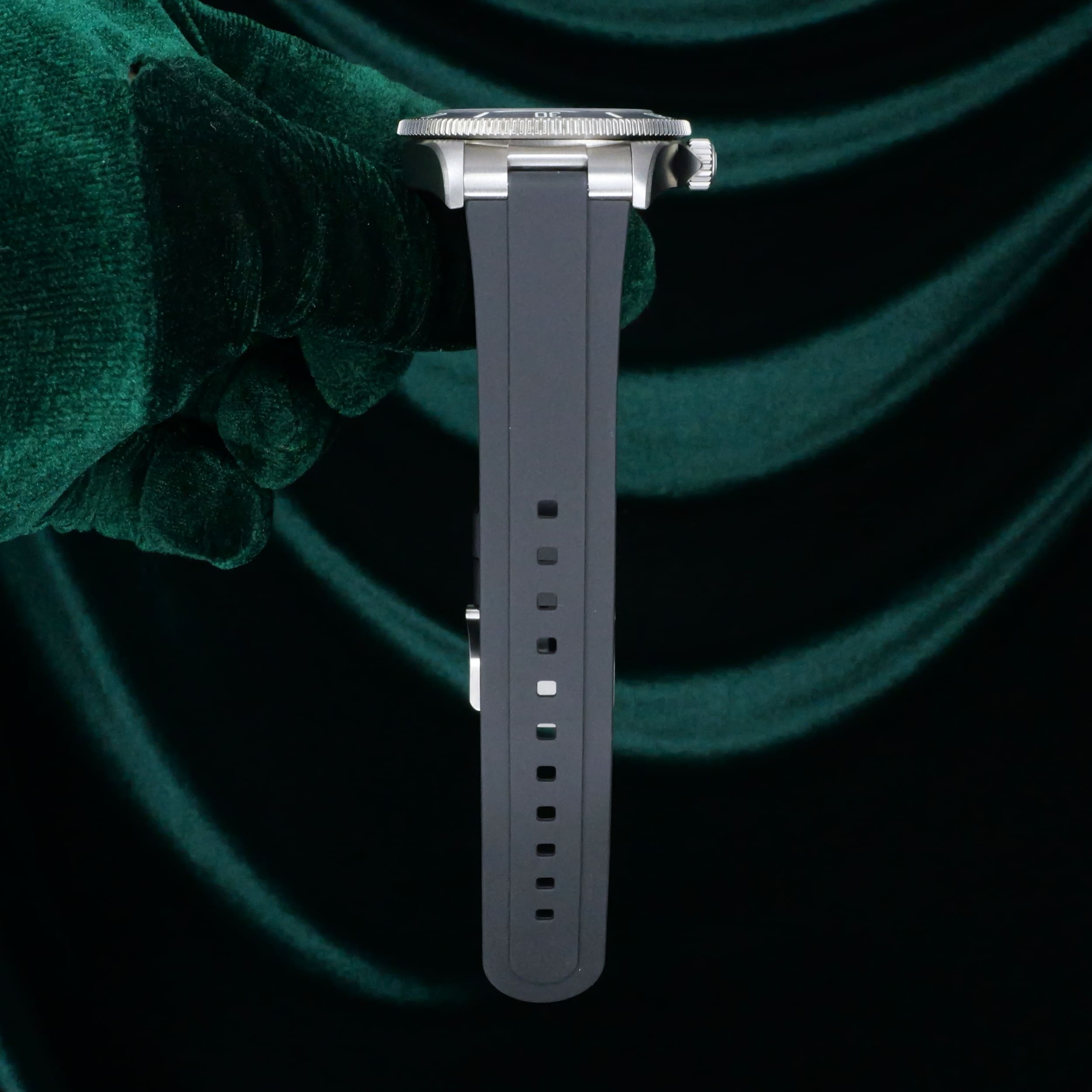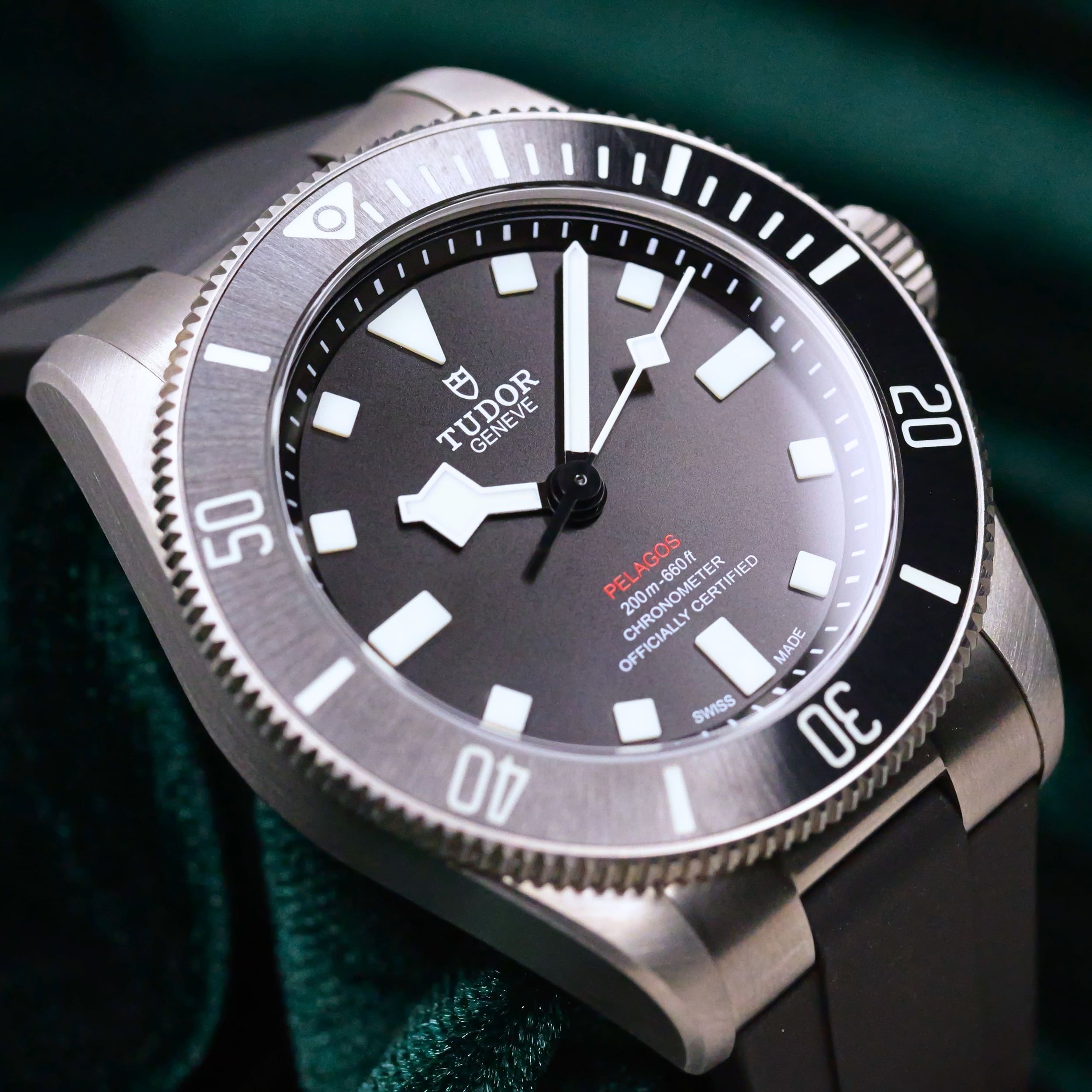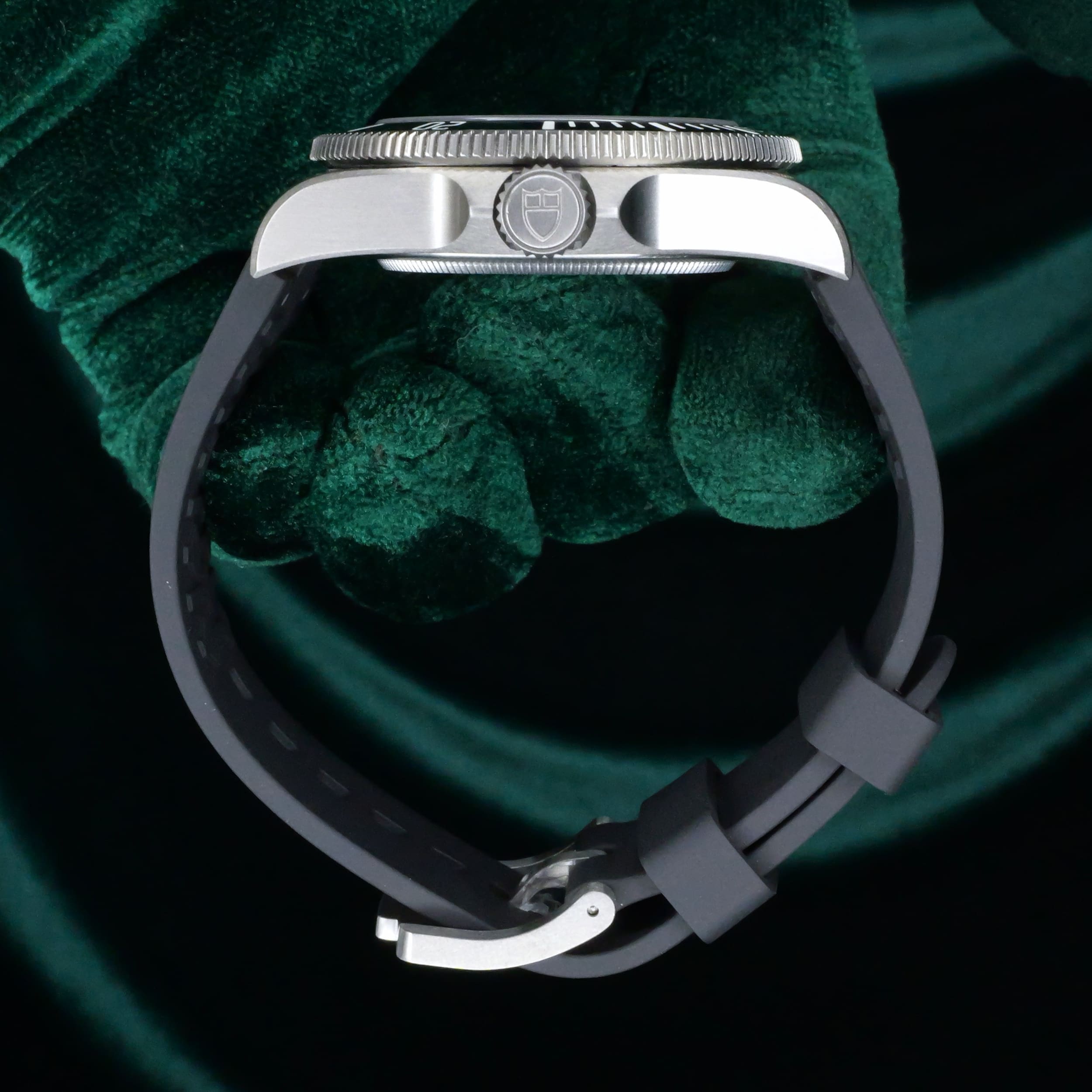 Encased entirely in grade 2 titanium with a 39mm profile makes this reference highly versatile in wereability and professional dive capability. Small enough to fit under a dress shirt cuff with a slim 42mm lug-to-lug measurement makes it a rare feat for a typical professional dive watch.