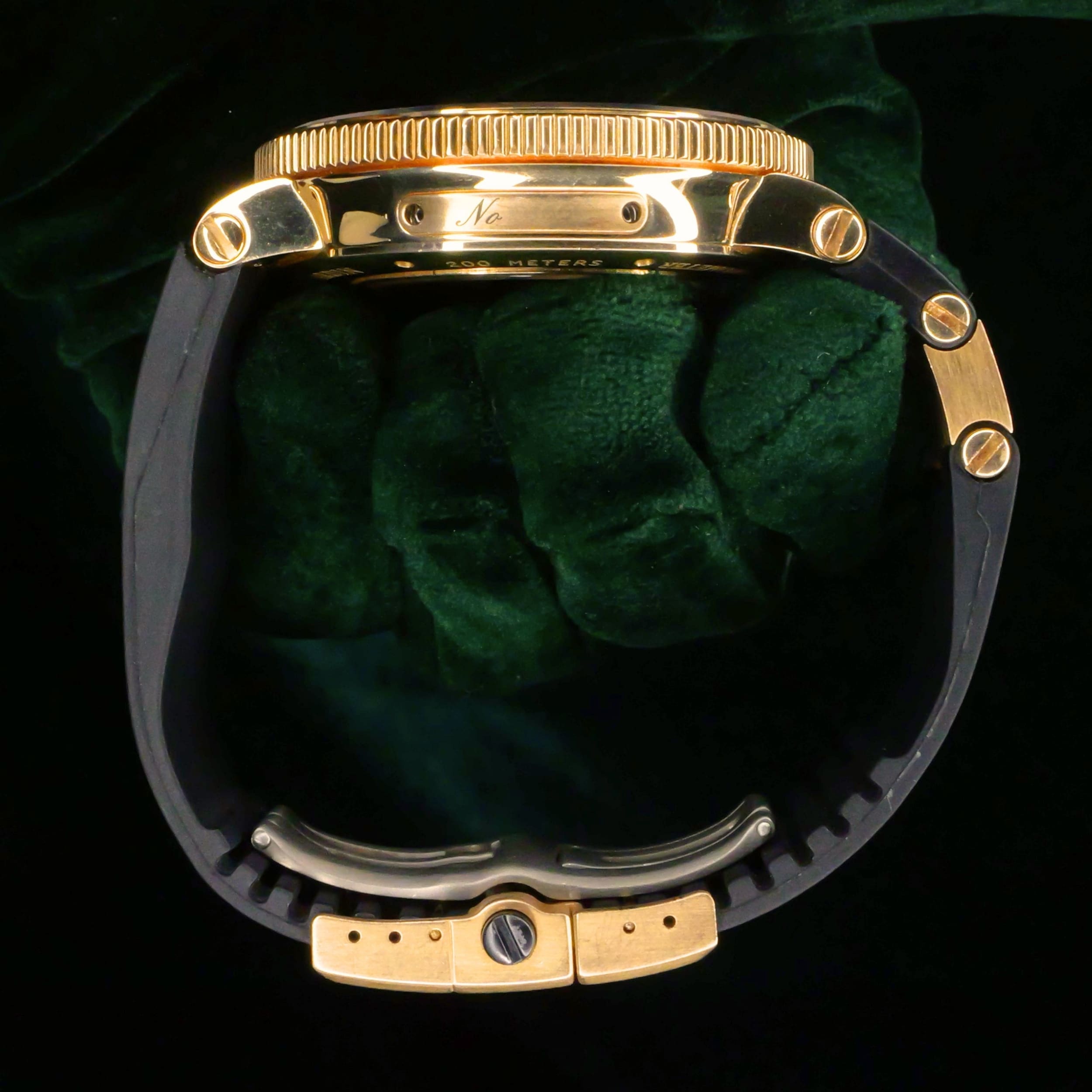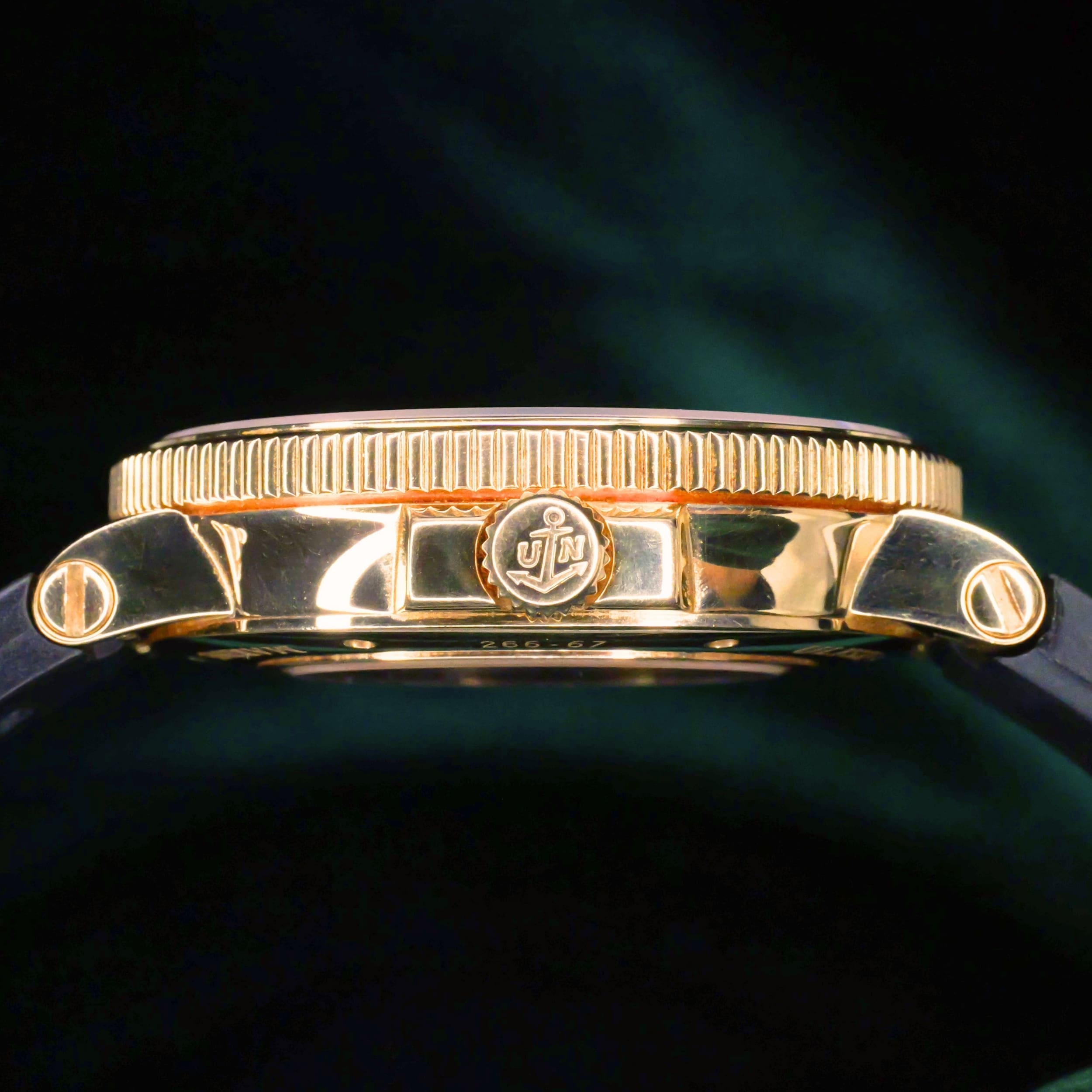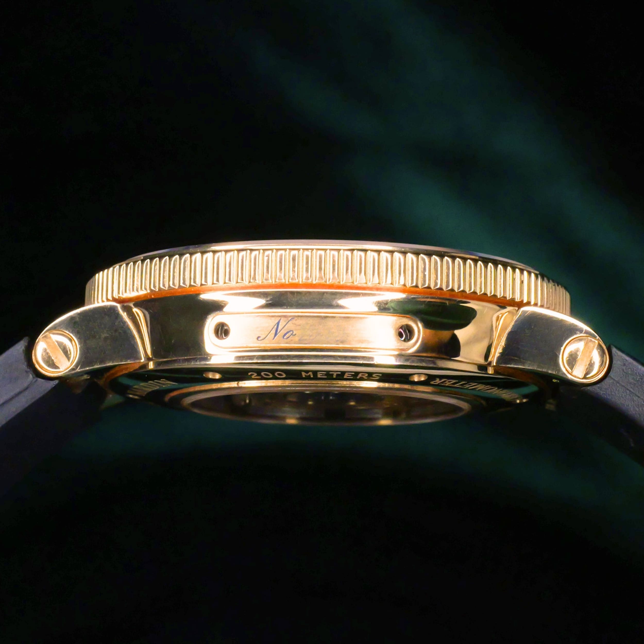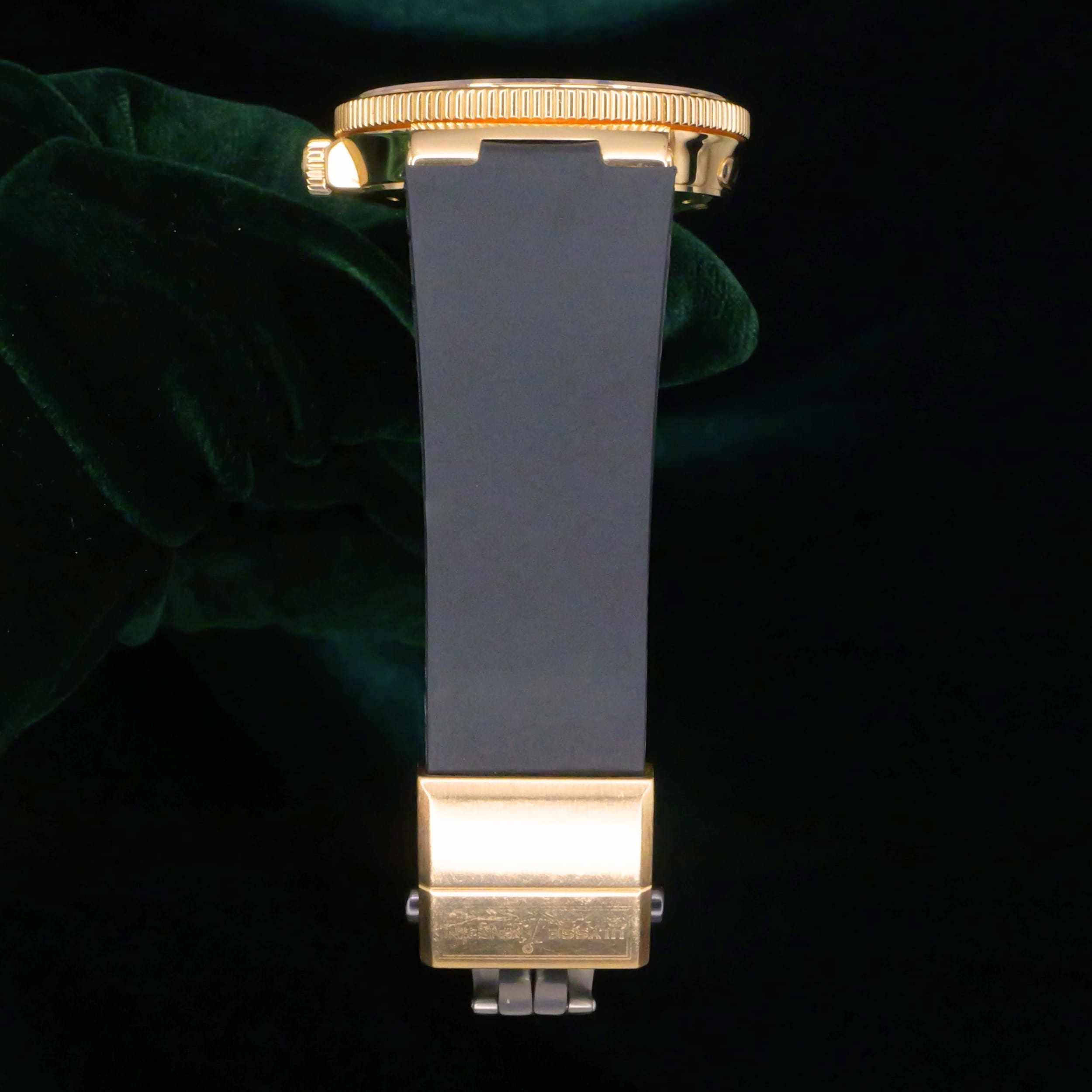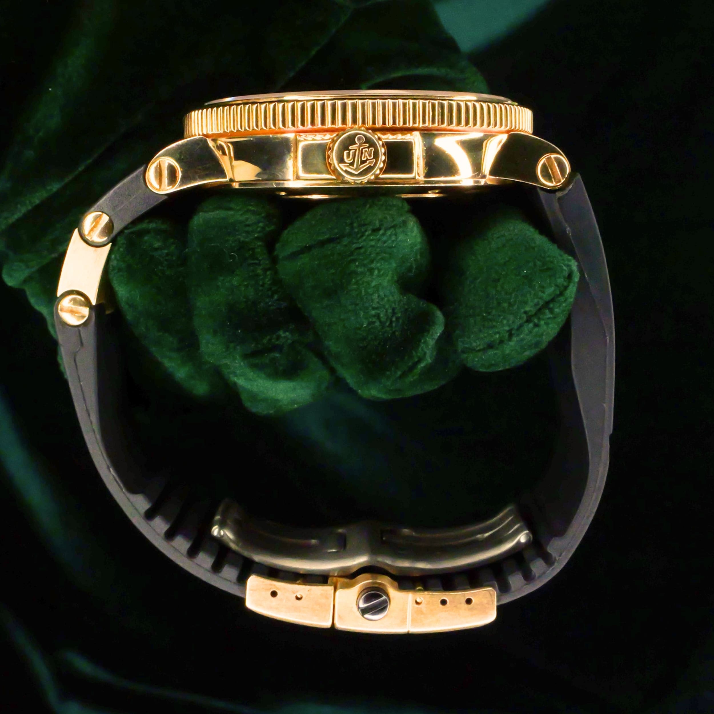 Presents itself in mint condition with little to no signs of wear. The full rose gold case carries a rich, warm tone with polished surfaces that reflect light smoothly across the lugs and case edges. The black dial features a subtle wave texture that creates depth beneath the applied rose gold Roman numerals, giving the watch a layered and dimensional look as lighting shifts. Completing the design, the black rubber strap adds a clean, matte contrast while maintaining a comfortable and secure fit on the wrist.