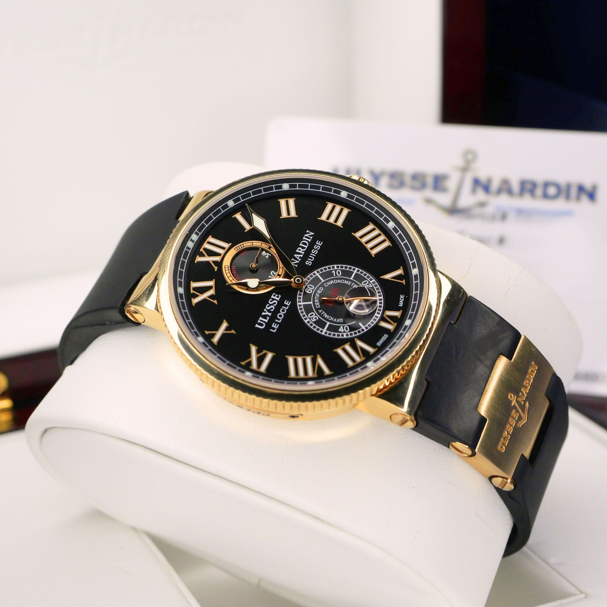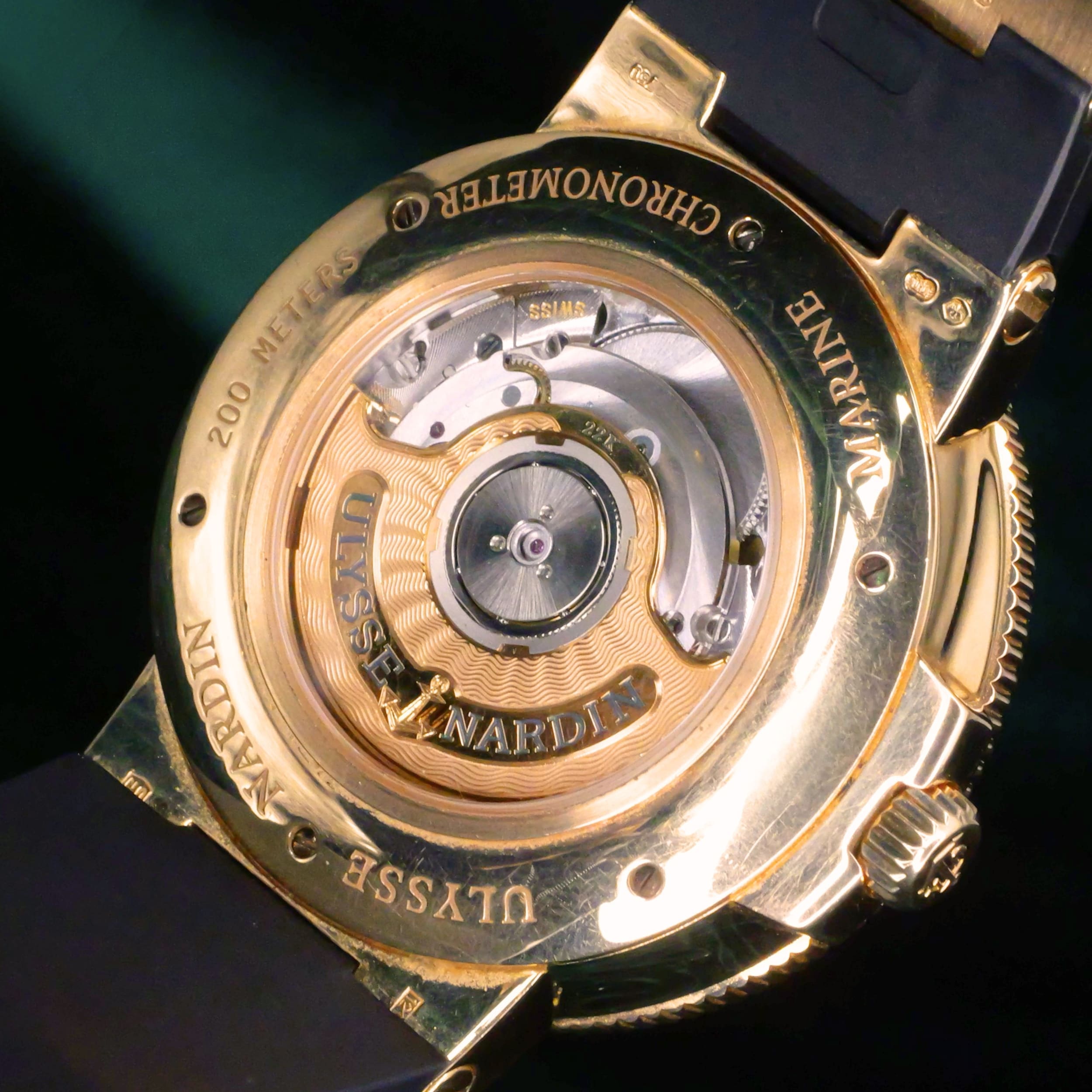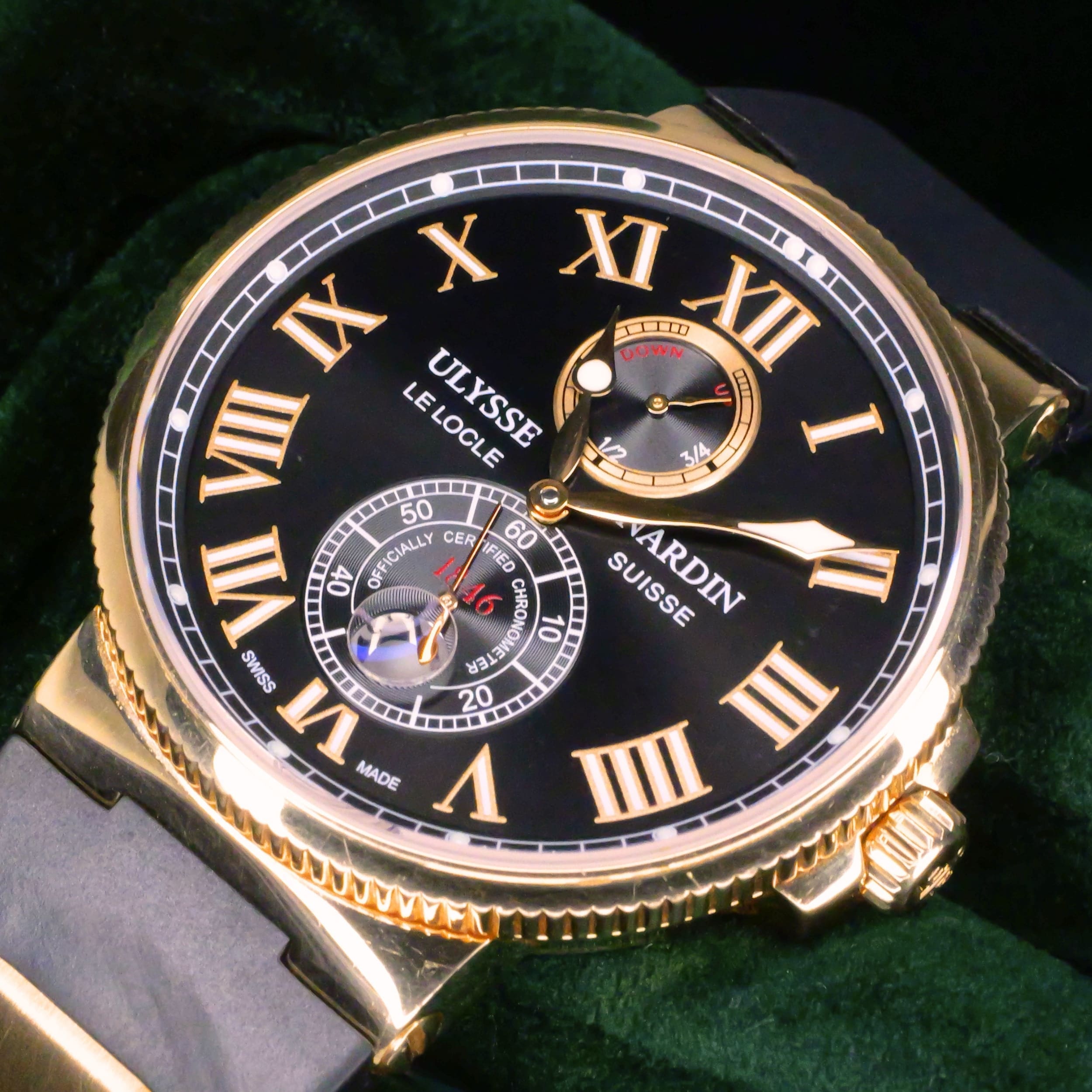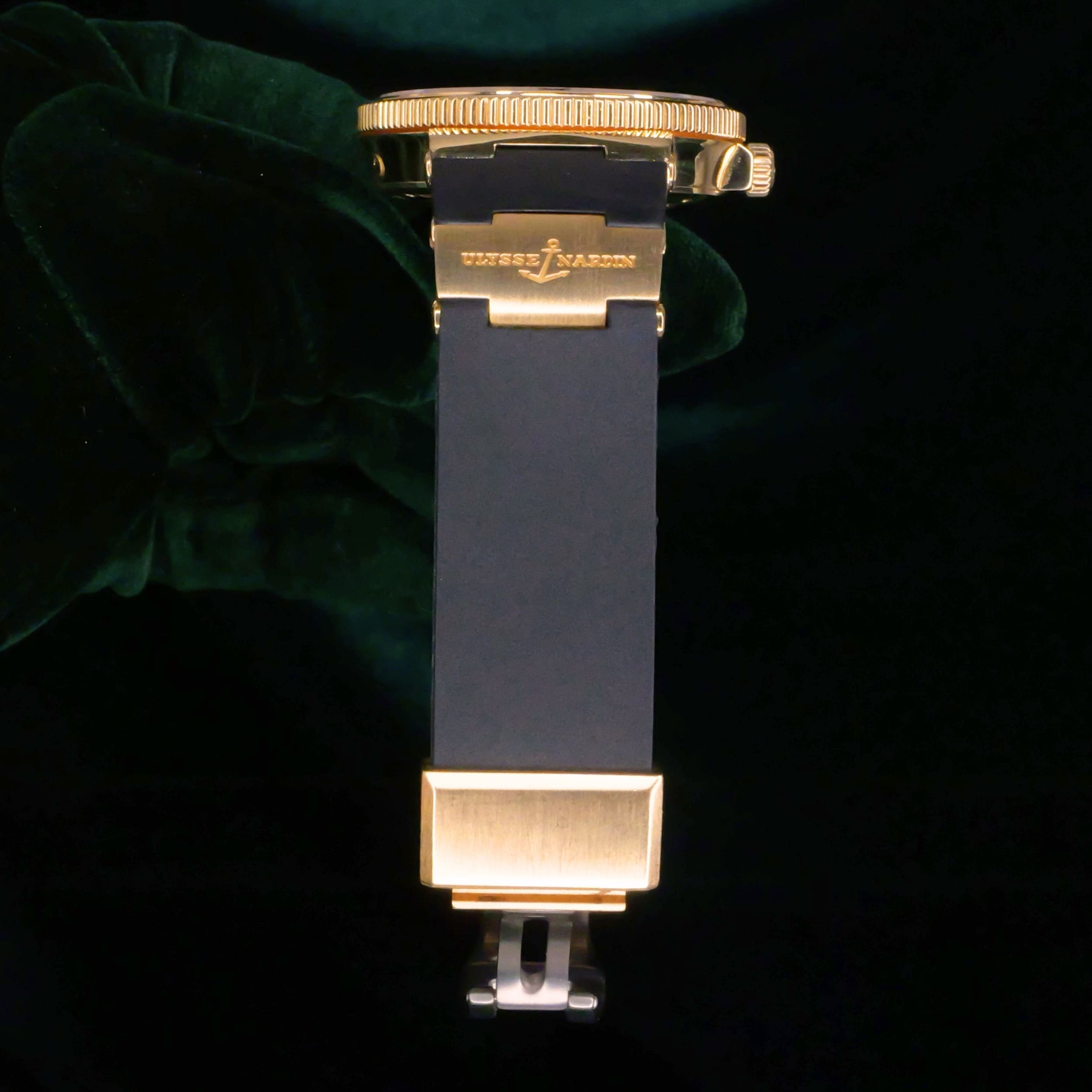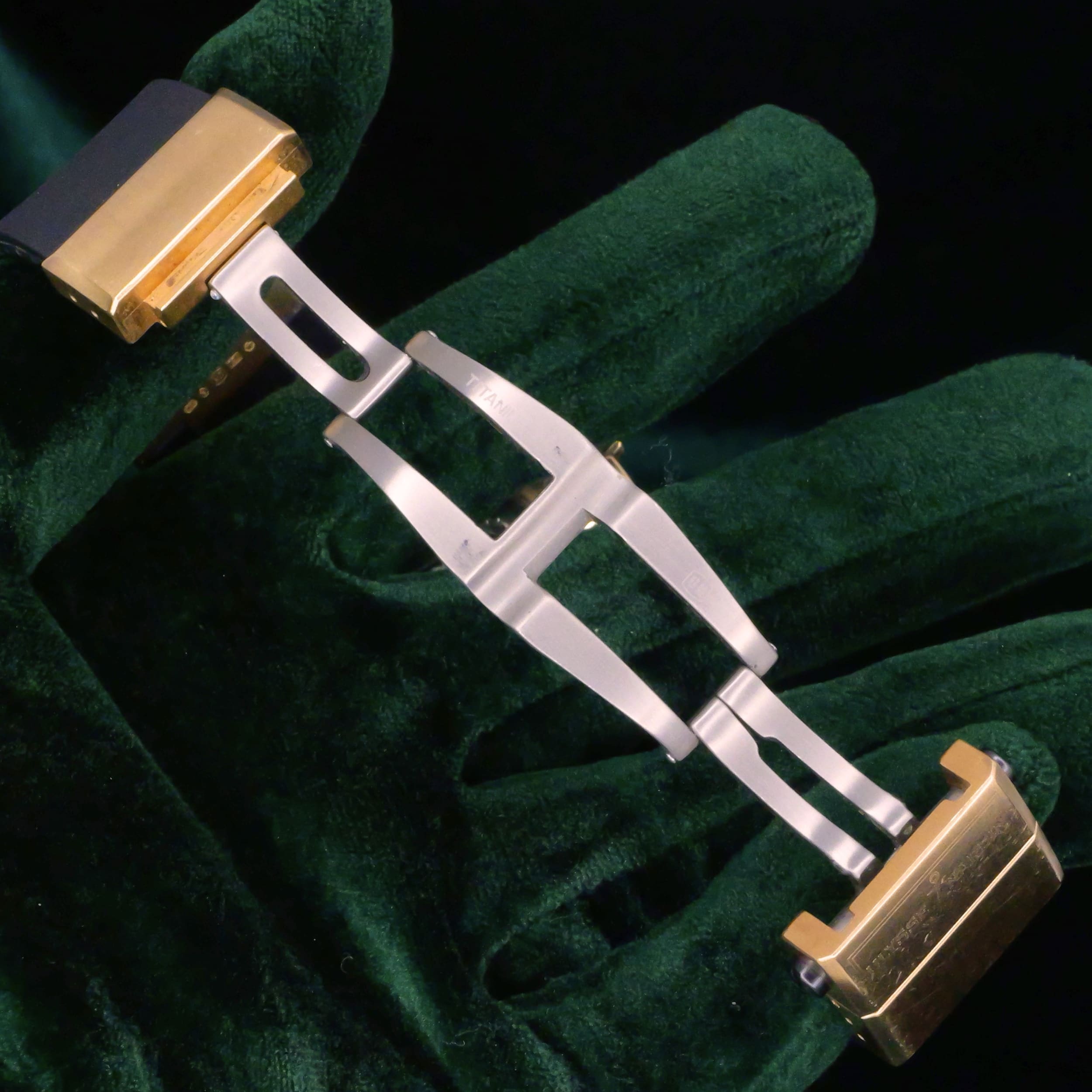 Presents itself in mint condition with little to no signs of wear. The full rose gold case carries a rich, warm tone with polished surfaces that reflect light smoothly across the lugs and case edges. The black dial features a subtle wave texture that creates depth beneath the applied rose gold Roman numerals, giving the watch a layered and dimensional look as lighting shifts. Completing the design, the black rubber strap adds a clean, matte contrast while maintaining a comfortable and secure fit on the wrist.