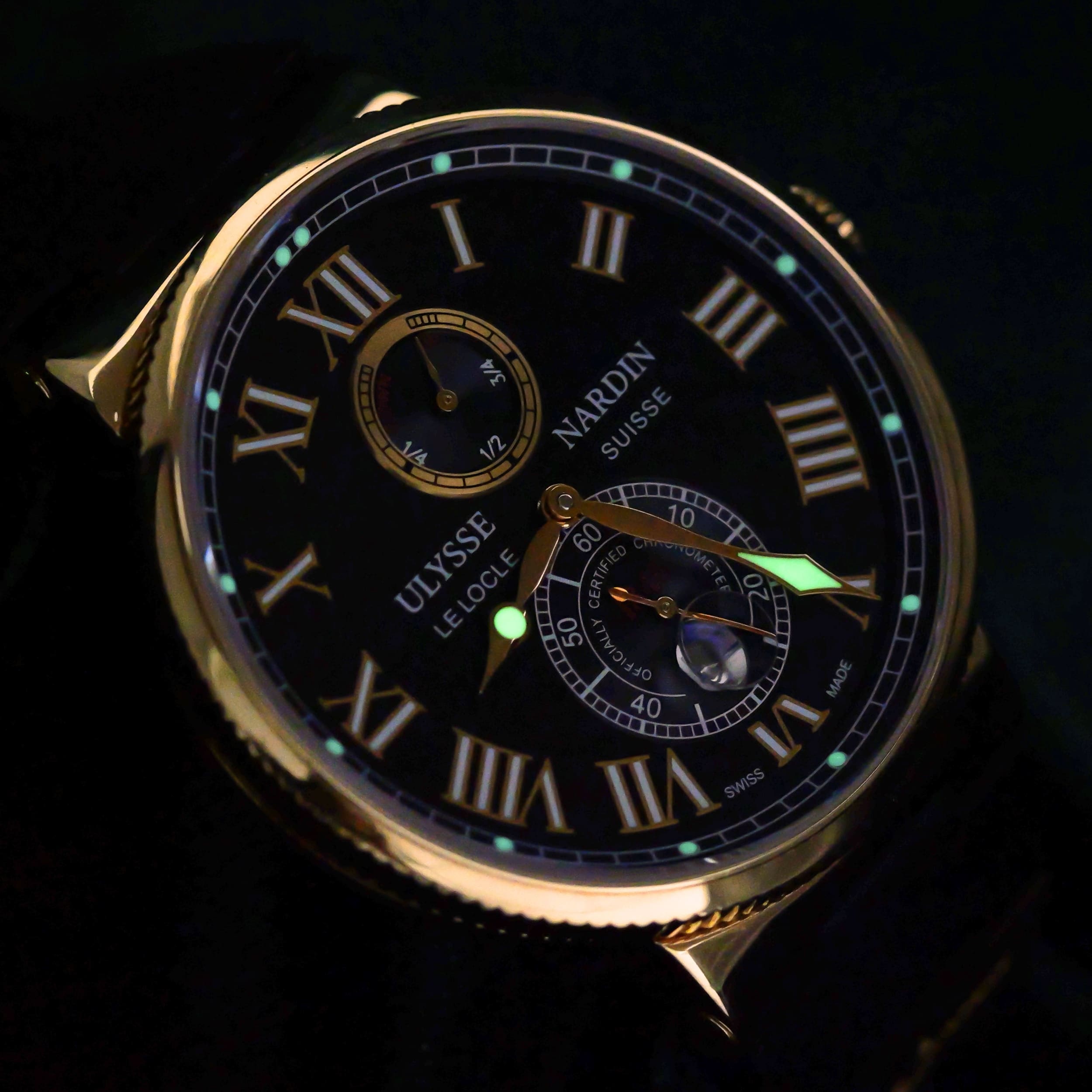 Functions include hours, minutes, small seconds, date, and power reserve indicator. Pulling the crown to the first position allows for quick adjustment of the date, while the outermost position sets the time by moving the hour and minute hands together. The power reserve display updates in real time as the watch is wound, adding both functionality and visual movement to the dial. Lume is present on the hands and hour markers, providing a soft glow in low-light conditions.
