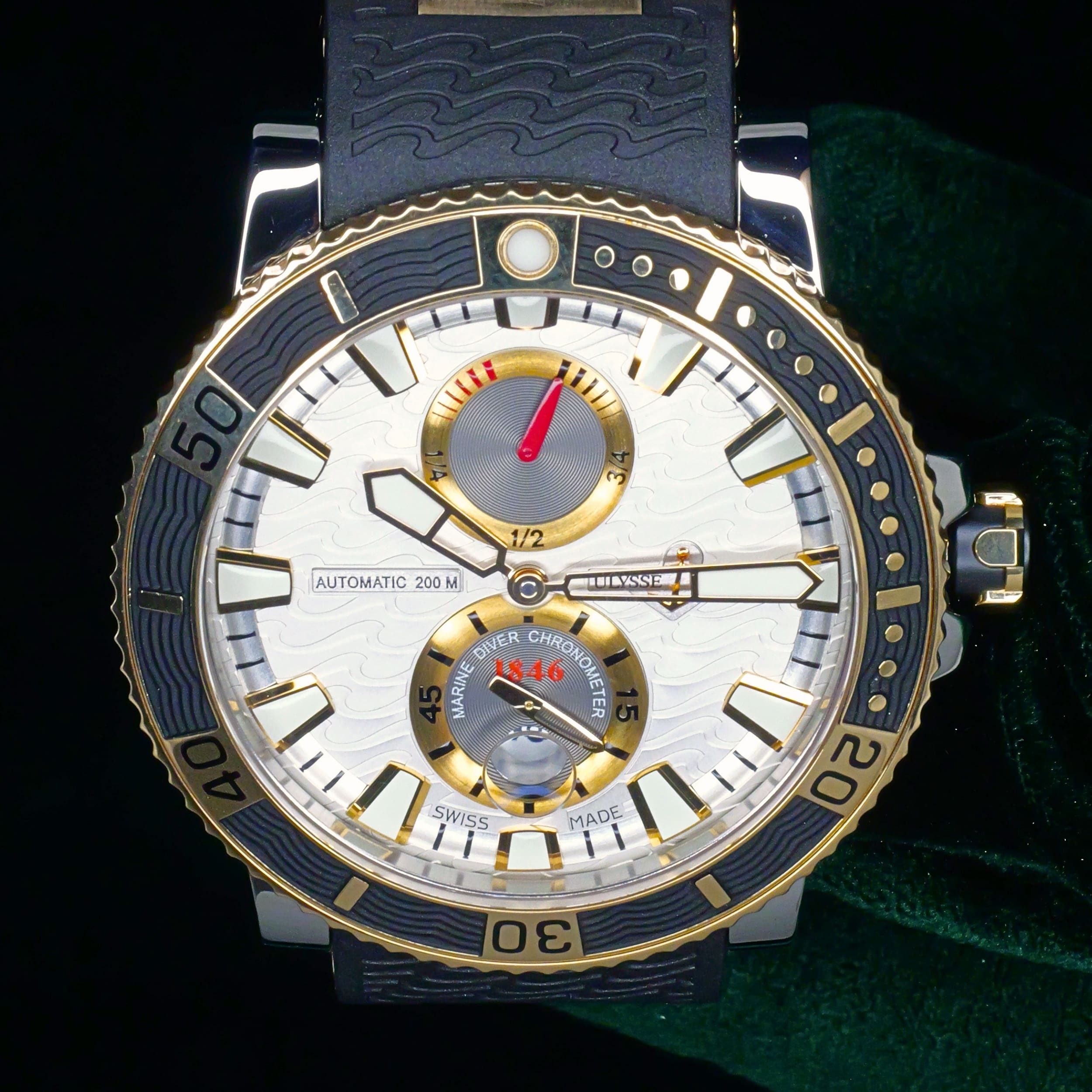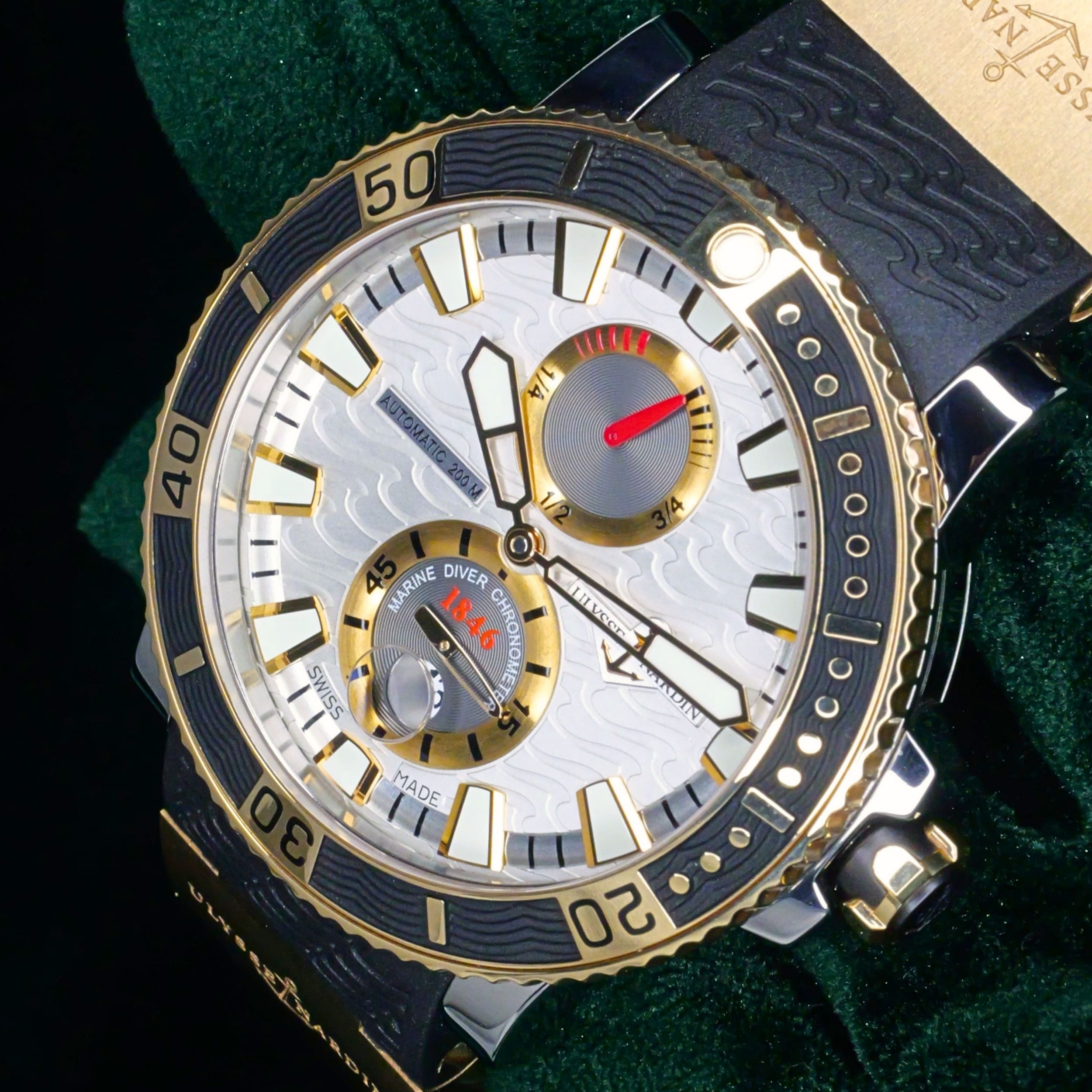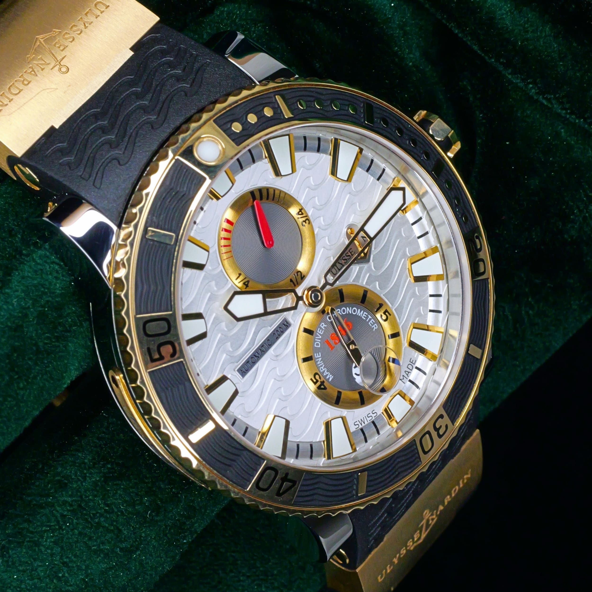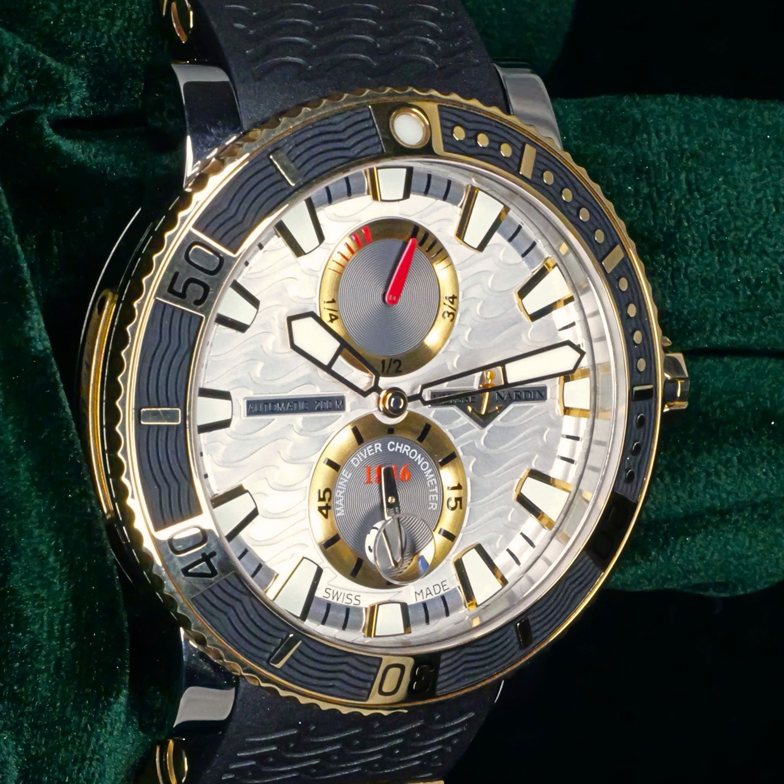 Built from a brand historically known for supplying marine chronometers to naval forces, this Maxi Marine Diver carries that legacy forward with a modern dive-ready design. Its silver wave dial and two-tone construction bring together function and presence in a way that feels both purposeful and distinct.