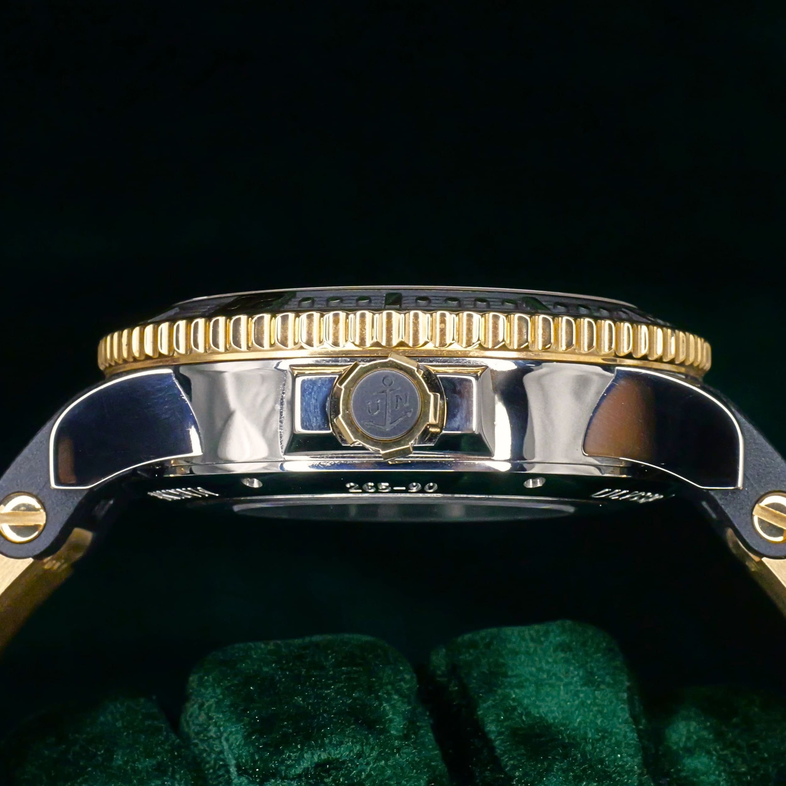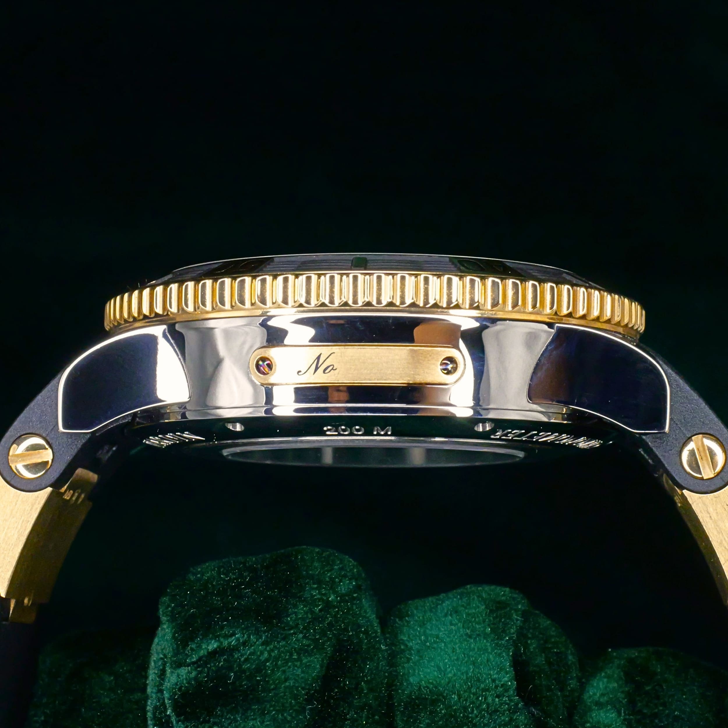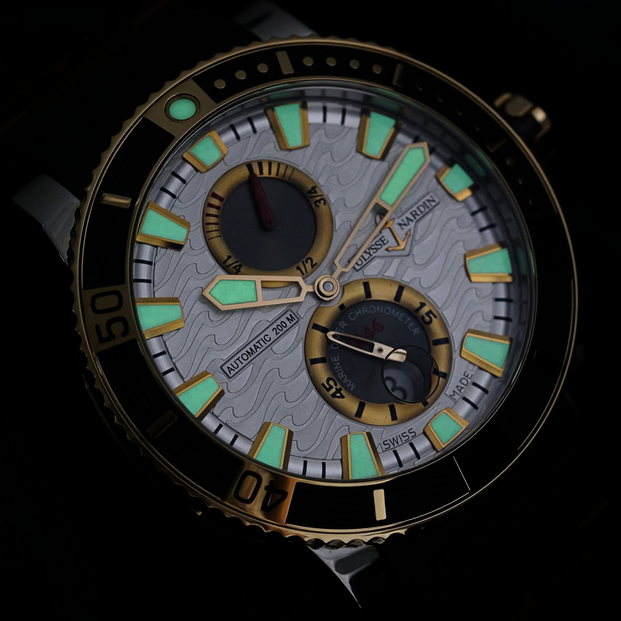 Functions include hours, minutes, small seconds, date, power reserve indicator, and dive timing bezel. The screw-down crown winds the movement, allows for quick date adjustment, and sets the time when pulled to its outermost position. The power reserve indicator at twelve o’clock tracks the remaining energy of the movement, while the small seconds subdial at six o’clock integrates the date display. The unidirectional rotating bezel can be adjusted counterclockwise to track elapsed time for diving or everyday use. Lume produces a strong glow in low-light conditions, enhancing both legibility and overall presence.