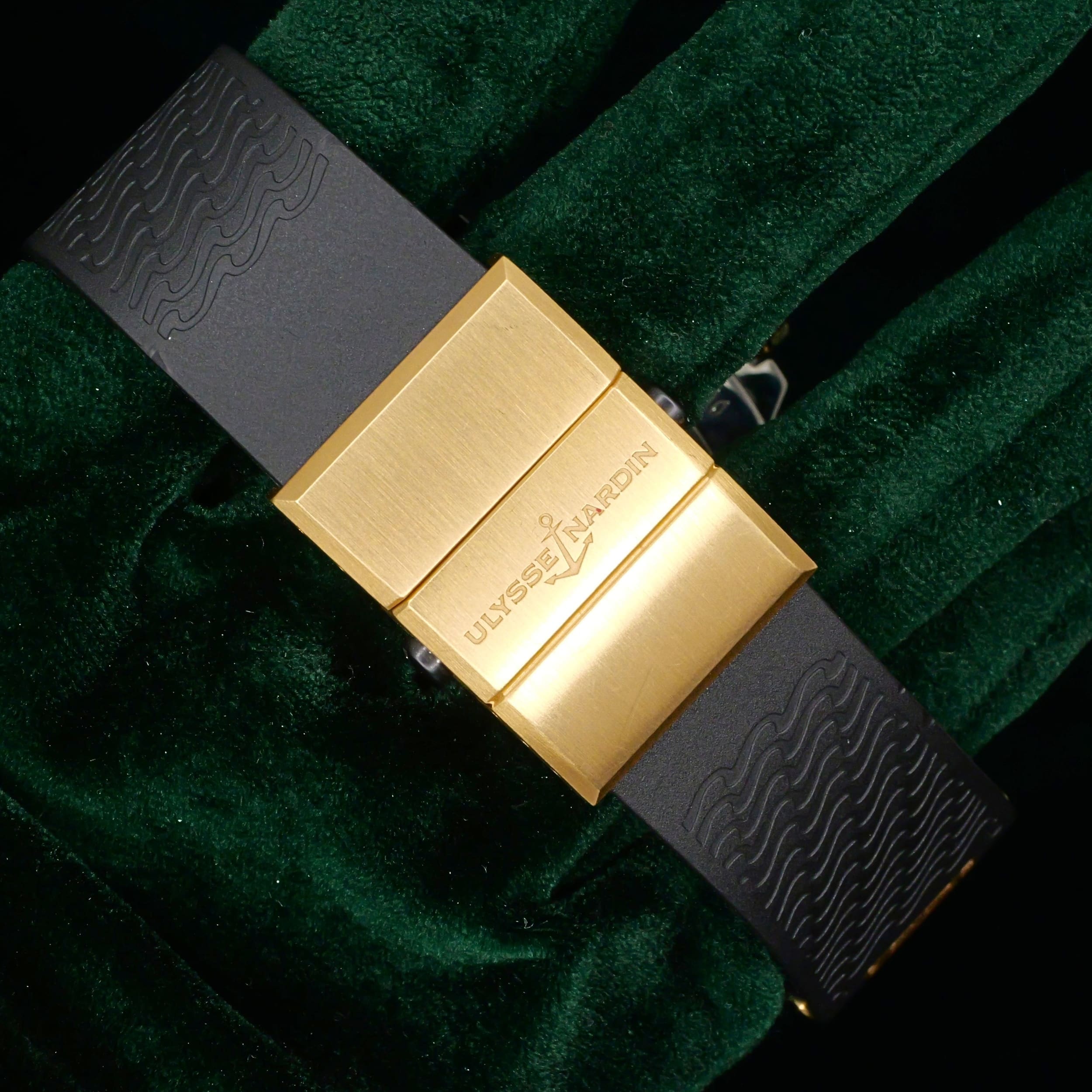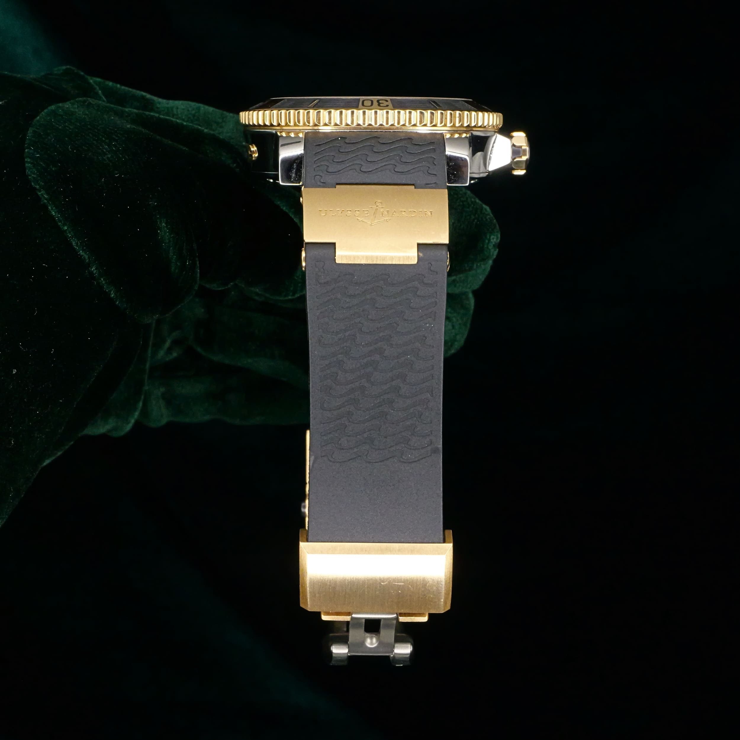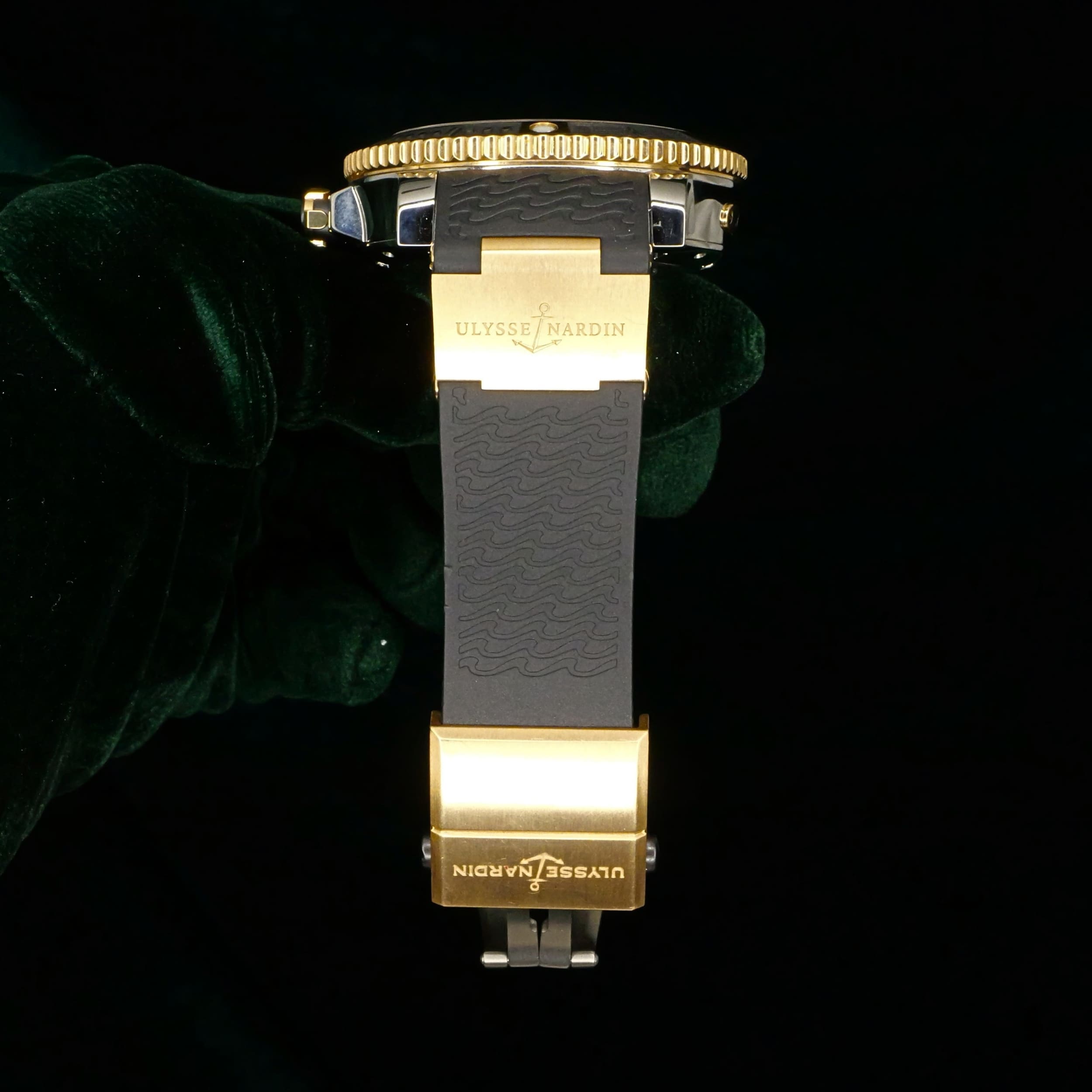 Presents itself in near mint condition with some signs of wear. The silver wave-pattern dial delivers a textured, ocean-inspired surface that reflects light with a soft metallic sheen. The unidirectional rotating bezel features a black framed in gold, creating a strong contrast that enhances the visual appeal. The stainless steel case is finished with a combination of polished and brushed surfaces, allowing light to reflect dynamically across the watch.