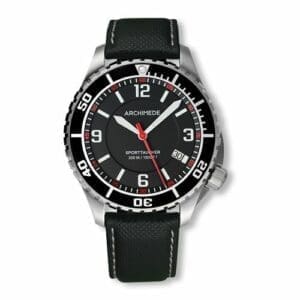 This watch is powered by a Swiss Made SW 200-1 automatic movement, which offers high precision and reliability. The solid crafted three-piece case with sapphire crystal is made from finely brushed stainless steel finished by Ickler. This specific SportTaucher has a black dial and is fitted a black leather strap.