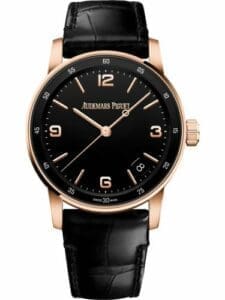 The Audemars Piguet CODE 11.59 collection was introduced at SIHH 2019. Available in a number of configurations, all of the watches in this line feature a distinct case design with an octagonal mid-case sandwiched between a round top and back, paired with hollowed-out lugs.The CODE 11.59 ref. 15210OR.OO.A002CR.01 features a red gold case and a black dial. It is powered by caliber AP 4302.