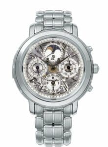 The Jules Audemars is a gentleman’s watch with perpetual calendar, minute repeater, split seconds chronograph, moon phase and small seconds – earning it the ‘Grande Complication’ moniker.Reference 26023PT.OO.1138PT.01 has a platinum case and a sapphire dial, allowing for a view of the movement from the front as well as the back. It is fitted with a flush-fit platinum bracelet.
