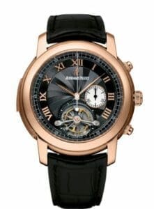The Audemars Piguet Jules Audemars Tourbillon Chronograph ref. 26050OR.OO.D002CR.01 has a pink gold case and a black dial, though arguably its main asset is the hand-wound caliber AP 2874 with minute repeater, tourbillon escapement and chronograph.
