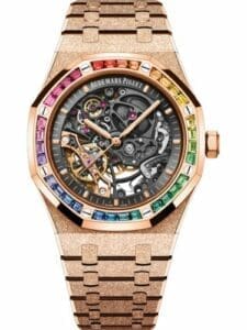 The Royal Oak 15412OR.YG.1224OR.01 was introduced in 2021. This Royal Oak has a Pink Gold case with frosted finish and rainbow-set bezel, which houses the self-winding caliber AP 3132 with double balance wheel.
