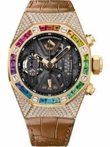 The Audemars Piguet Royal Oak Concept Tourbillon reference [WTCH_REF] is a limited edition of 5 pieces. It features a yellow gold case set with brilliant-cut diamonds and “rainbow colored” baguette-cut sapphires..