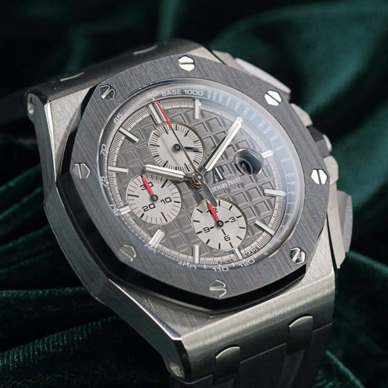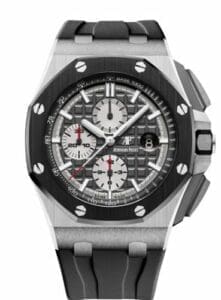 The Audemars Piguet Royal Oak Offshore 26400IO.OO.A004CA.01 has a titanium case which is crowned by a ceramic bezel. The dial is slate grey with “Méga Tapisserie” pattern and rhodium-toned counters.