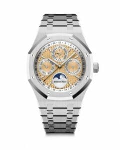 The Audemars Piguet Royal Oak Perpetual Calendar 26611PT.OO.1220PT.01 is a limited edition of 20 pieces created for Time Place of Indonesia on the occasion of the retailer’s 20th anniversary. It features a platinum case and a pink (‘salmon’) dial.