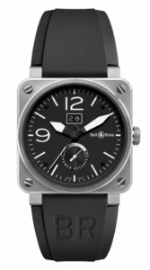 To create the BR 03 aviation watch, the Bell & Ross designers took their inspiration from aeronautical instrumentation, the ultimate reference point for legibility and reliability. Available in a variety of models, the BR 03 Instrument watch is no longer exclusively reserved for pilots. It has become an iconic watch to the great delight of watch collectors.The present example features a stainless steel case, black dial with oversized Arabic numerals and a rubber strap. This model is fitted with a big date display and a power reserve indicator.Reference BR0390-BL-ST