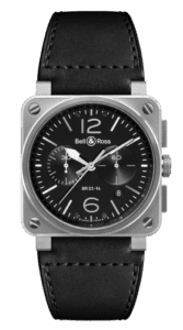 An aviation watch designed for professionals, the BR 03 with its 42 mm diameter is a genuine alternative to the 46 mm diameter BR 01. Its size as well as its finishes and functions complement the BR 01./p>The present example features a stainless steel case, a black dial with over-sized Arabic numeralsand a black leather strap.Reference BR0394-BL-SI/SCA