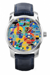 The Bereve Numbers A1.BV02.02.X.W1 has a stainless steel case and a champlevé grand feu enamel dial with Ugo Nespolo’s opera “Numbers” on a silver base.