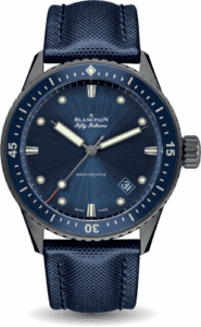 The Blancpain Fifty Fathoms Bathyscaphe in grey ceramic was introduced in 2016. The case measures 43.6mm across at a height of 13.8, housing the self-winding caliber 1315. Both dial and bezel, the latter in ceramic with LiquidMetal indexes, are blue.This version is fitted with a blue sailing strap.
