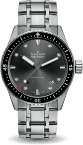 The Blancpain Fifty Fathoms Bathyscaphe was introduced in 2013, as a reinterpretation of the brand’s dive watch heritage in a highly technical yet classic design.The present Bathyscaphe features a stainless steel case paired with a black ceramic bezel insert and a grey dial. It is fitted with a stainless steel bracelet. This configuration was added to the collection in 2014.