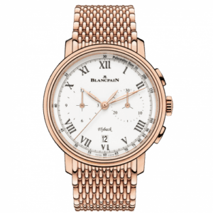 The Blancpain Villeret Chronographe Flyback Pulsomètre features a state-of-the-art high-beat chronograph movement paired with a traditional design in contemporary dimensions. It was one of the first Blancpain models to feature the all-new caliber F385 movement, which comprises 322 parts including a silicon balance spring. It is equipped with a vertical clutch as well as a chronograph mechanism controlled by a column wheel. It also features a flyback function enabling instant chronograph resetting and restarting simply by pressing a pusher at 4 o’clock – a device that proves extremely useful when measuring successive time periods.Reference 6680F-3631-55B has a red gold case and a cambered grand feu enamel dial. It is fitted with a red gold bracelet.