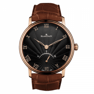 The Blancpain Villeret Ultraplate Seconde Rétrograde is an extra-thin gentleman’s watch. A subtle twist is given to the traditional and discrete look in the form of a retrograde small [30] seconds hand.Reference 6653-3630-55B has a red gold case and a black dial with guilloché finish.