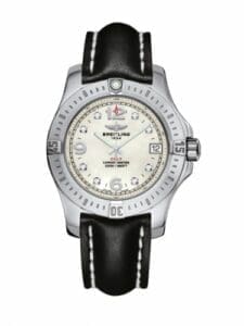 With its original lines and its 36 mm diameter designed to grace any wrist, the Colt ticks to ladies’ time, while maintaining its legendary sturdiness, functionality and readability. The black, blue or silver dials are complemented by two variations in natural mother-of-pearl, one of them enhanced with diamond hour-markers. All versions are available with an optional diamond-set bezel. An authentic Breitling in the feminine mode – for all women wishing to combine elegance with performance.Reference A7438911.A771 has a mother-of-pearl dial with a mix of Arabic numerals and diamond-set hour markers.