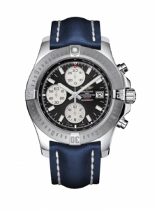 Equipped with Breitling’s well-known B13 movement, the Colt Chronograph Automatic reinterprets all the key assets of the Colt collection, which is born for action, feats and thrills. The 44 mm-diameter polished steel case is water-resistant to 200 m (660 ft) and fitted with a large screw-locked crown complete with protective reinforcements. The black, blue or silver dials are enlivened by a fine circular raised motif, while their readability is reinforced by oversized hands and hour-markers, enhanced by a luminescent coating. Reference A1338811|BD83 has a Volcano Black dial with silver subdials.