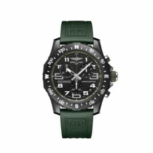 Introduced in 2020, the Breitling Pro Endurance pairs an ultra-light titapast (‘Breitlight’) case with a SuperQuartz chronograph movement (caliber B82). Reference X82310D31B1S1 has a green strap and matching accents on the dial. This version debuted in 2022.