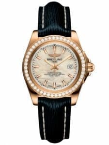 Breitling combines style with performance in a distinctive ladies’ model interpreted in many different guises. With a bezel in tungsten carbide, an ultra-hard, scratch-resistant high-tech material. With a gold and / or diamond-set bezel. With luminescent applied hour-markers or diamond hour-markers. In steel, steel & gold or all-gold versions. Not forgetting a choice of dials (natural mother-of-pearl, blue, black or champagne) and various types of straps / bracelets. The sturdy case water-resistant to 100 m (330 ft) houses a SuperQuartz™ movement ten times more precise than standard quartz.Reference H7133053|A802 has a rose gold case with diamond-set bezel and a mother-of-pearl dial.