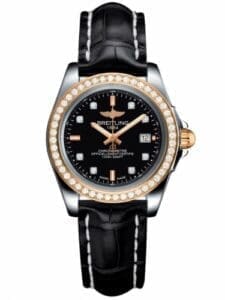 Breitling combines style with performance in a distinctive ladies’ model interpreted in many different guises. With a bezel in tungsten carbide, an ultra-hard, scratch-resistant high-tech material. With a gold and / or diamond-set bezel. With luminescent applied hour-markers or diamond hour-markers. In steel, steel & gold or all-gold versions. Not forgetting a choice of dials (natural mother-of-pearl, blue, black or champagne) and various types of straps / bracelets. The sturdy case water-resistant to 100 m (330 ft) houses a SuperQuartz™ movement ten times more precise than standard quartz.Reference C7133053|BF64 has a stainless steel case with a rose gold diamond-set bezel, paired with a Trophy Black dial.